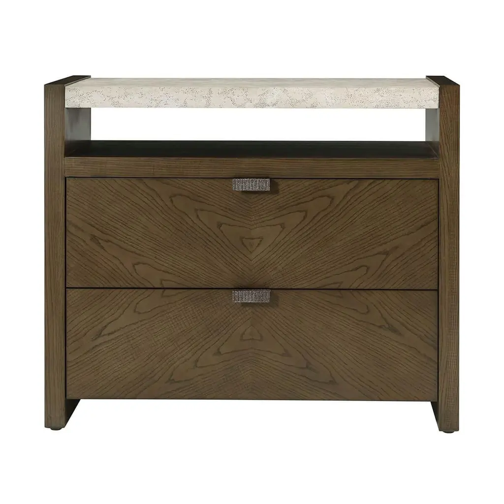 a handsome bedside nightstand in figured cathedral ash in a dark Earth finish with metal pulls in our Ember finish and soft close drawers.The top of this nightstand is done in our exclusive Mineral finish. It is perfect for storing your bedroom necessities both in and out of sight.Dimensions: 36" W x 19" D x 30" H