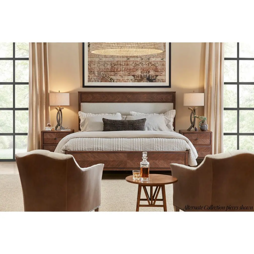 Crafted with a striking herringbone parquetry pattern across its surfaces, this piece features two drawers for discreet storage. Each drawer is adorned with Verde Bronze finished handles, offering a subtle contrast to the warmth of the oak. Tapered legs add a light, elegant silhouette while enhancing the modern rustic aesthetic.Finished in darker dusk tone, this nightstand blends beautifully into both transitional and contemporary spaces. Whether used alone or as a pair, it brings craftsmanship and character to any bedside.Dimensions: 36" W x 19.5" D x 28" H