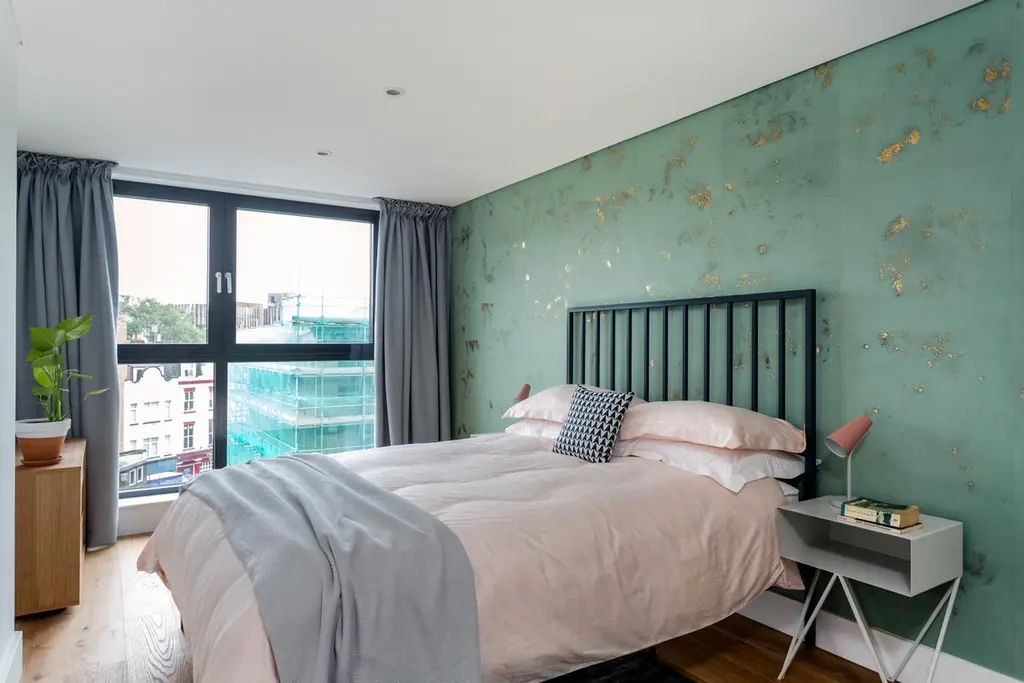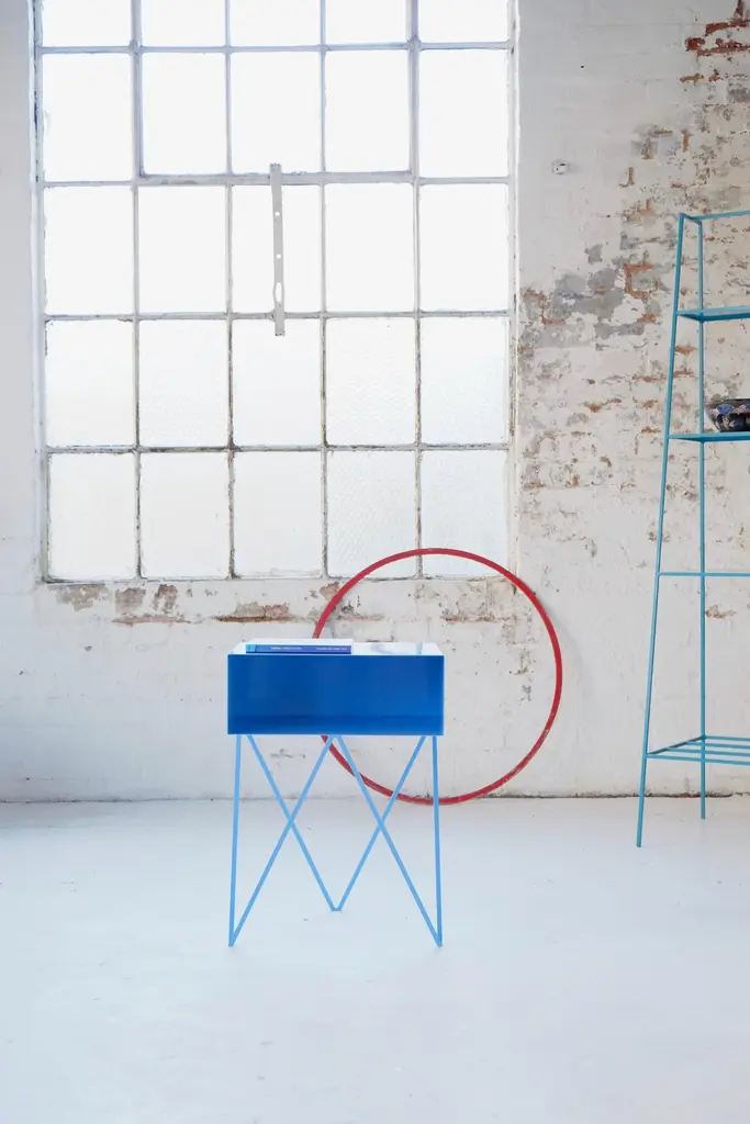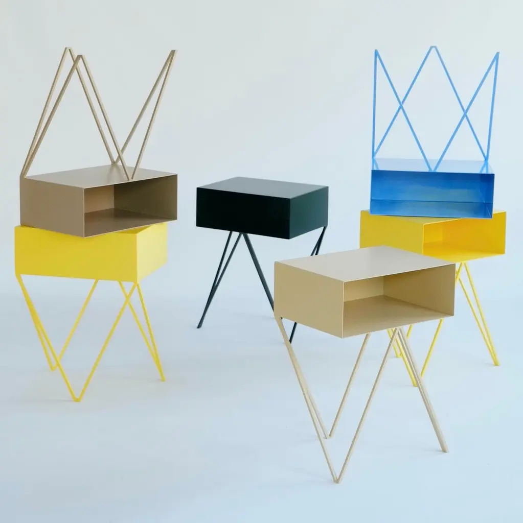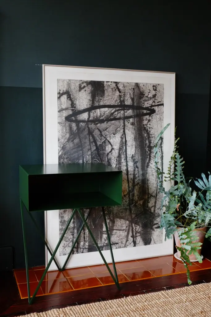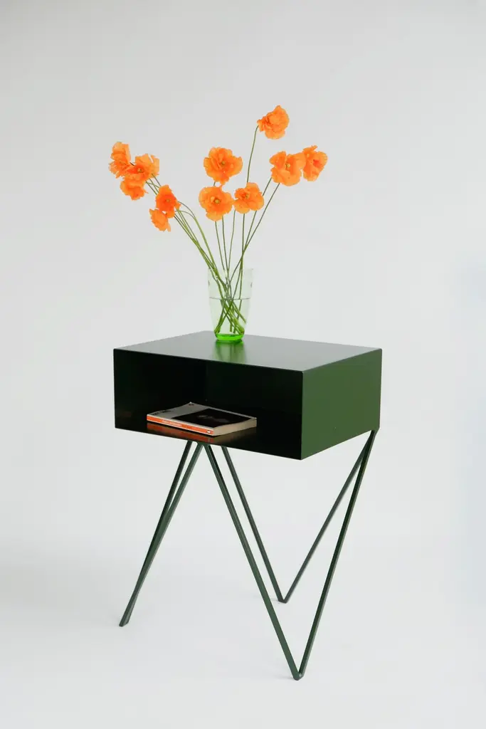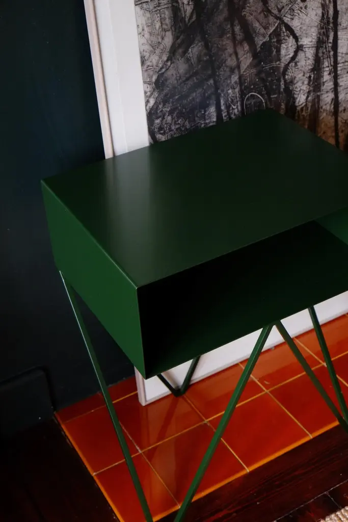 A pair of deep green Robot bedside tables. The side table features an open shelf on zig zag legs. A fun and functional design made of solid steel, powder-coated in deep green. The clean lines look great against period details as well as in modern spaces. Perfect as a bedside table. Available in fifteen colours. This price is for one pair. Colour samples available to order from our storefront - LU2894331610202 &New is an award-winning design company, manufacturing in the UK. Distinctly modern with elegant lines, &New's core steel furniture collection is recognizable by its minimal powder-coated form. The airy designs combine an aesthetic of British wit and Nordic simplicity. All &New products are manufactured in Britain in small batches. They have plenty of character as every weld is different. The result is a collection of furniture that celebrates those little imperfections that make objects beautiful.Measurements: approximate 45cm wide, 33cm deep, 60.5cm high. 17cm high inside the shelf. Bespoke sizes and colours available. Worldwide delivery available.Mirka and Jo &New Modern British FurnitureZig-zag-legs/ Registered design. Community design registration number: 002391813-0001.
