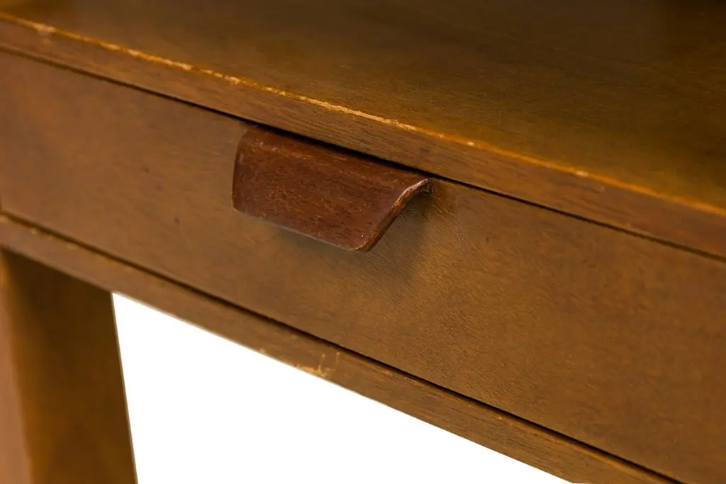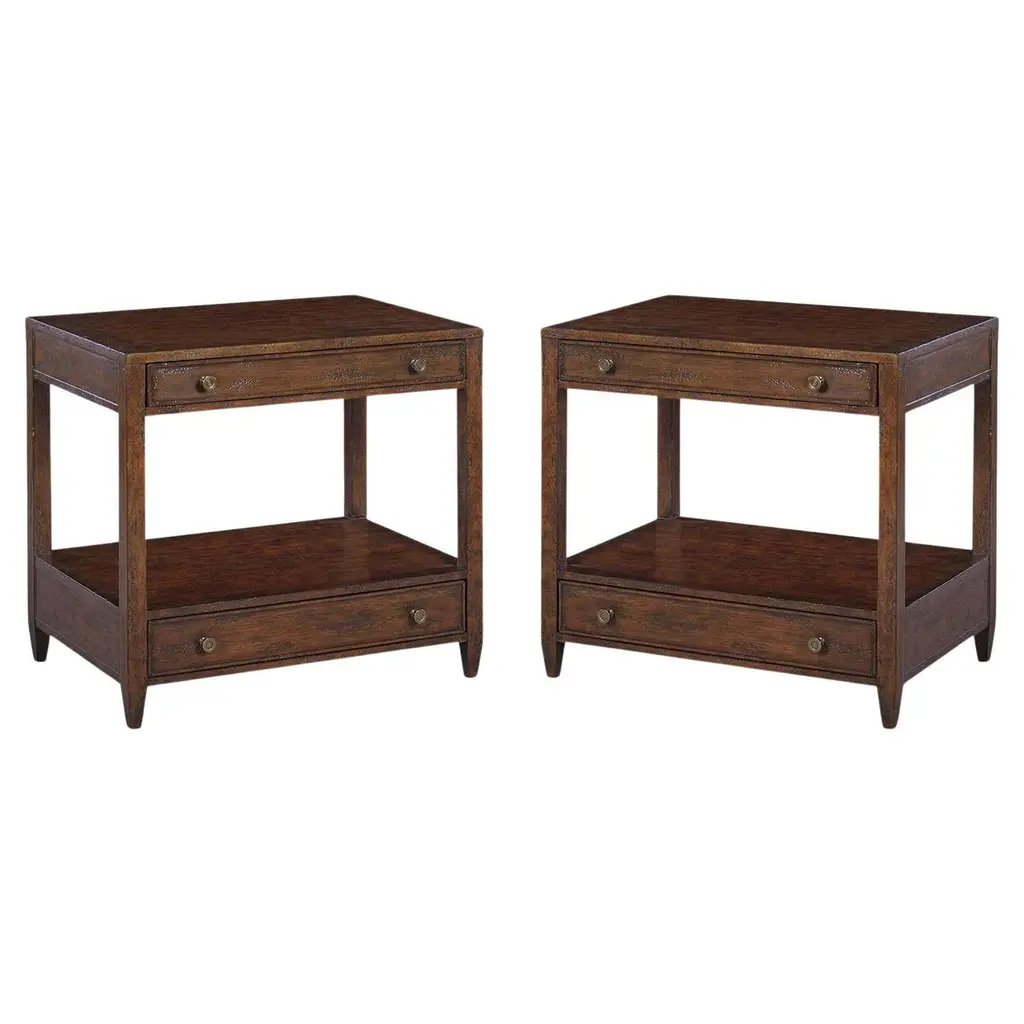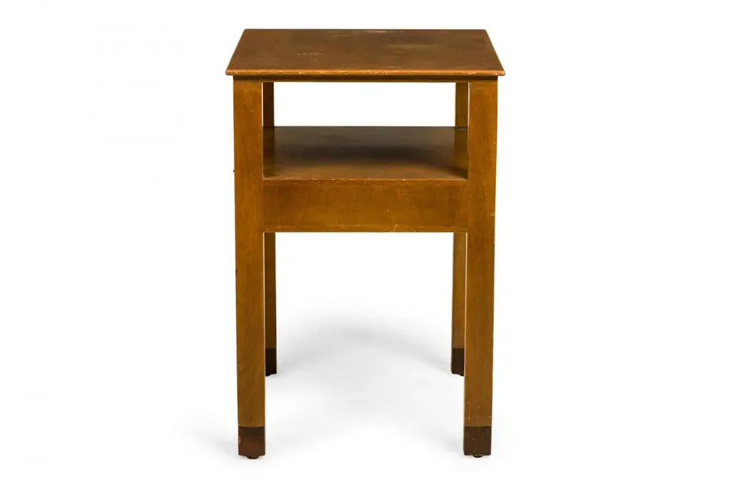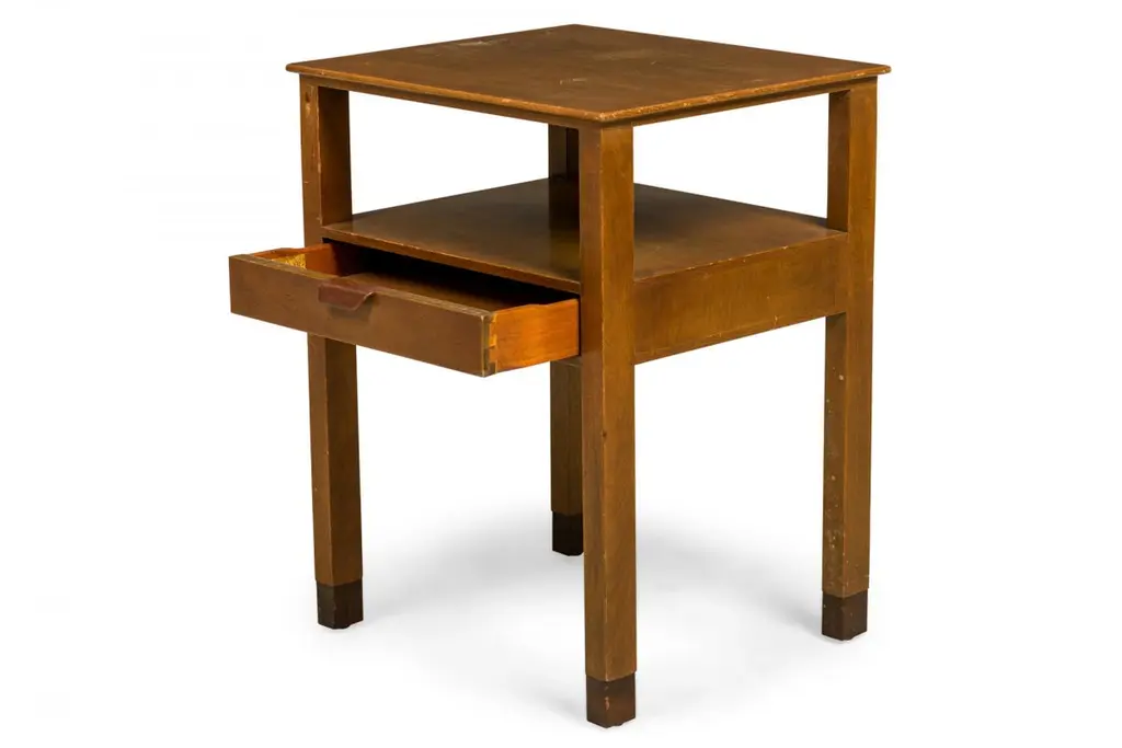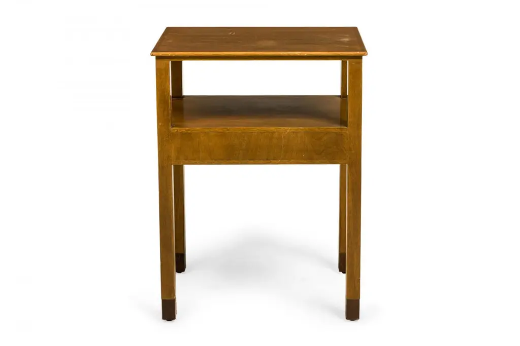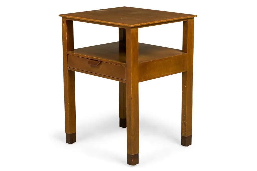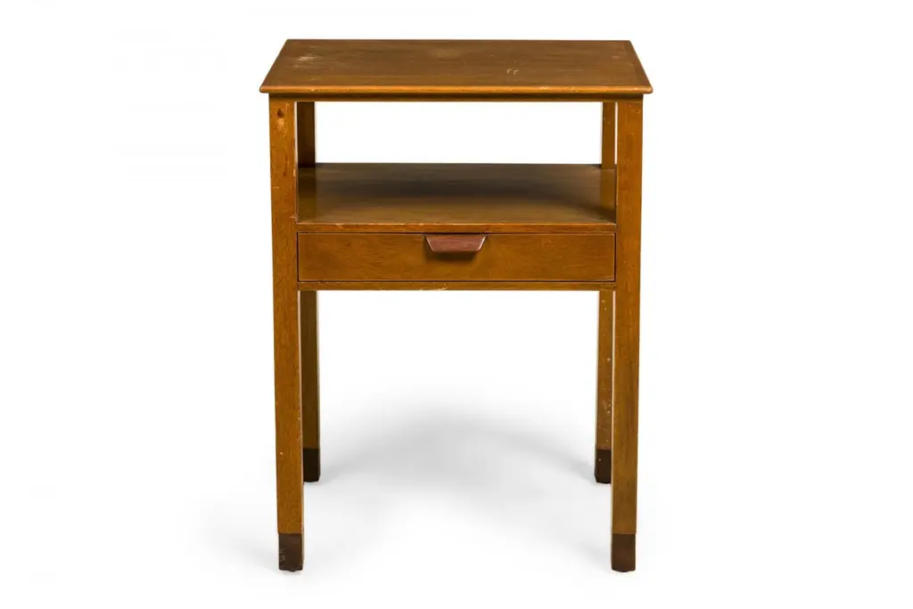 Pair of American Mid-Century wooden nightstands with a single drawer. (EDWARD WORMLEY FOR DUNBAR)(PRICED AS Pair)Wear to finish.