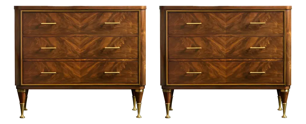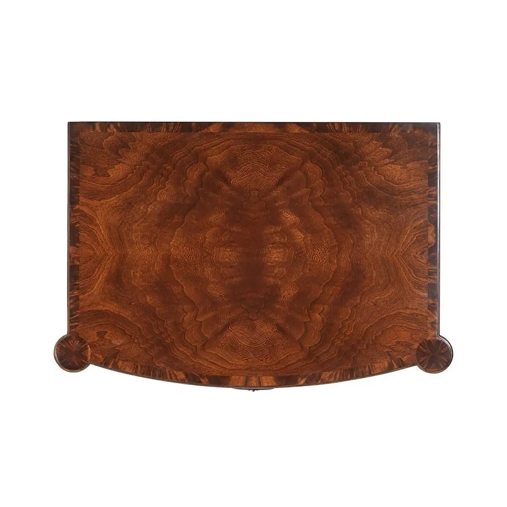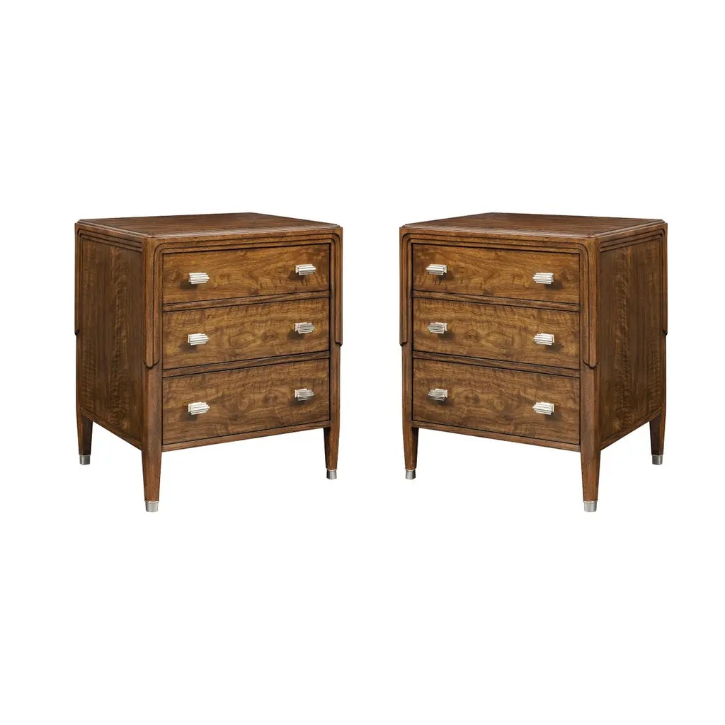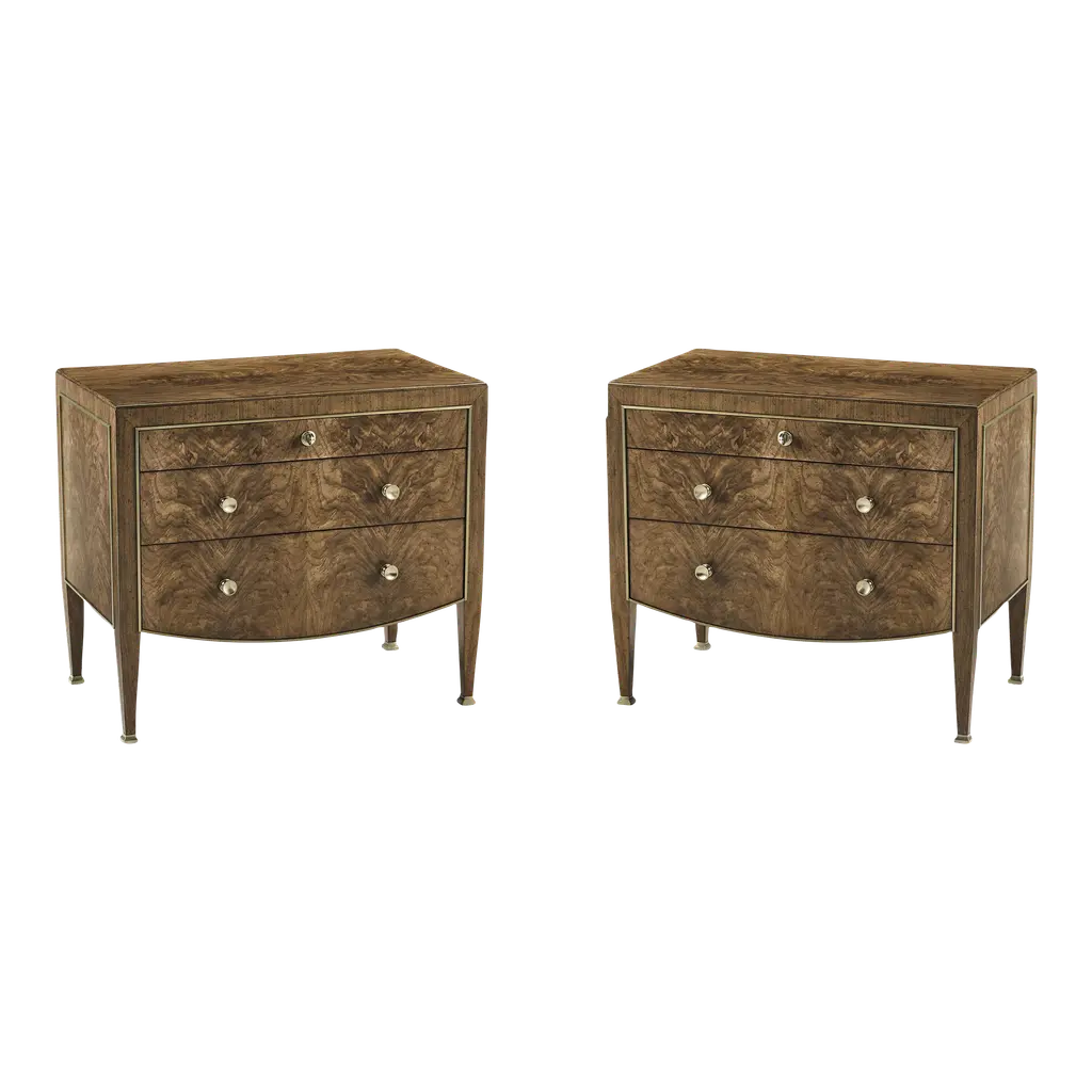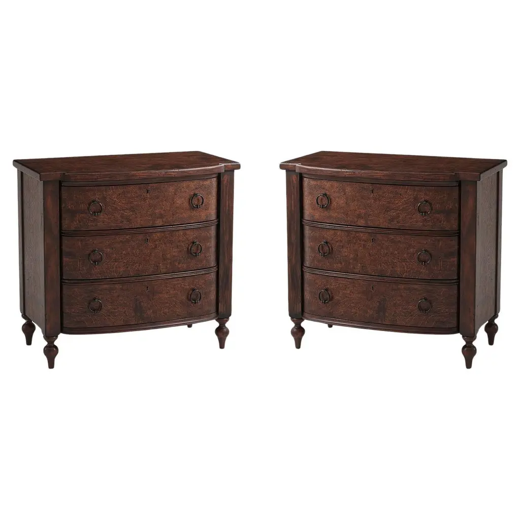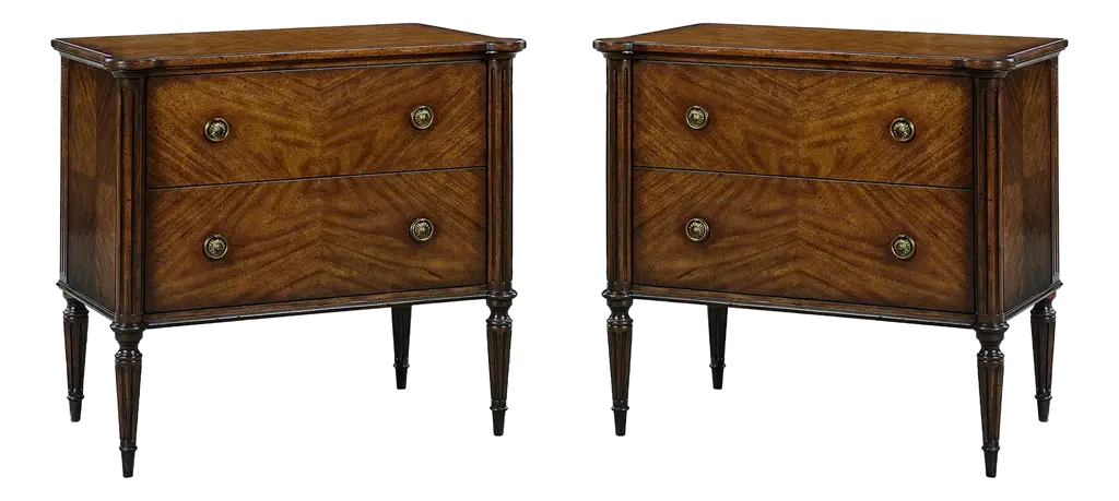 A mahogany and figured mahogany nightstand, the reeded edge bowfront top with protruding corners with leaf carved and reeded uprights, with three graduated drawers with verdigris brass handles, raised on turned legs. Inspired by a Federal Period original.Dimensions: 30" W x 20" D x 30" H.