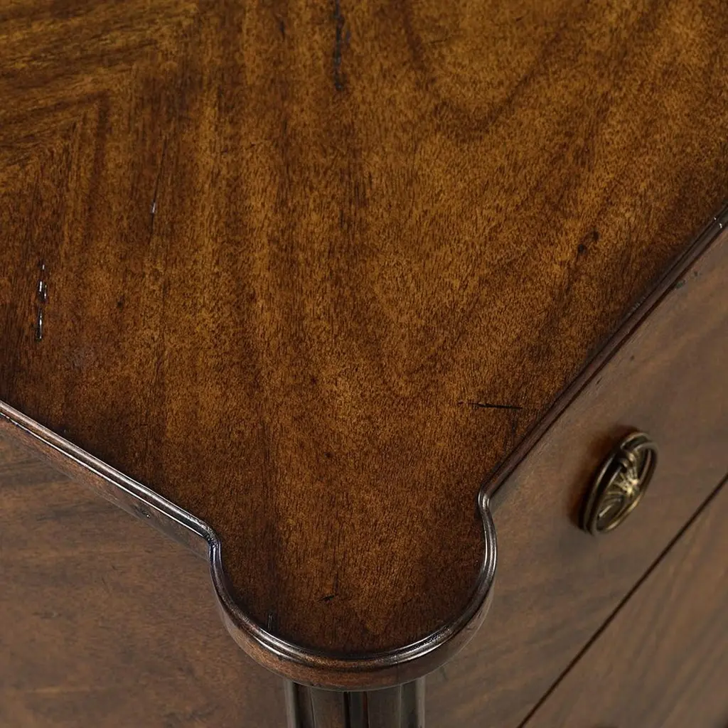 The nightstand captures the essence of neoclassical elegance in a compact and versatile form. Expertly crafted with a rich mahogany finish, this two-drawer chest showcases classic fluted, tapered legs, bookmatched drawer fronts, and traditional brass ring pulls. Behind its graceful symmetry lies a subtle surprise—a hidden secret drawer designed for discreet storage.Perfect as a nightstand or accent chest, this piece brings timeless sophistication to bedrooms, hallways, or living spaces. Its balanced proportions and refined detailing evoke the grandeur of 18th-century France while remaining effortlessly functional for modern living.Dimensions: 32" W x 19" D x 30" H