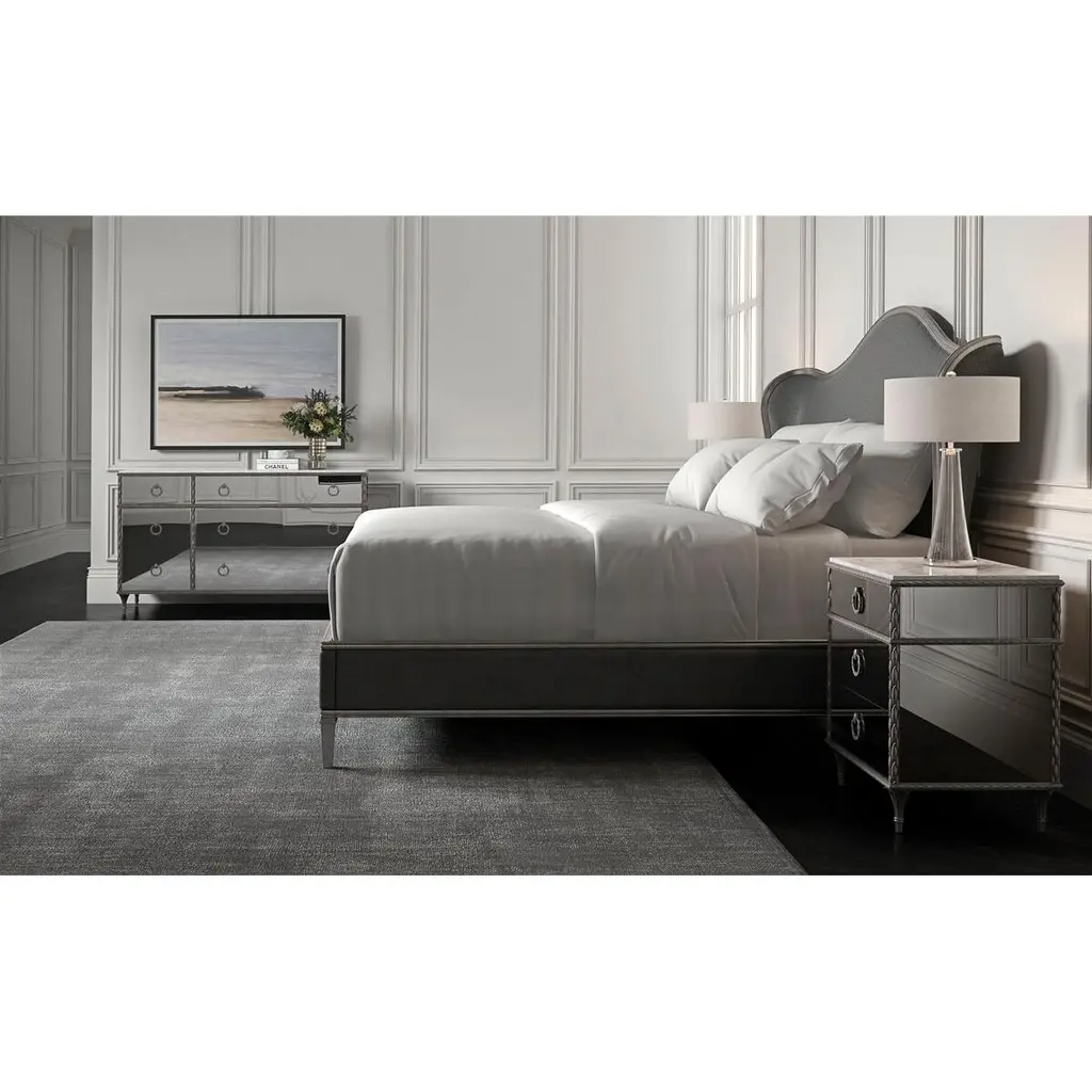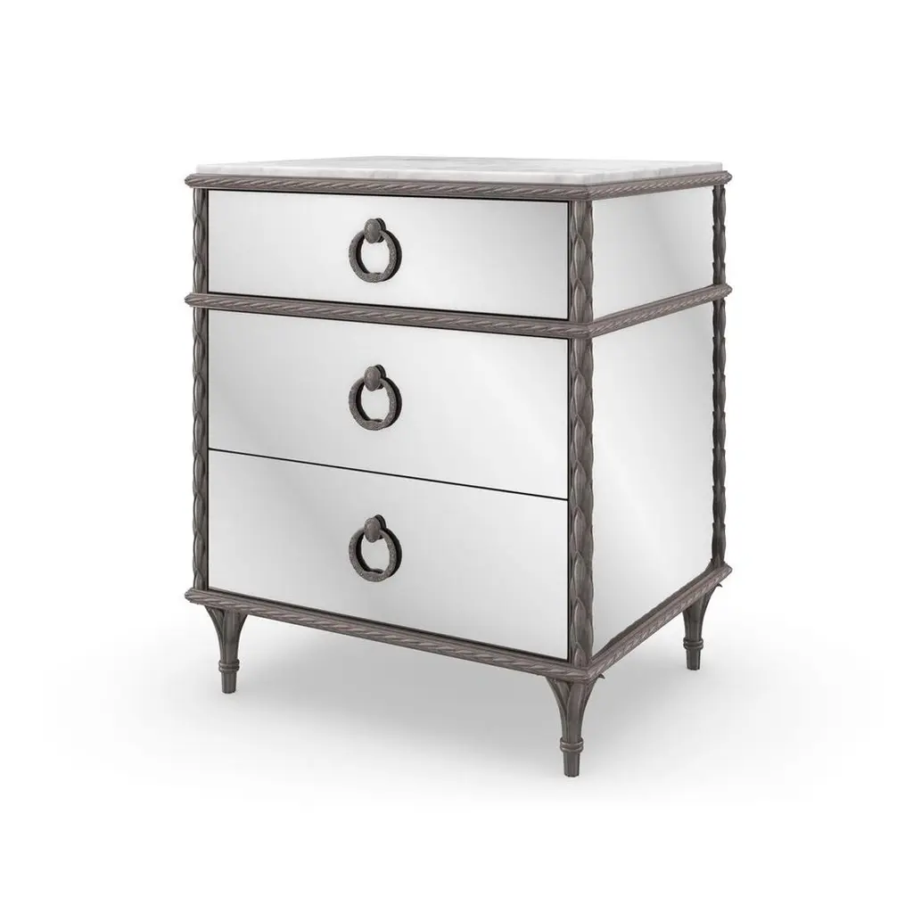 This exquisite nightstand features mirrored front and end panels that reflect light beautifully, adding a touch of glamour and spaciousness to any room.Standing on cast aluminum legs with intricate cast moldings finished in a sophisticated Sea Smoke Leaf, the nightstand combines traditional craftsmanship with modern flair. The top is adorned with a ¾-inch thick Carrara white marble, renowned for its pristine quality and stunning natural patterns, offering a durable and luxurious surface for your bedside essentials.With three spacious drawers, each equipped with undermount soft-close drawer guides that ensure a smooth and silent operation. The interiors of the drawers are finished in Crème De La Crème, providing a subtle contrast and a hint of richness to the overall design.Dimensions: 24" W x 19" D x 28" H