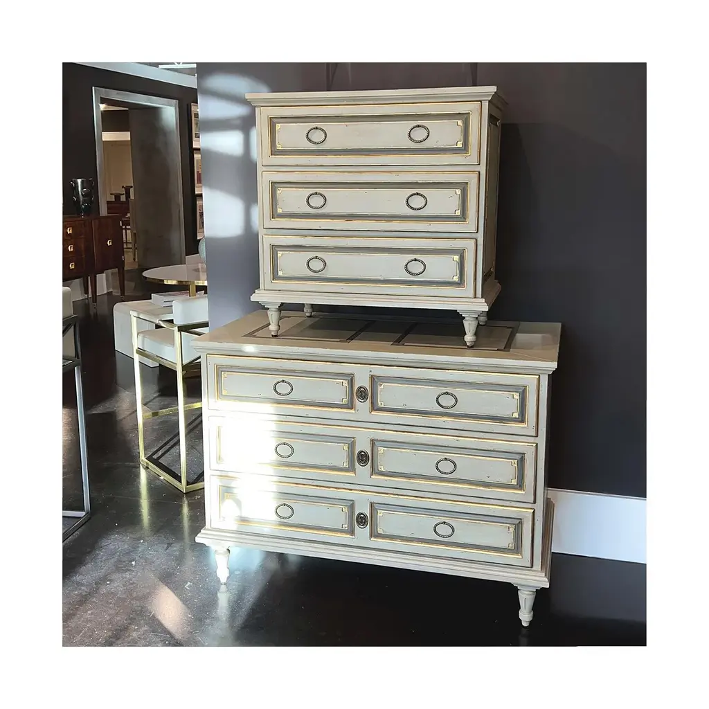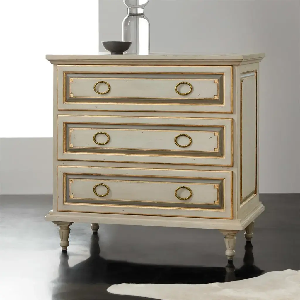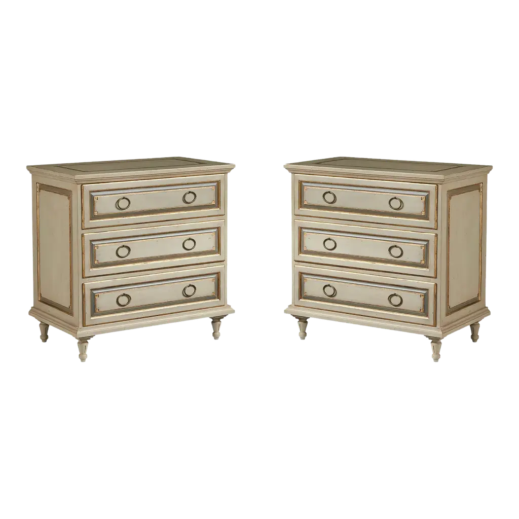Pair of French Provincial Painted Nightstands. This French Directoire style provincial bedside commode has an antiqued hand-painted finish with a rectangular molded top above three long paneled drawers with gilded trim, with paneled sides also with gilded trim, and raised on turned, fluted, and tapered legs. The drawers are fitted with antiqued brass hardware. Dimensions: 32" W x 19" D x 32" H