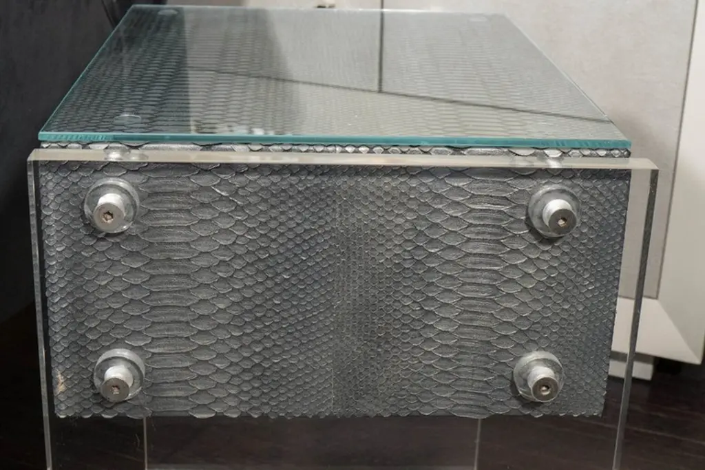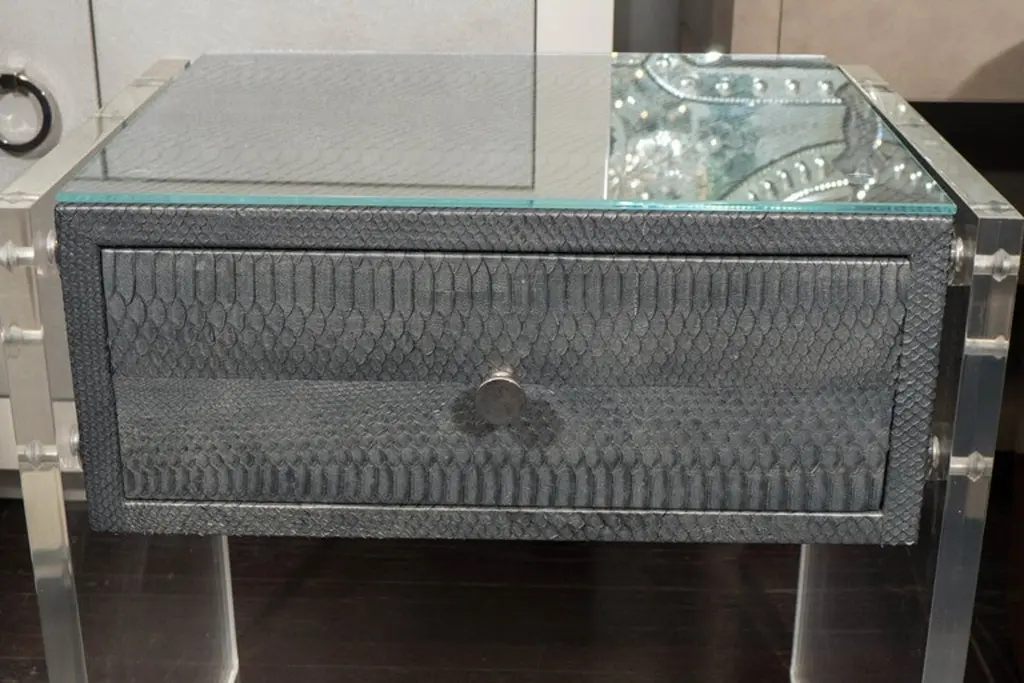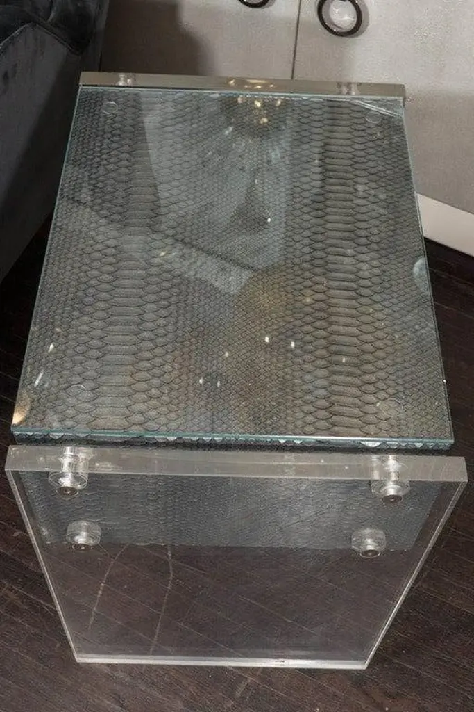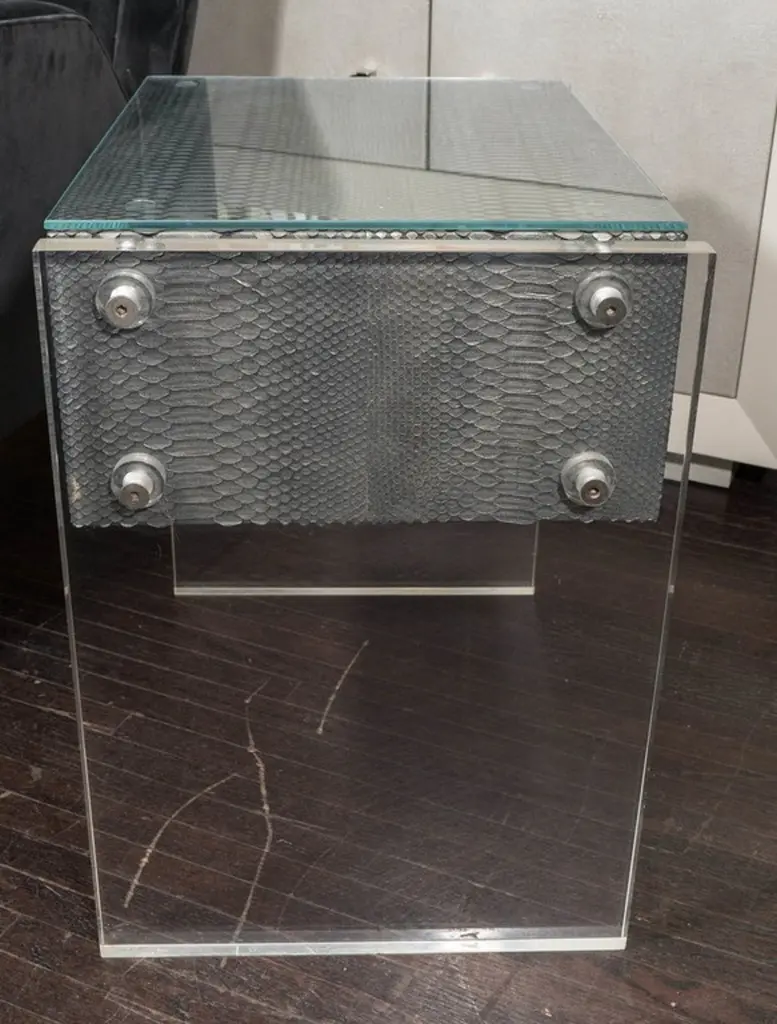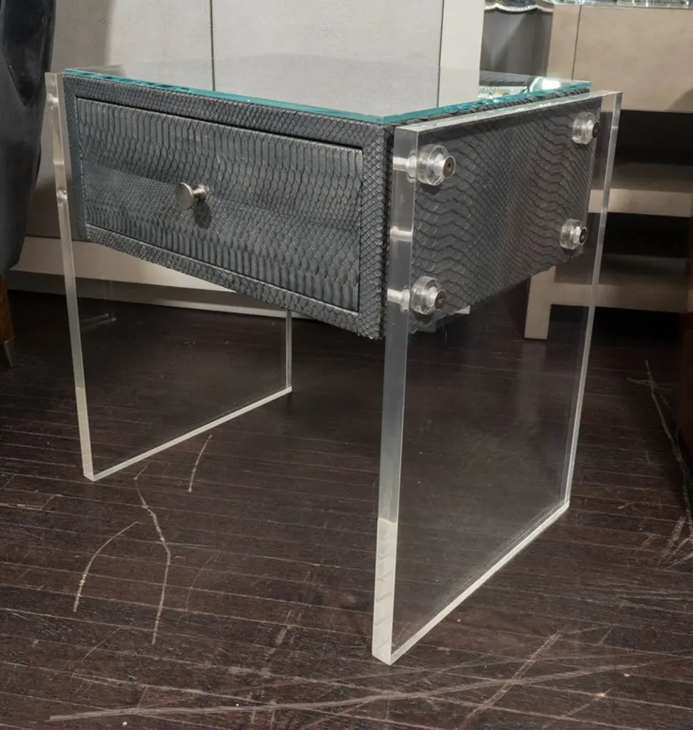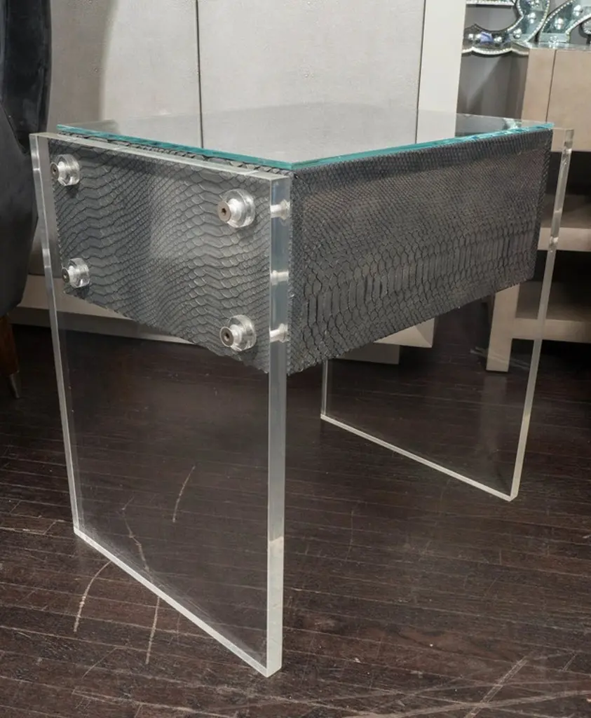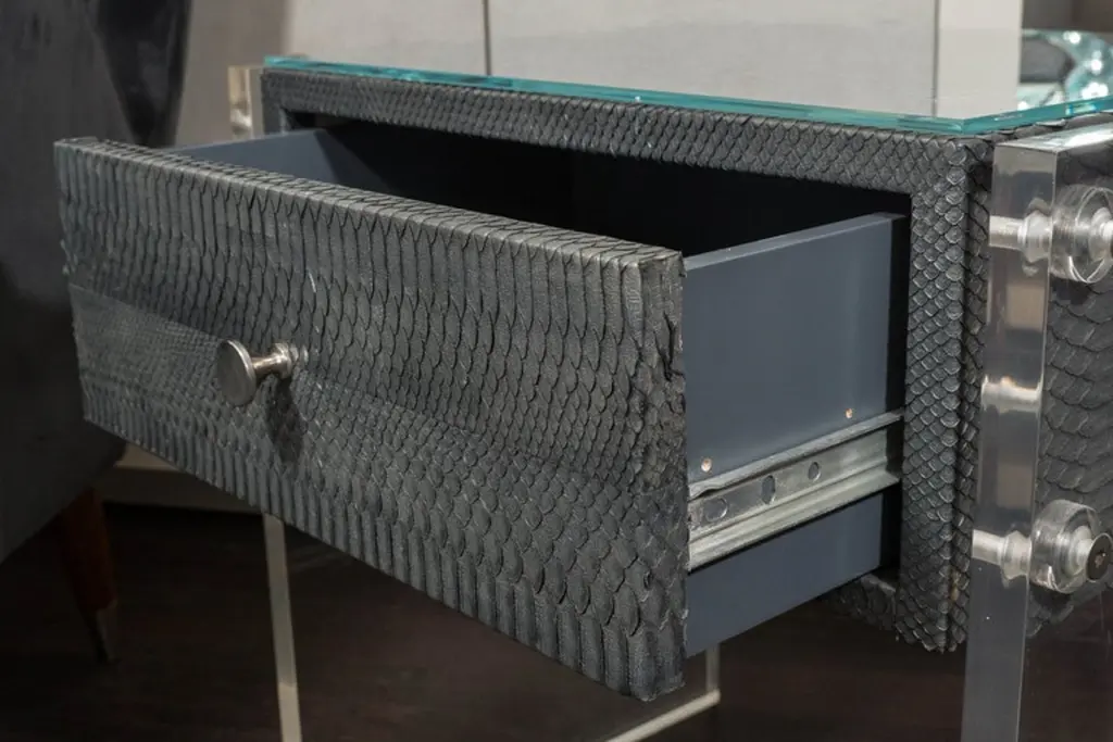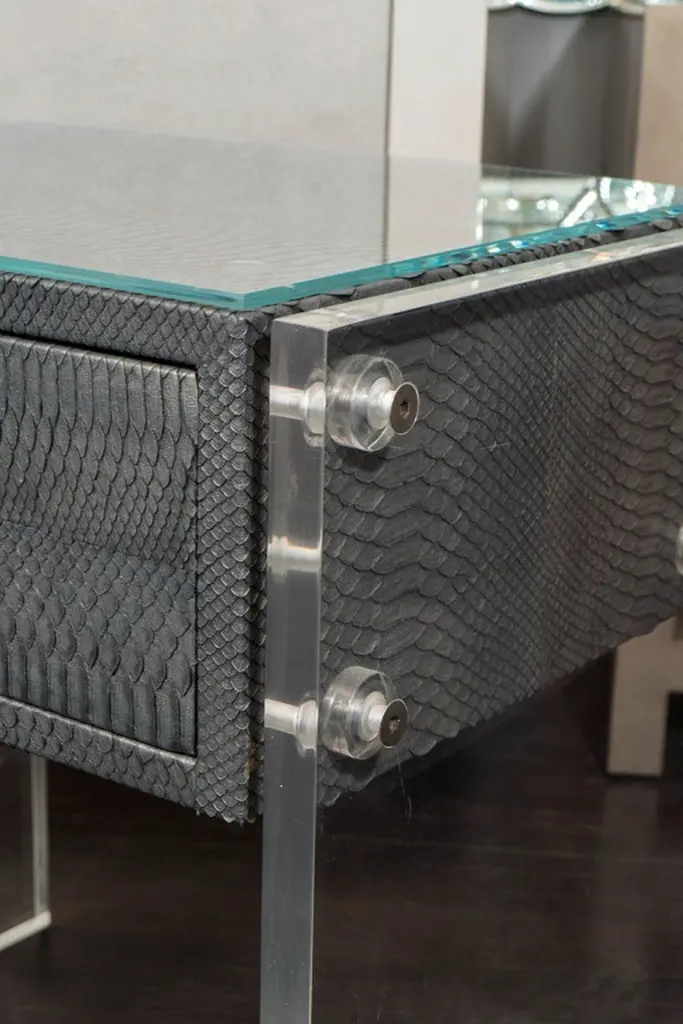 Custom pair of gunmetal gray python nightstands with Lucite side panels. Customization is available in different sizes, and colors.