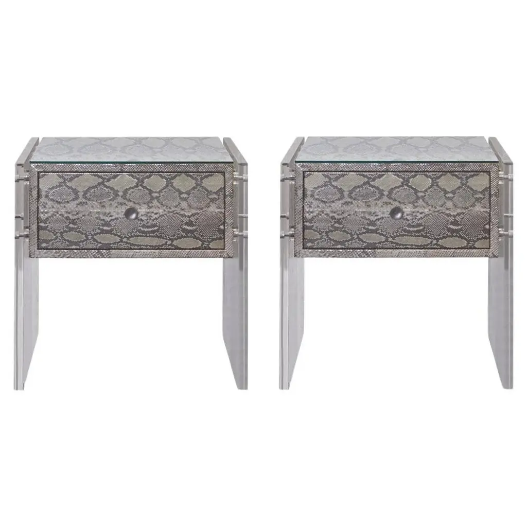 Pair Of Gunmetal Gray Python Nightstands With Lucite Side Panels