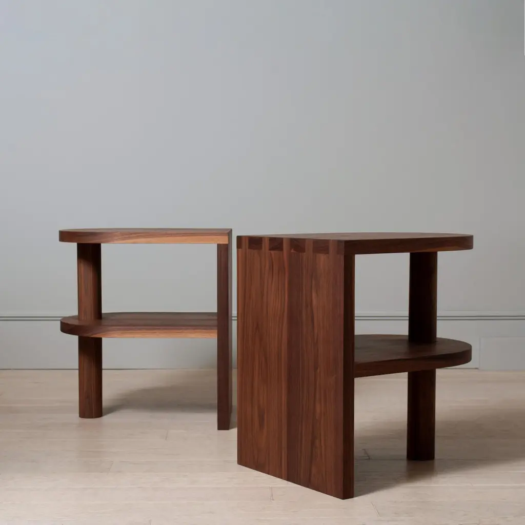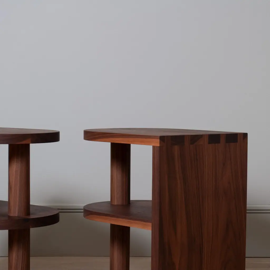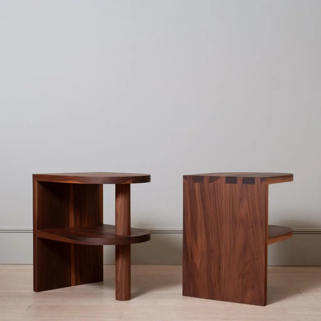 Handcrafted architectural American black walnut nightstands. Designed at Sum furniture and handcrafted using traditional furniture making techniques with the finest American Black Walnut. Hand-cut oversized dovetail jointing detail with a thick turned walnut upright pillar piercing through the sections reinforced internally with a steel bar. Designed to be multi functioning pieces that can also be used as nightstands, seating stools or end tables - scaled up larger versions for sofa/coffee tables. Inspired by Deco and early European Modernist architecture - these are very substantial, visibly bold and striking pieces of handmade furniture, built to last. Finished in durable natural oils.Alternative versions in quarter-sawn English oak can be seen in final images and in our other listings/storefront.Custom dimensions are available to order and quoted upon request.We design bold and distinctive pieces of furniture – our main objective is combining the design alongside the natural beauty and properties of the raw materials.These timbers and materials are very carefully chosen for each specific design - maintaining our focus on the benefits, visual impact and strengths of what we use. Our regular use of English Quartersawn Oak is one case in point. It has been the beloved timber of fine furniture makers across the world for centuries. It is costly to produce but gives huge benefits and rewards such as its striking medullary rays and superb stability qualities. By utilising these wonderful and naturally occurring features and timbers with our contemporary designs we aim to continue creating some very distinct, tactile and idiosyncratic pieces.These are all completely handmade, in very small numbers, by our skilled craftspeople in England.