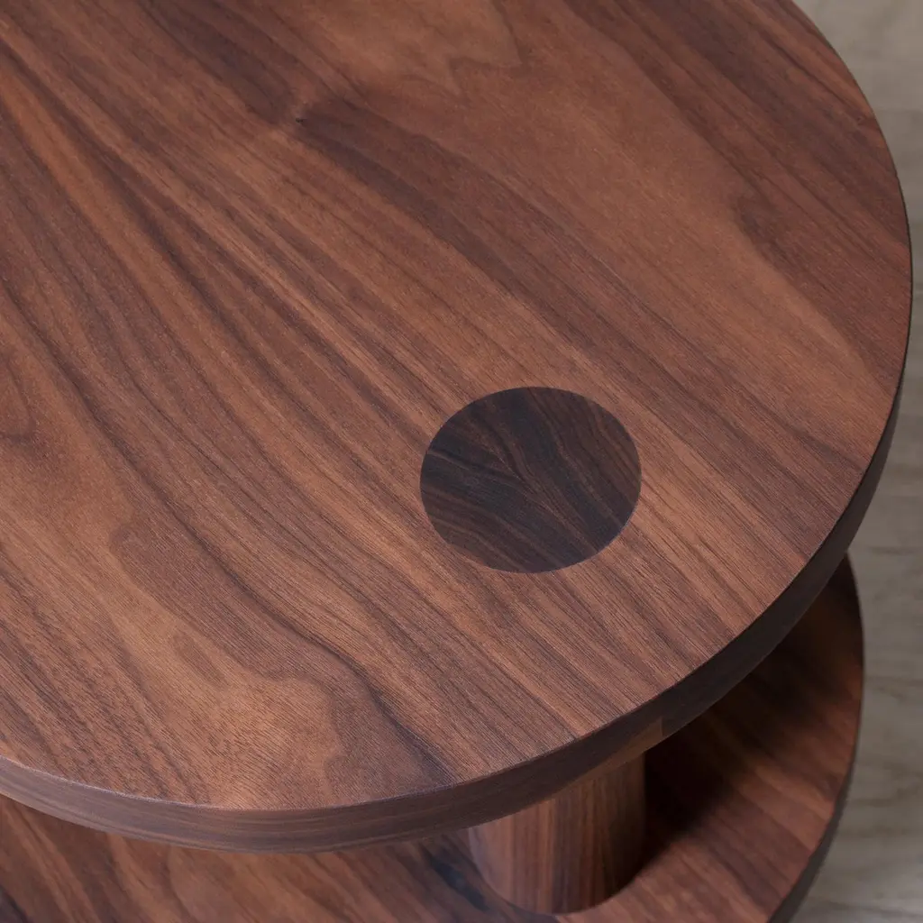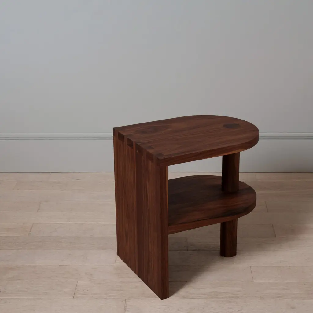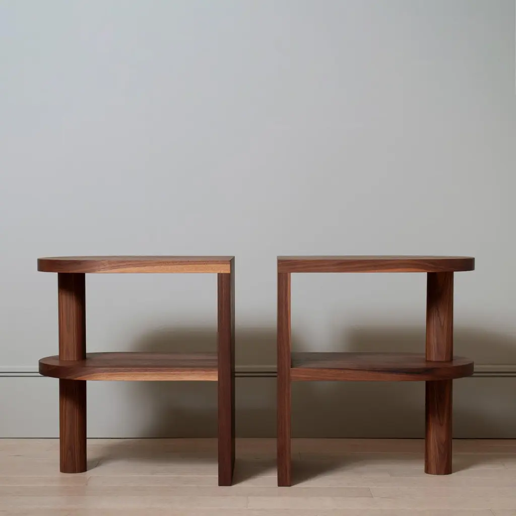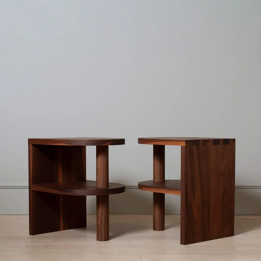 Handcrafted architectural American black walnut nightstands. Designed at Sum furniture and handcrafted using traditional furniture making techniques with the finest American Black Walnut. Hand-cut oversized dovetail jointing detail with a thick turned walnut upright pillar piercing through the sections reinforced internally with a steel bar. Designed to be multi functioning pieces that can also be used as nightstands, seating stools or end tables - scaled up larger versions for sofa/coffee tables. Inspired by Deco and early European Modernist architecture - these are very substantial, visibly bold and striking pieces of handmade furniture, built to last. Finished in durable natural oils.Alternative versions in quarter-sawn English oak can be seen in final images and in our other listings/storefront.Custom dimensions are available to order and quoted upon request.We design bold and distinctive pieces of furniture – our main objective is combining the design alongside the natural beauty and properties of the raw materials.These timbers and materials are very carefully chosen for each specific design - maintaining our focus on the benefits, visual impact and strengths of what we use. Our regular use of English Quartersawn Oak is one case in point. It has been the beloved timber of fine furniture makers across the world for centuries. It is costly to produce but gives huge benefits and rewards such as its striking medullary rays and superb stability qualities. By utilising these wonderful and naturally occurring features and timbers with our contemporary designs we aim to continue creating some very distinct, tactile and idiosyncratic pieces.These are all completely handmade, in very small numbers, by our skilled craftspeople in England.