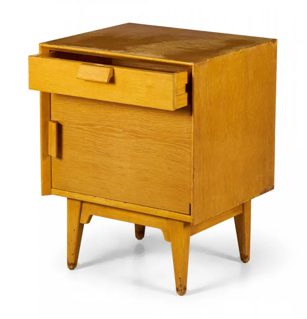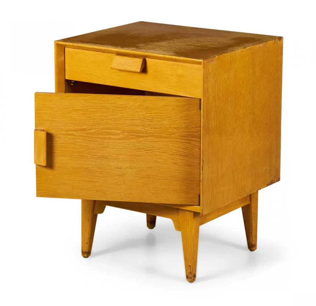 PAIR of Danish Mid-Century blond oak bedside tables / commodes with a single upper drawer above a cabinet compartment with angled wooden drawer pulls resting on four tapered wooden legs. (JENS RISOM)(PRICED AS PAIR)