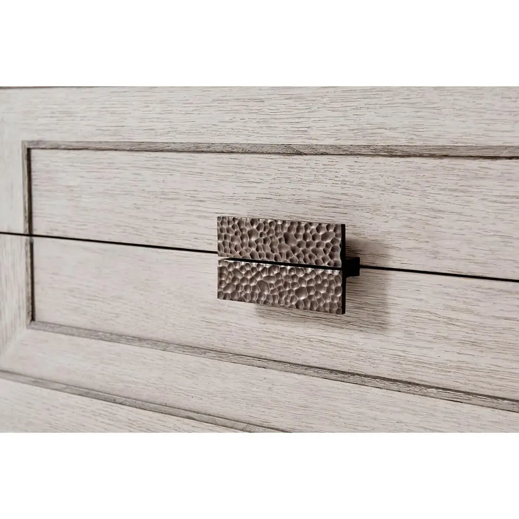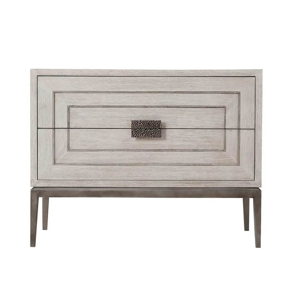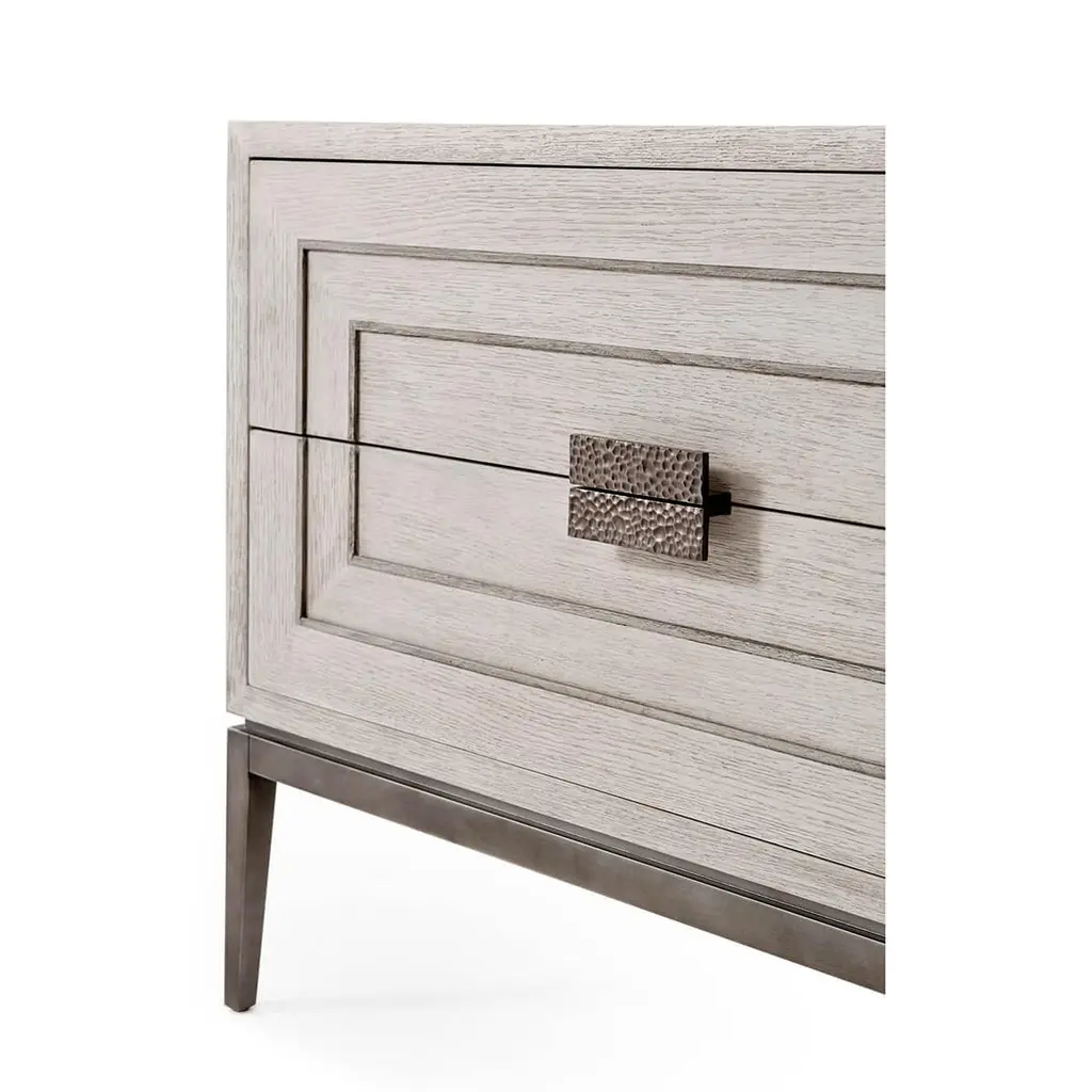 Crafted with meticulous attention to detail, this nightstand adds a touch of sophistication and charm to any bedroom setting.Constructed from high-quality materials and boasts a sturdy and durable build, ensuring its longevity and resilience. In our light brushed Gowan finish oak and raised on modern matte tungsten legs.Dimensions: 35" W x 19" D x 27" HFEATURES:Brushed Gowan Finish Quartered OakTwo Drawers with Relief Inlaid Angular Centric LinesHammered Metal Handle with Matte Tungsten FinishRaised on Matte Tungsten Finish LegsSoft Closing Drawer Runners
