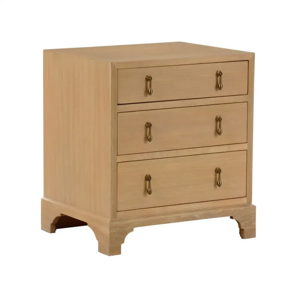 Light Oak Modern Bedside Chest with a light whitewashed oak finish, has a simple cubist geometric form with three drawers, each with soft closing mechanisms and polished brass ring pulls. The Square case has square brass feet. The bedside chest is expertly constructed with attention to detail, using high-quality materials that ensure longevity.Dimensions: 24" W x 18" D x 33" H.