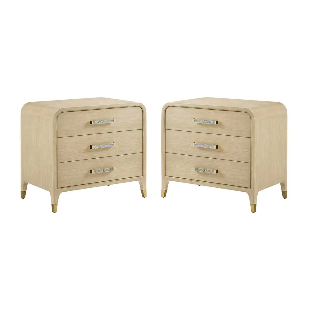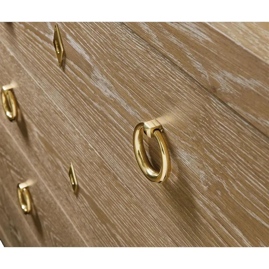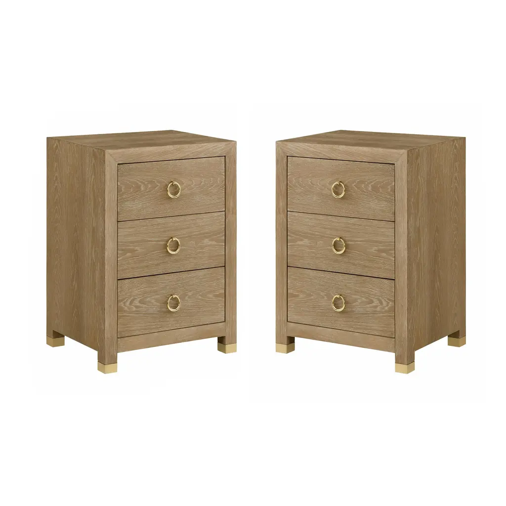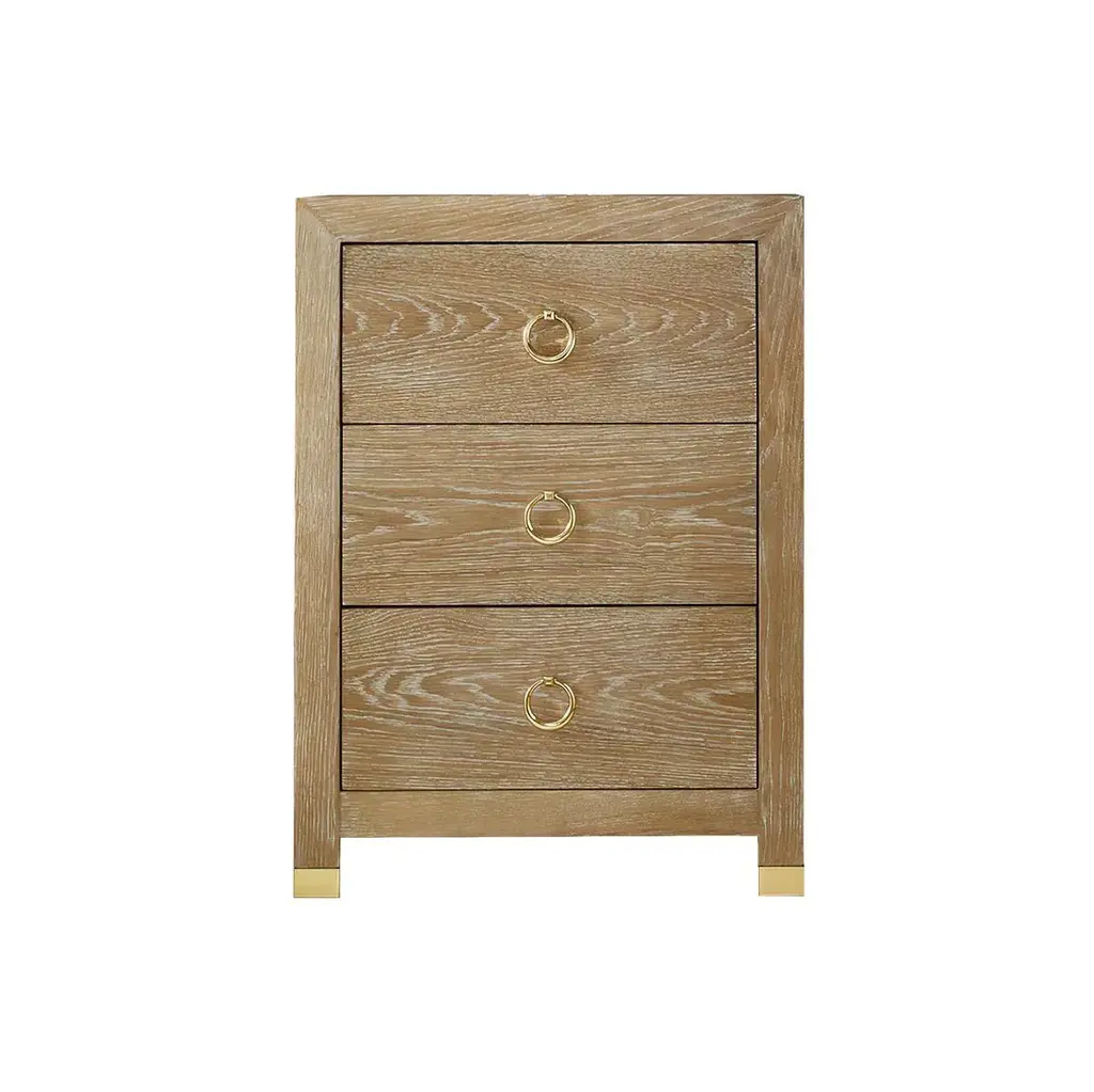 Light Oak Modern Bedside Chest with a light whitewashed oak finish, has a simple cubist geometric form with three drawers, each with soft closing mechanisms and polished brass ring pulls. The Square case has square brass feet. The bedside chest is expertly constructed with attention to detail, using high-quality materials that ensure longevity. Dimensions: 24" W x 18" D x 33" H
