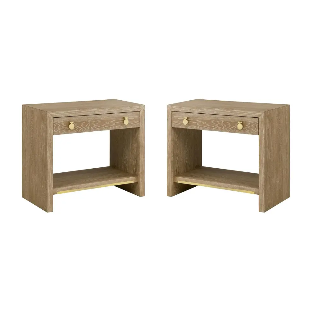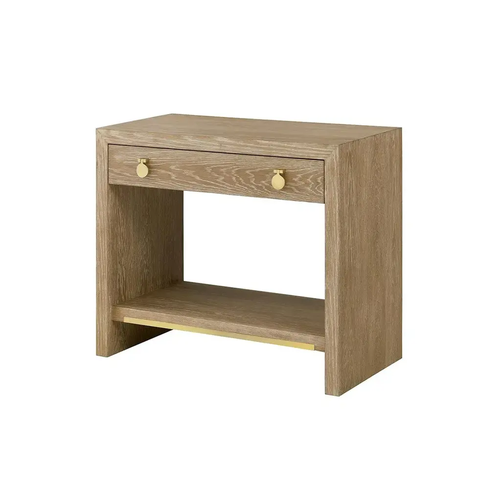 Light Oak Modern Nightstand with a whitewashed natural oak finish, a simple cubist form with a soft closing single drawer having modern polished brass drop pulls, and the lower shelf with brass trim. Dimensions: 38" W x 19" D x 32" H