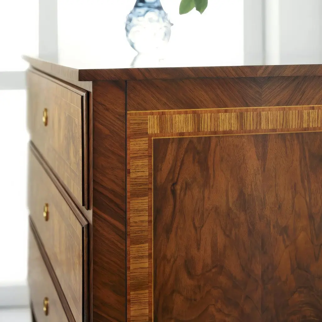 Nightstand embodies the refined elegance of 18th-century French design through its masterful use of book-matched burl veneers and delicate inlays. Each drawer front showcases symmetrically arranged burl patterns framed by precise stringing and cross banding. The clean lines reflect the neoclassical characteristics of the Louis XVI period.This sophisticated bedside chest pairs historical authenticity with everyday functionality. The three full-width drawers operate smoothly, providing generous storage while maintaining the piece's elegant profile. Supported by tapered legs, this nightstand adapts beautifully to various settings, from formal living spaces to master bedrooms where classical French style is desired.Dimensions: 36" W x 18" D x 32" H