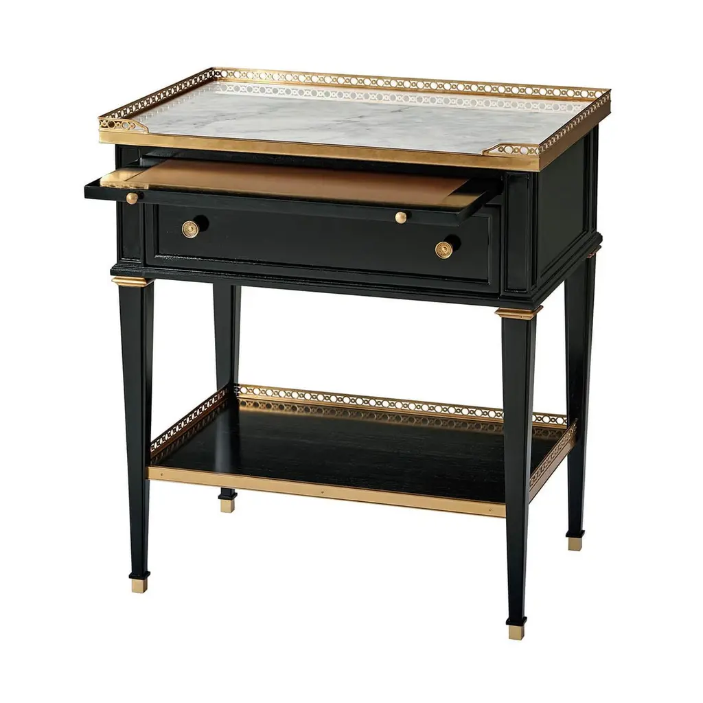 A French neoclassical style nightstand, with a pierced brass gallery and Bianco Carrara marble top, pull-out tray, single drawer with cast brass handles, square tapered legs with brass capitals and feet, and pierced brass gallery lower shelf. Perfect as an end table too!Dimensions: 26" W x 18" D x 28" H.The price is for a pair of tables.