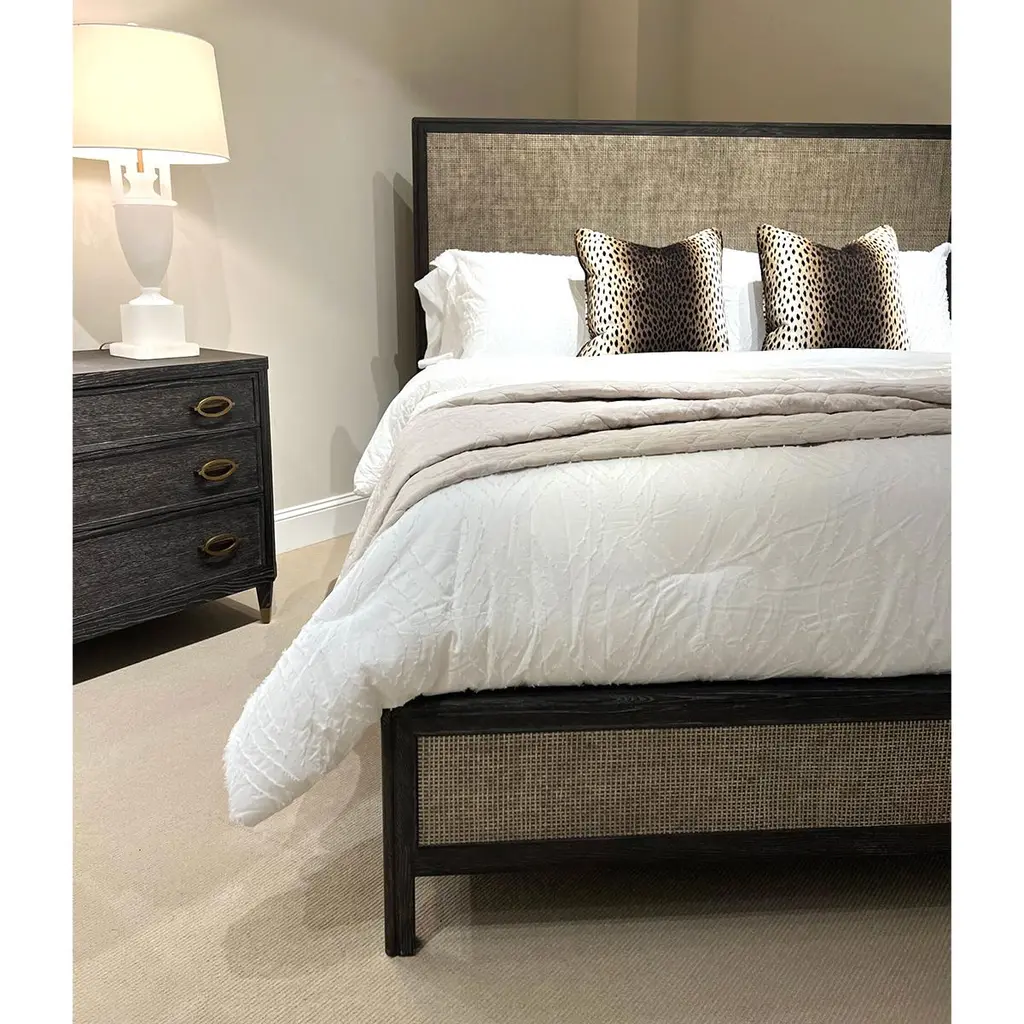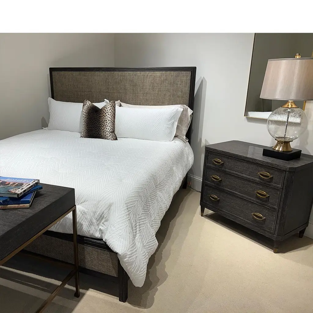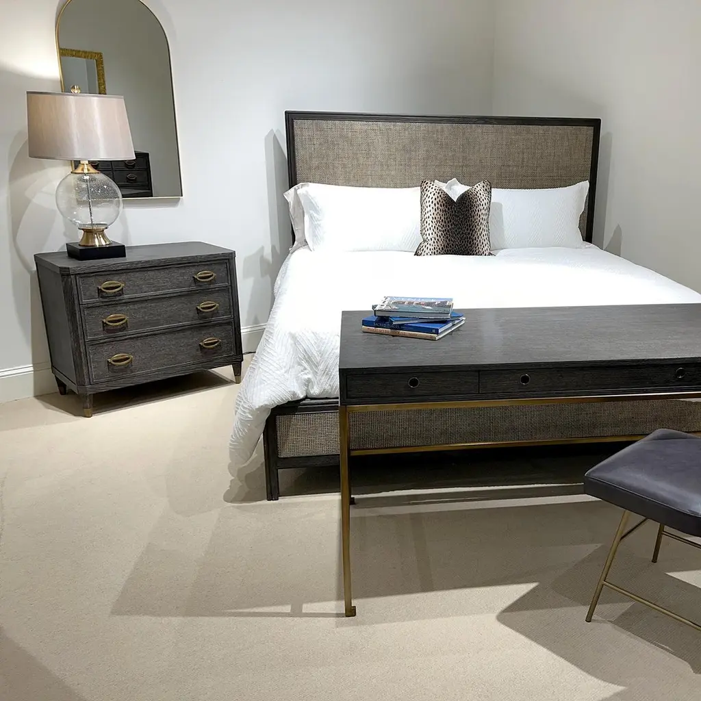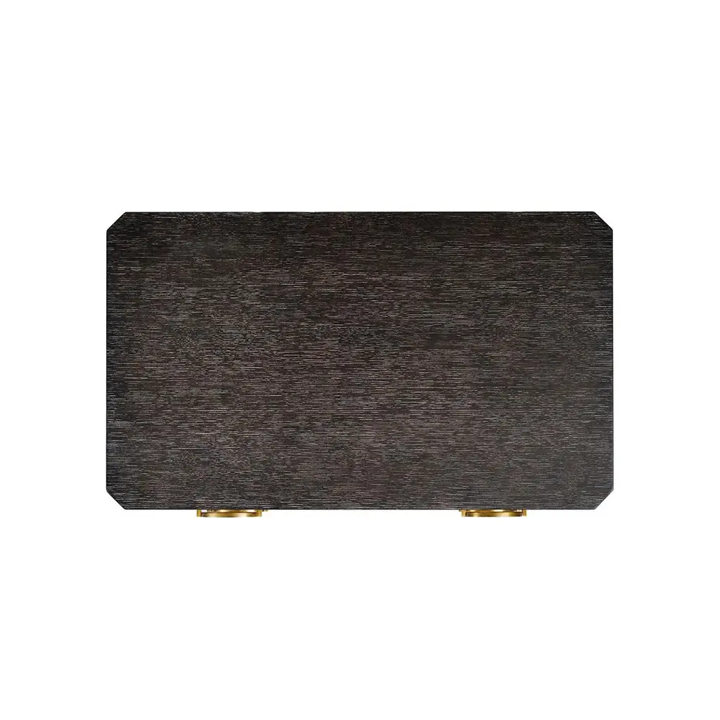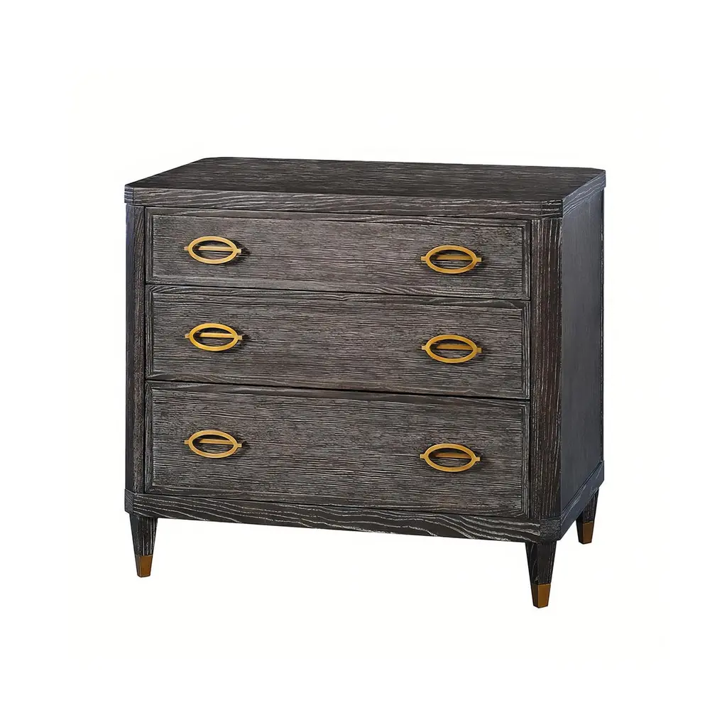 Transform your bedroom with the Midnight Modern Nightstand, a stunning piece that combines sleek design with ample storage capacity.A dark cerused finish with three graduated drawers. Each with modern brass oval pulls. The case with canted corners and raised square tapered legs.Dimensions: 34" W x 20" D x 30" H.