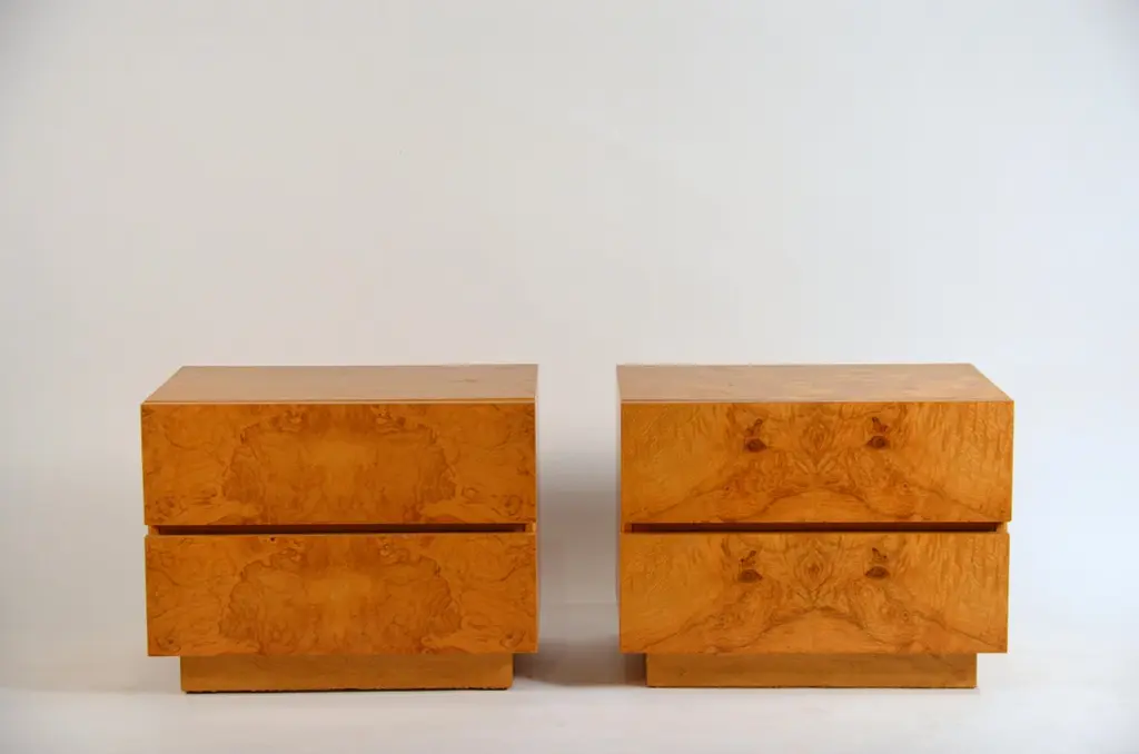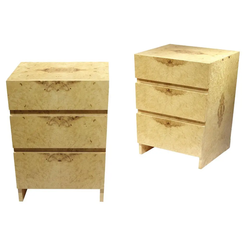 Pair Of Minimalist 'Amboine' Burl Wood Nightstands By Design Frères