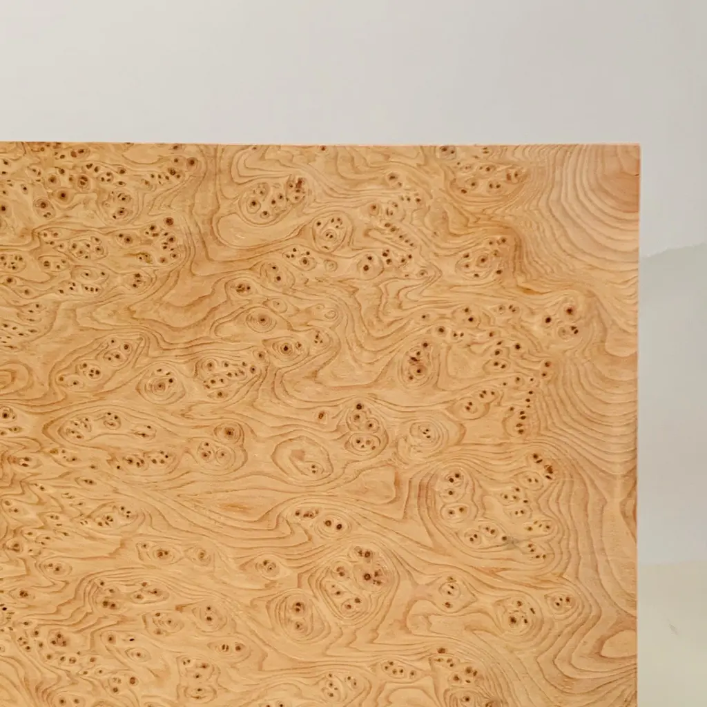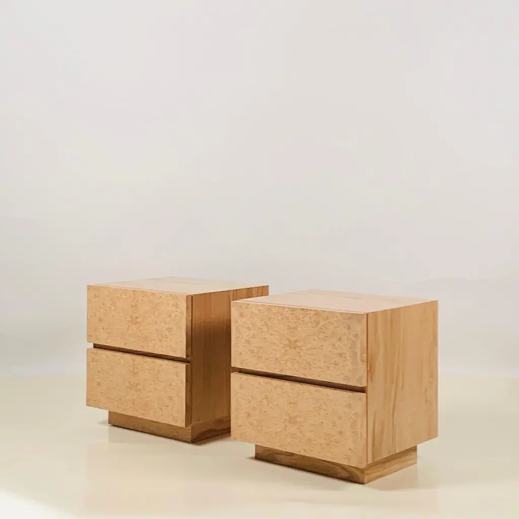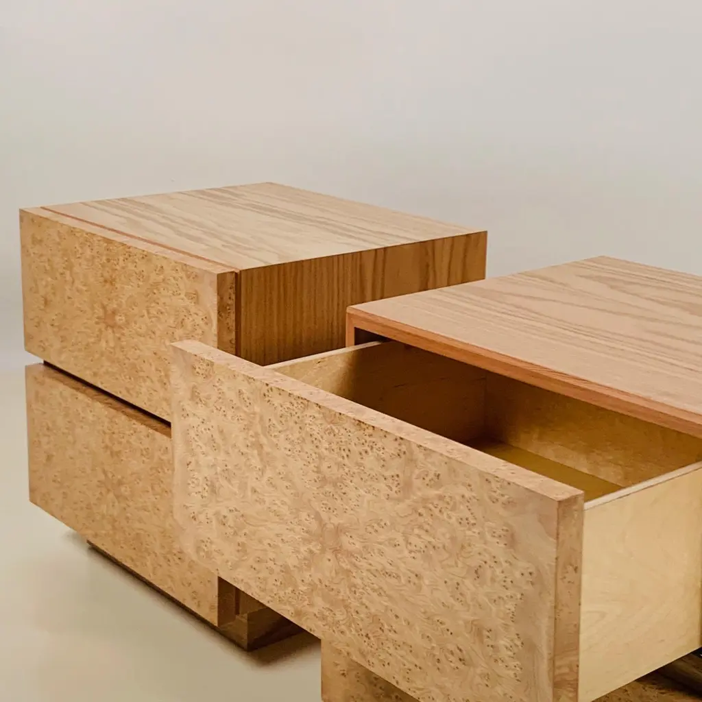 Pair Of Minimalist 'Amboine' Burl Wood Nightstands By Design Frères