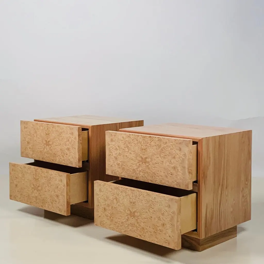 Pair of Minimalist 'Amboine' burl wood nightstands by Design Frères.Simple, functional design with 2 deep drawers per nightstand.The bedroom picture is of a similar sized pair.
