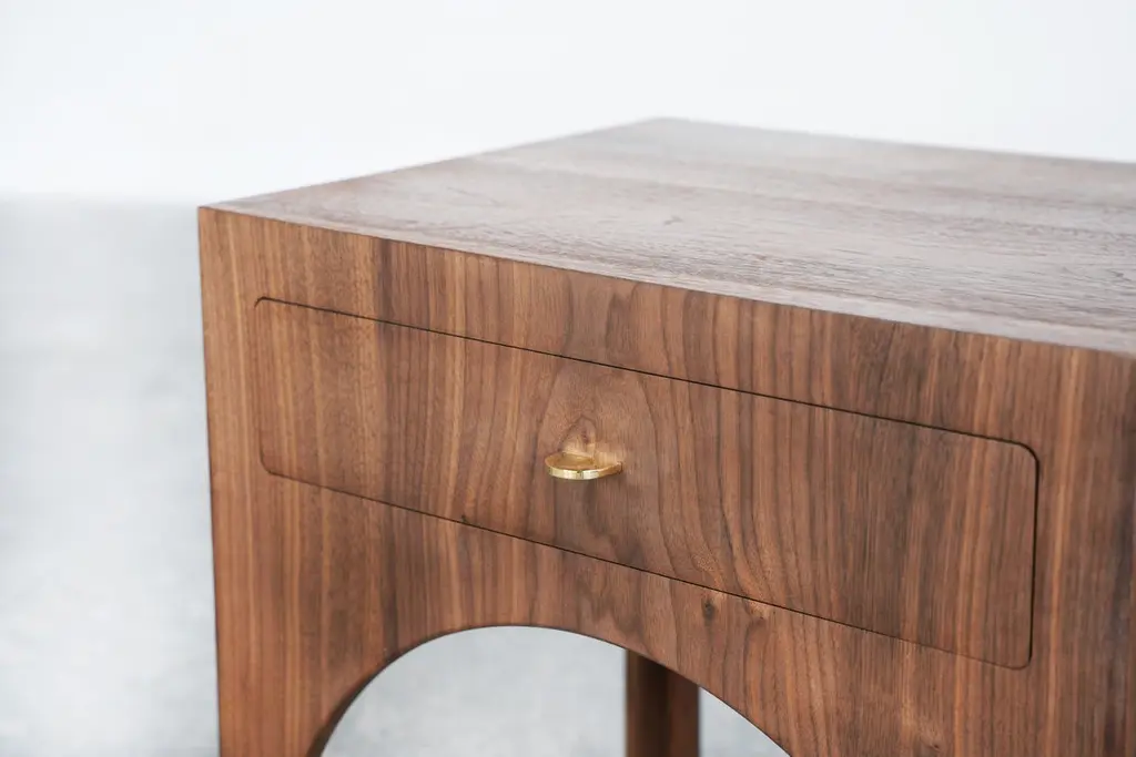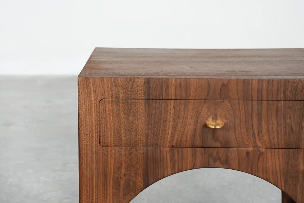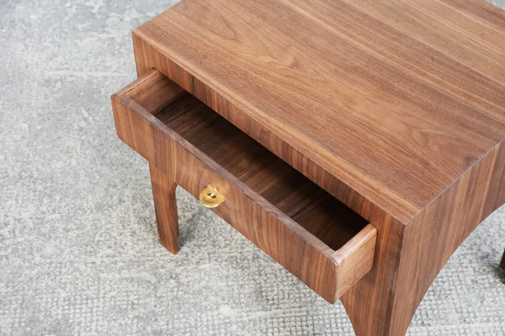 A beautiful pair of nightstands designed by Yuzo Nakamura-Bachmann, handcrafted in Germany.These nightstands are made out of solid American Walnut and brass handles. Finished with natural furniture wax.