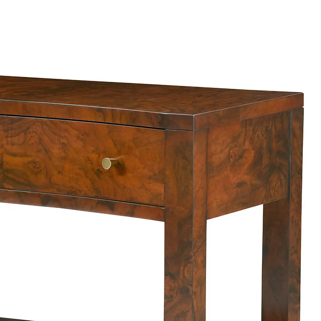 Modern Burl Nightstand, made with exotic burl walnut veneers, with a concave form front with two drawers and an open shelf space. Each drawer with polished brass knobs and with square tapered legs on brass feet.Dimensions: 30" W x 18" D x 32" H.