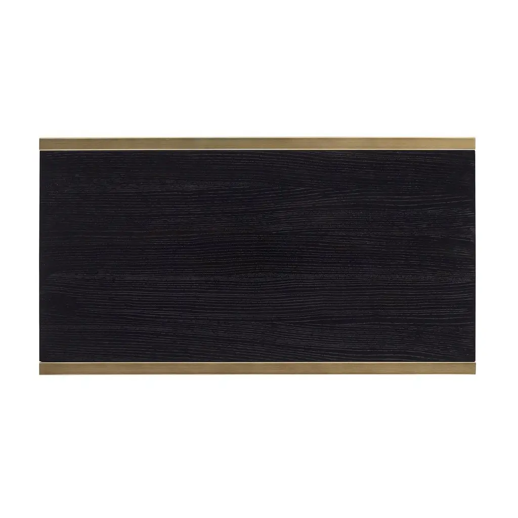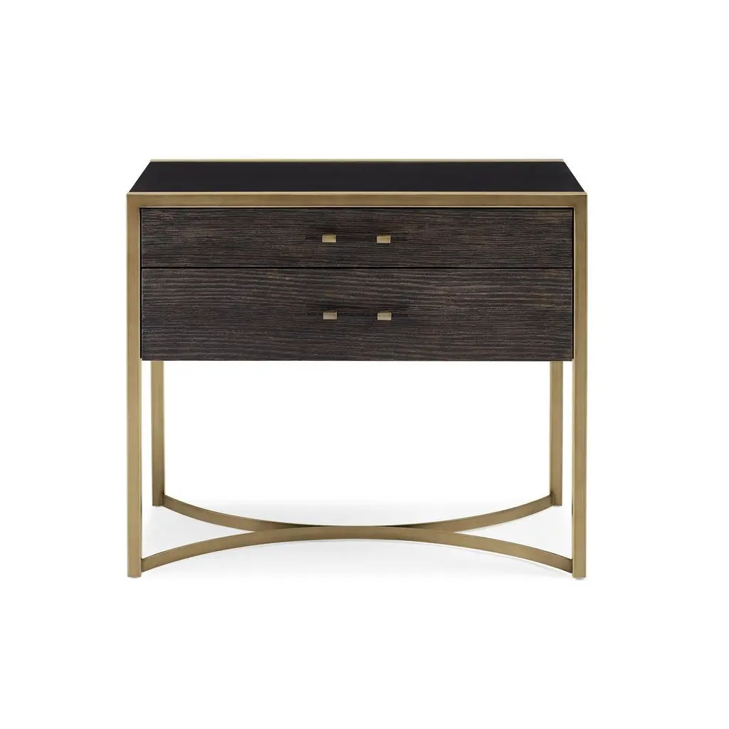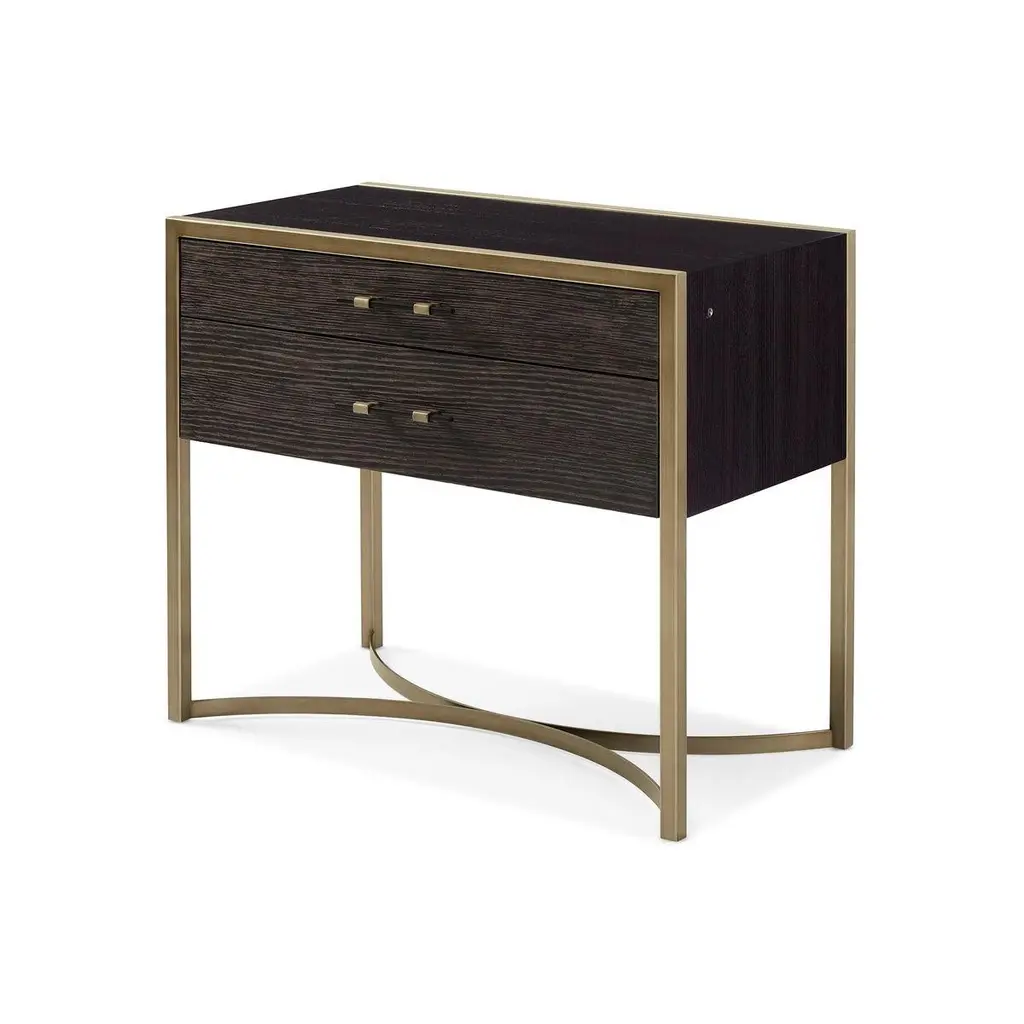 The clean-lined profile is paired with a shapely metal base created by two half circles. With its medley of cerused oak, black stained Ash and bronze metallic finishes, this bedside essential feels both classic and style-forward. Two drawers complete its appeal and are perfect for storing a few of your favorite things as well as keeping your master retreat clutter-free.Dimensions: 33" W x 18" D x 28" H