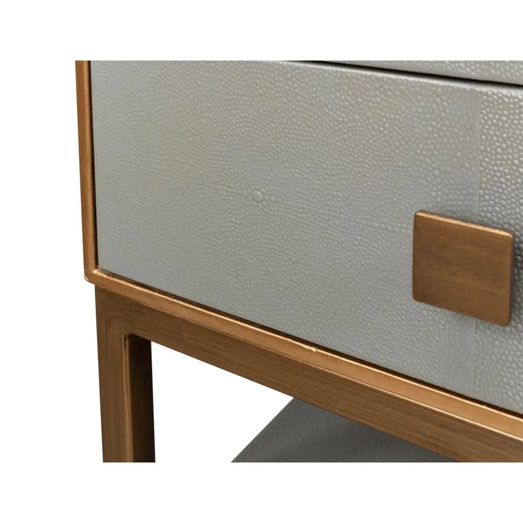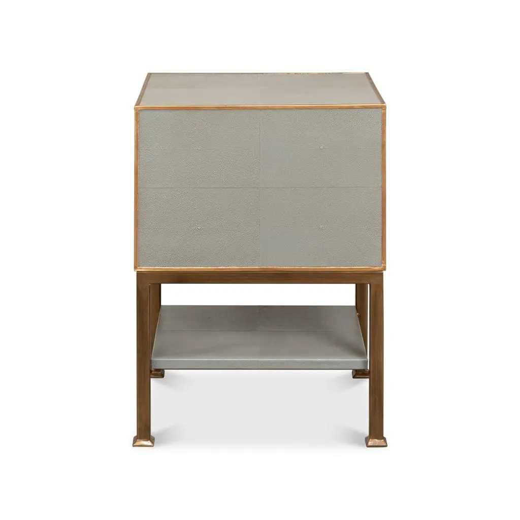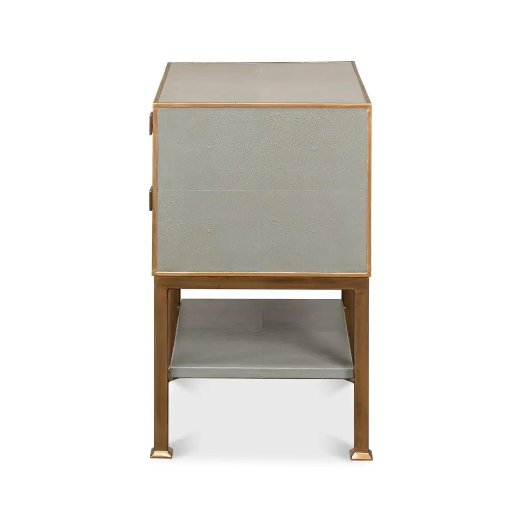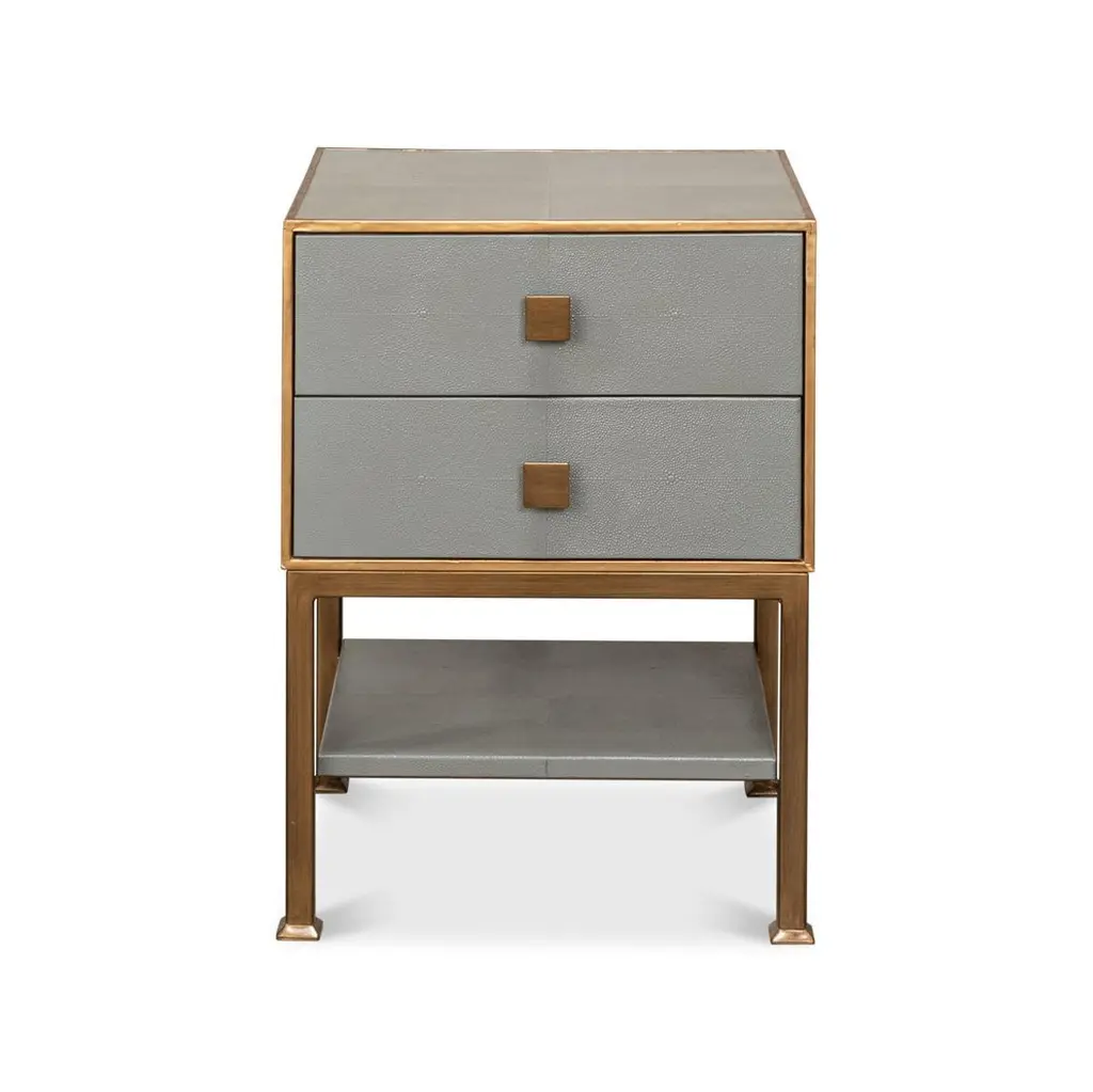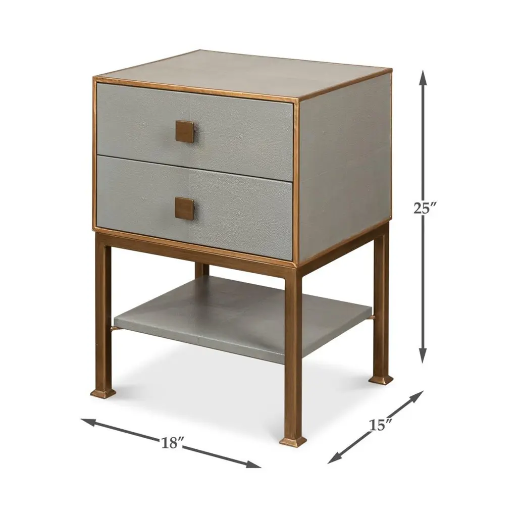 A streamlined design with its sleek embossed leather framed in a lustrous gilt finish. The two stacked drawers, adorned with simple square pulls, offer a discreet storage solution, while the lower shelf is perfect for stacking books or displaying cherished keepsakes. It's an ideal choice for those who crave a clean, uncluttered aesthetic without sacrificing functionality. Whether gracing a chic urban apartment or a contemporary bedroom, this nightstand promises to add a touch of sophistication and modern flair to your resting space.Dimensions: 18" W x 15" D x 25" H