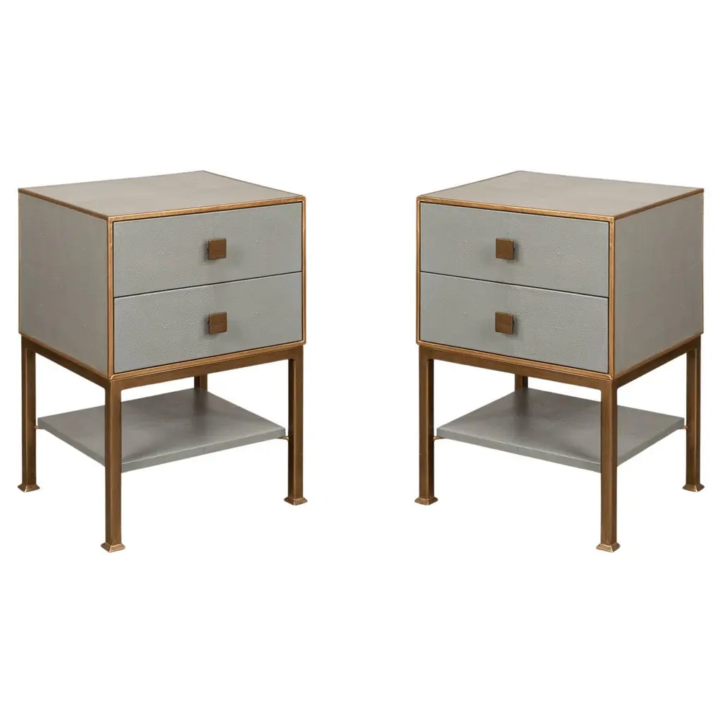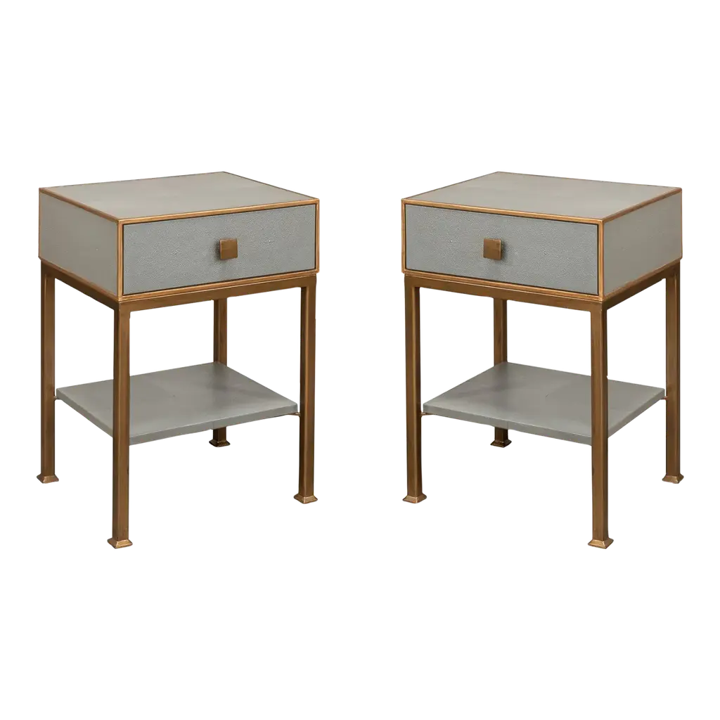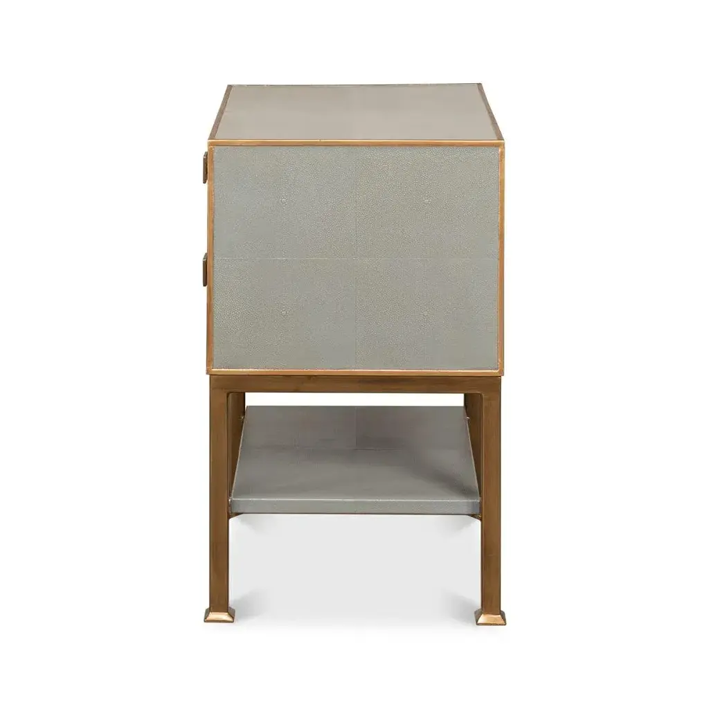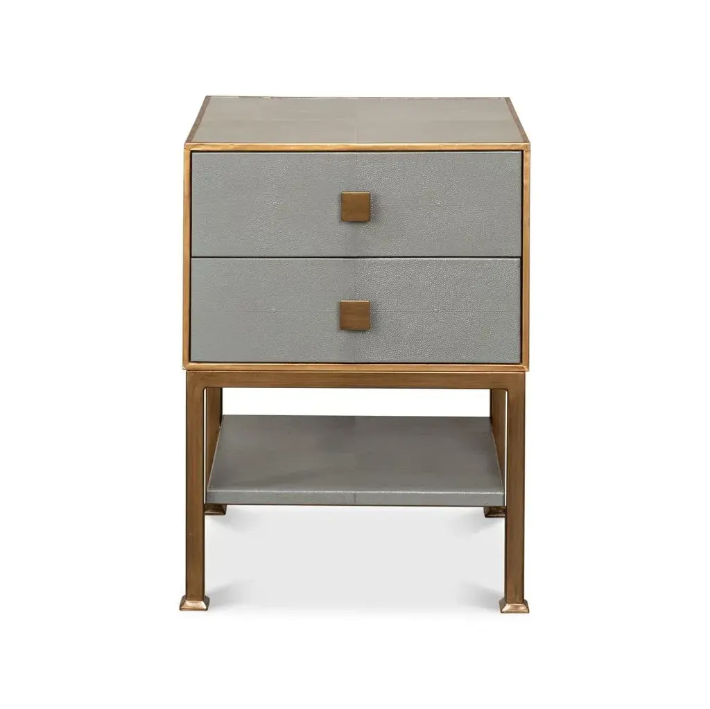 A streamlined design with its sleek embossed leather framed in a lustrous gilt finish. The two stacked drawers, adorned with simple square pulls, offer a discreet storage solution, while the lower shelf is perfect for stacking books or displaying cherished keepsakes. It's an ideal choice for those who crave a clean, uncluttered aesthetic without sacrificing functionality. Whether gracing a chic urban apartment or a contemporary bedroom, this nightstand promises to add a touch of sophistication and modern flair to your resting space. Dimensions: 18" W x 15" D x 25" H