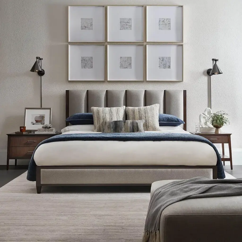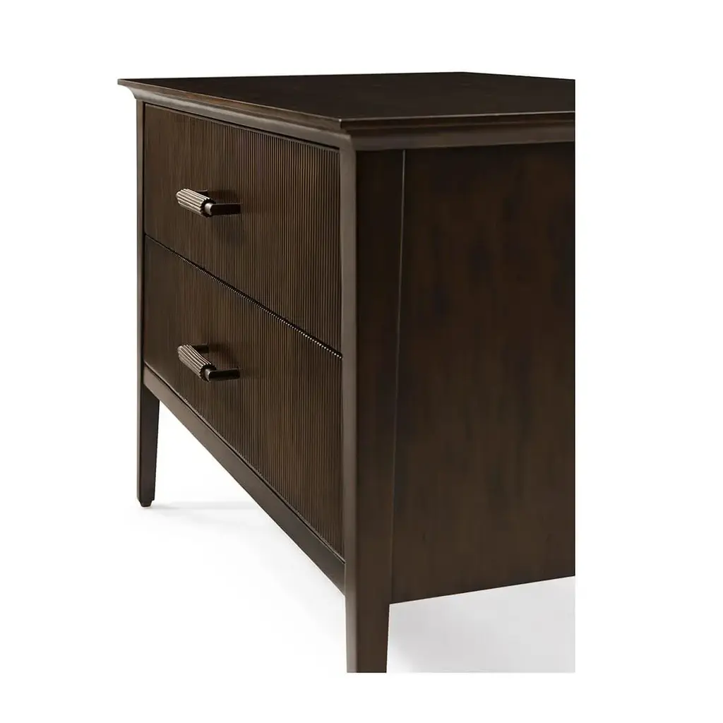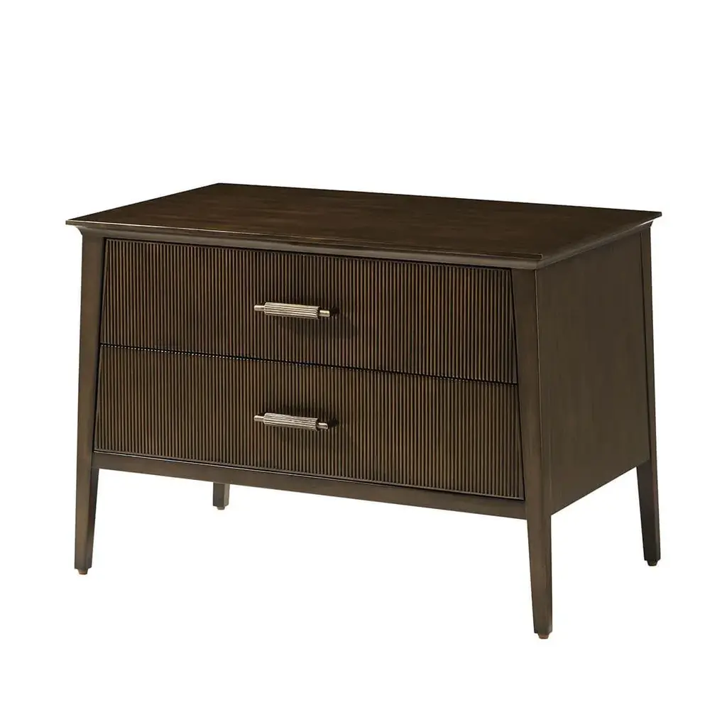 Featuring a sophisticated tapered silhouette with two reeded drawer fronts. The custom forged hardware, finished in a dark rubbed bronze, echoes the reeded details throughout. Dimensions: 32" W x 19.5" D x 22" H