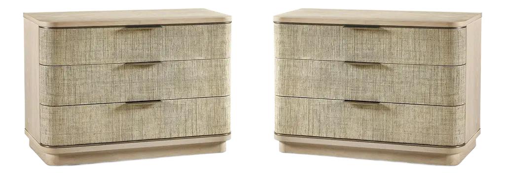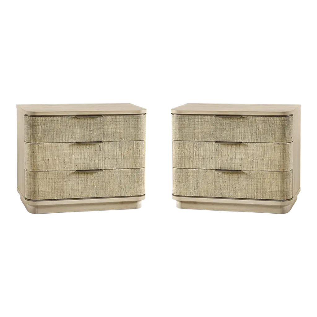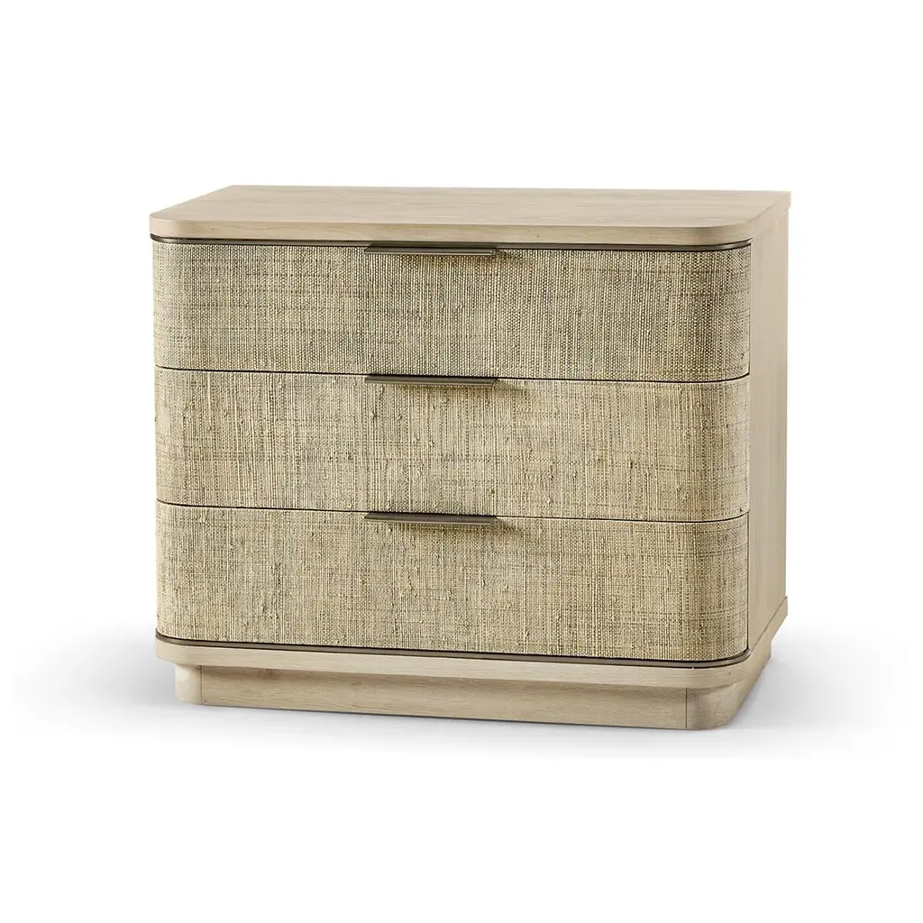 Modern woven nightstand, a beautifully crafted piece is born from passion and boasts incredible aesthetic details that are sure to take your breath away.The nightstand's three bleached oak drawers are wrapped in grasscloth, adding a subtle texture to the design that's both visually pleasing and inviting. With its modern woven design, the nightstand is the perfect addition to any contemporary bedroom.Dimensions: 36" W x 18" D x 29 5/8" H.