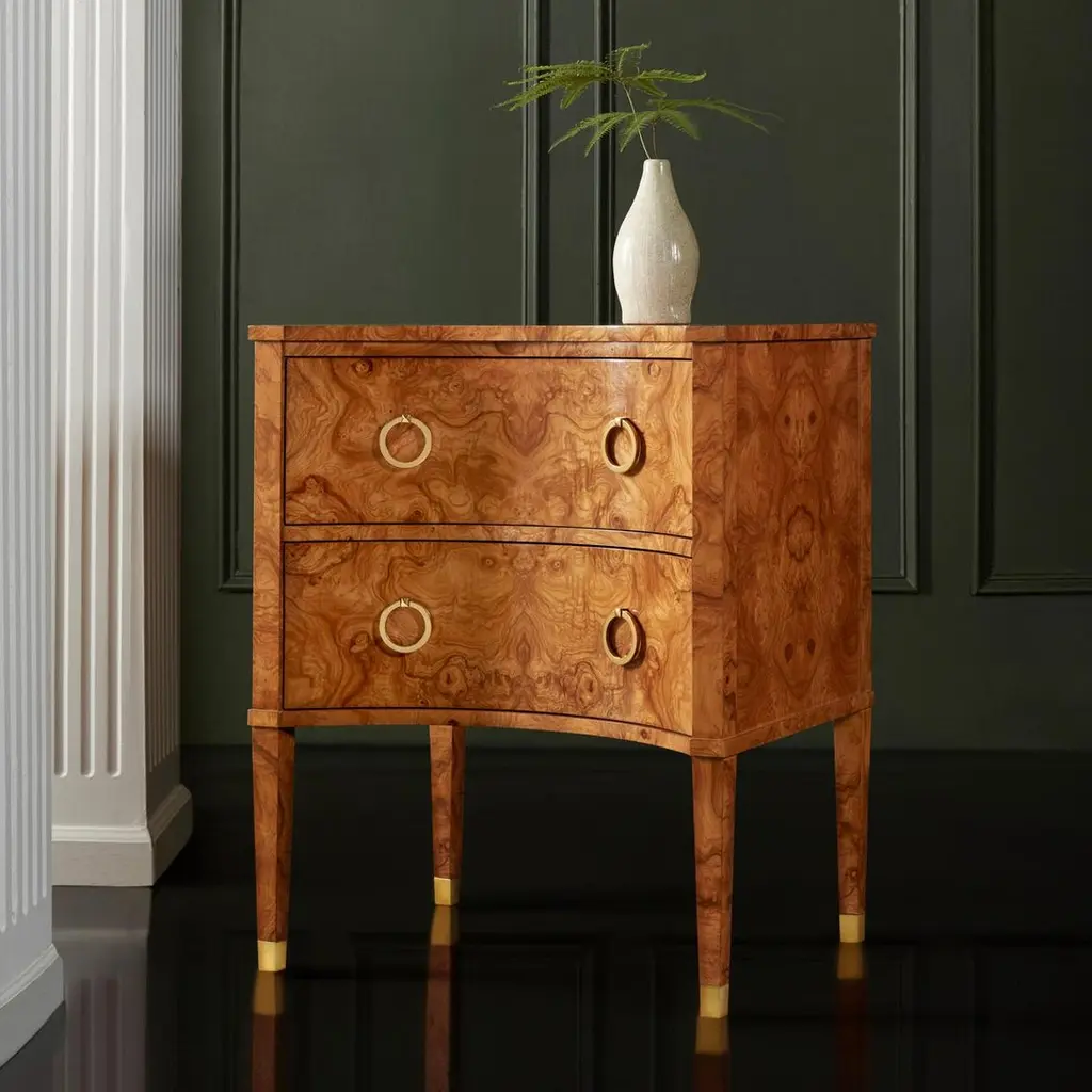 Masterfully crafted in richly figured burl wood, this elegant bedside chest showcases the wood's natural swirling grain patterns through careful veneer selection and matching. This versatile two-drawer chest serves beautifully as a bedside table, offering generous storage while maintaining refined proportions ideal for bedroom settings. The incurved silhouette and raised legs create an airy presence that works equally well against a wall or floating in a room.Dimensions: 26" W x 19.75" D x 32" H