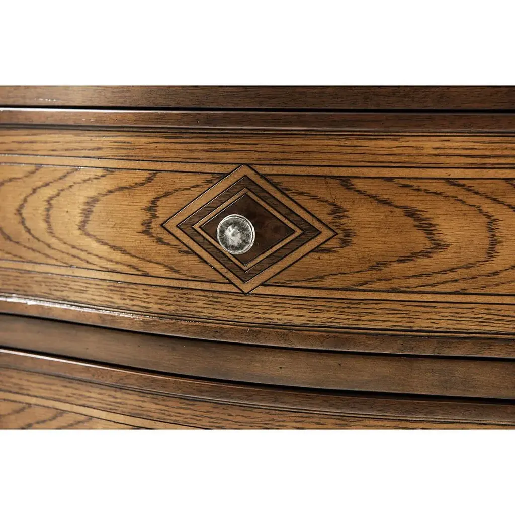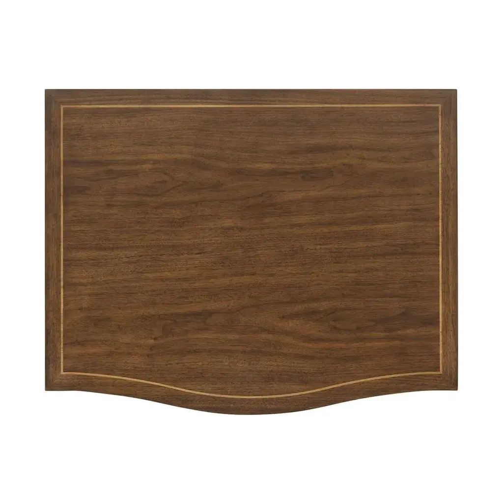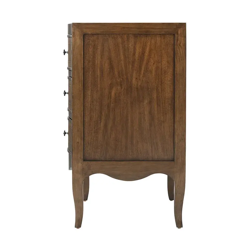 With walnut and oak parquetry with a serpentine form front, three short panel inlaid drawers with antique pewter handles. The nightstands are raised on short cabriole legs. Dimensions: 24" W x 19" D x 32" H