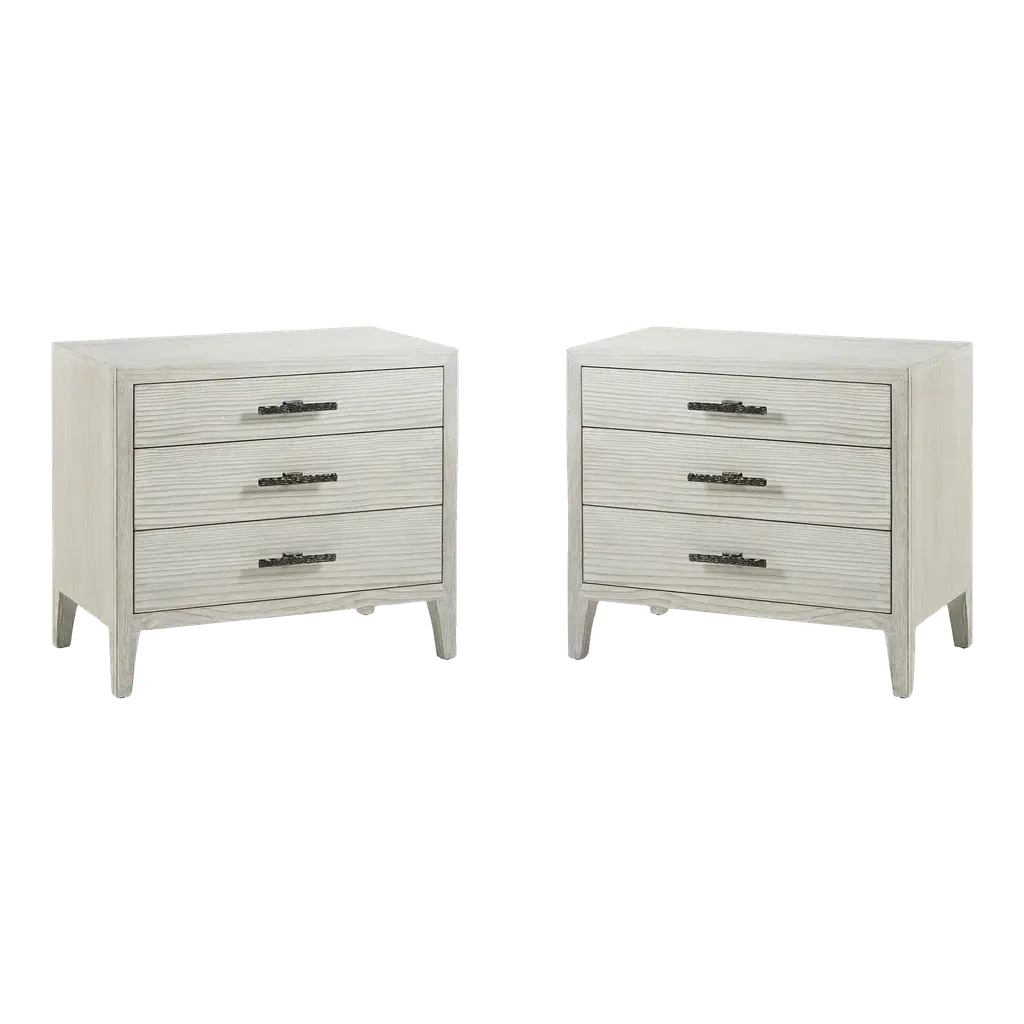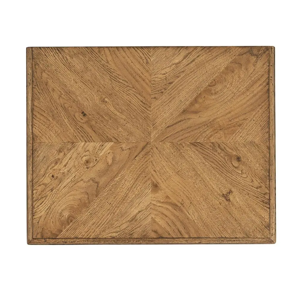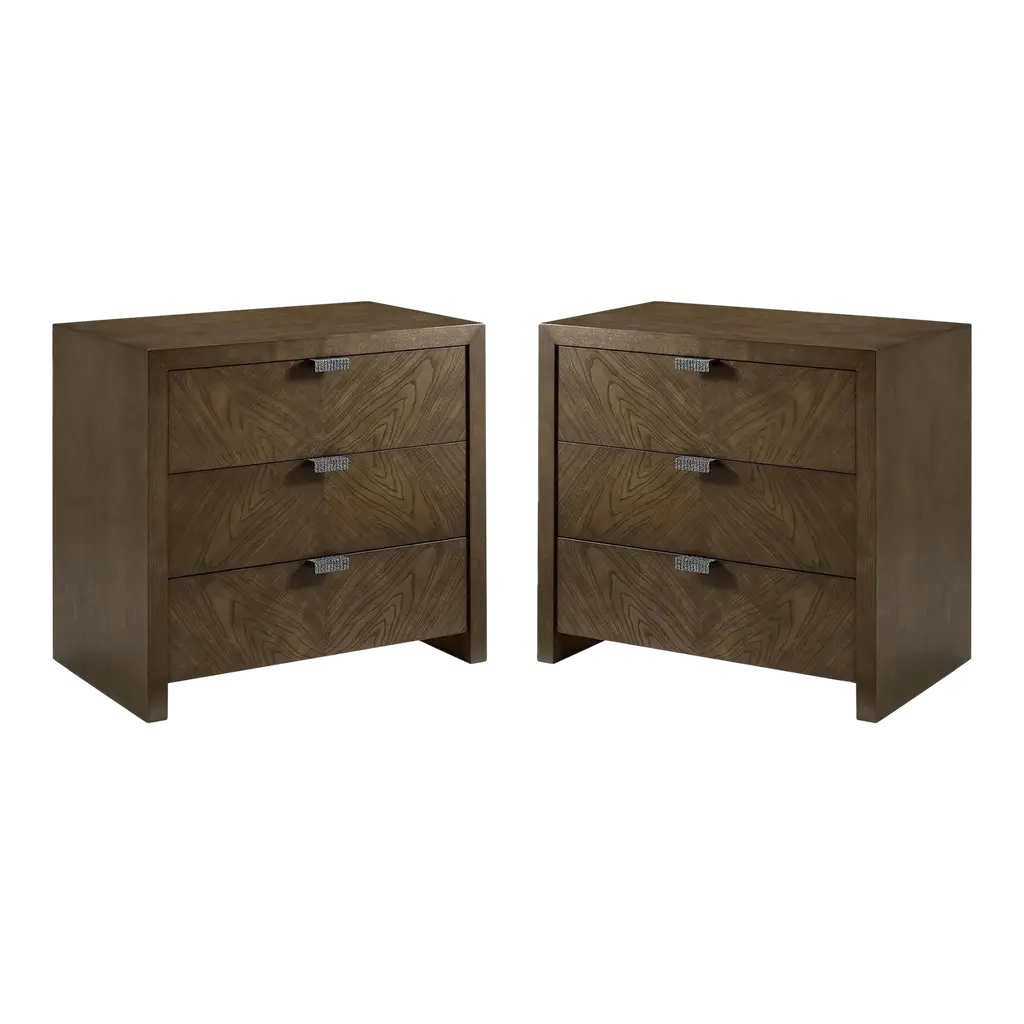 A rustic light oak two-drawer nightstand with a herringbone parquetry design. This beautiful nightstand has two frieze-inspired drawers with Verde Bronze handles. It is supported by two-tier stretcher shelves. Shown in Dawn FinishDimensions: 24" W x 19" D x 28.5" H.
