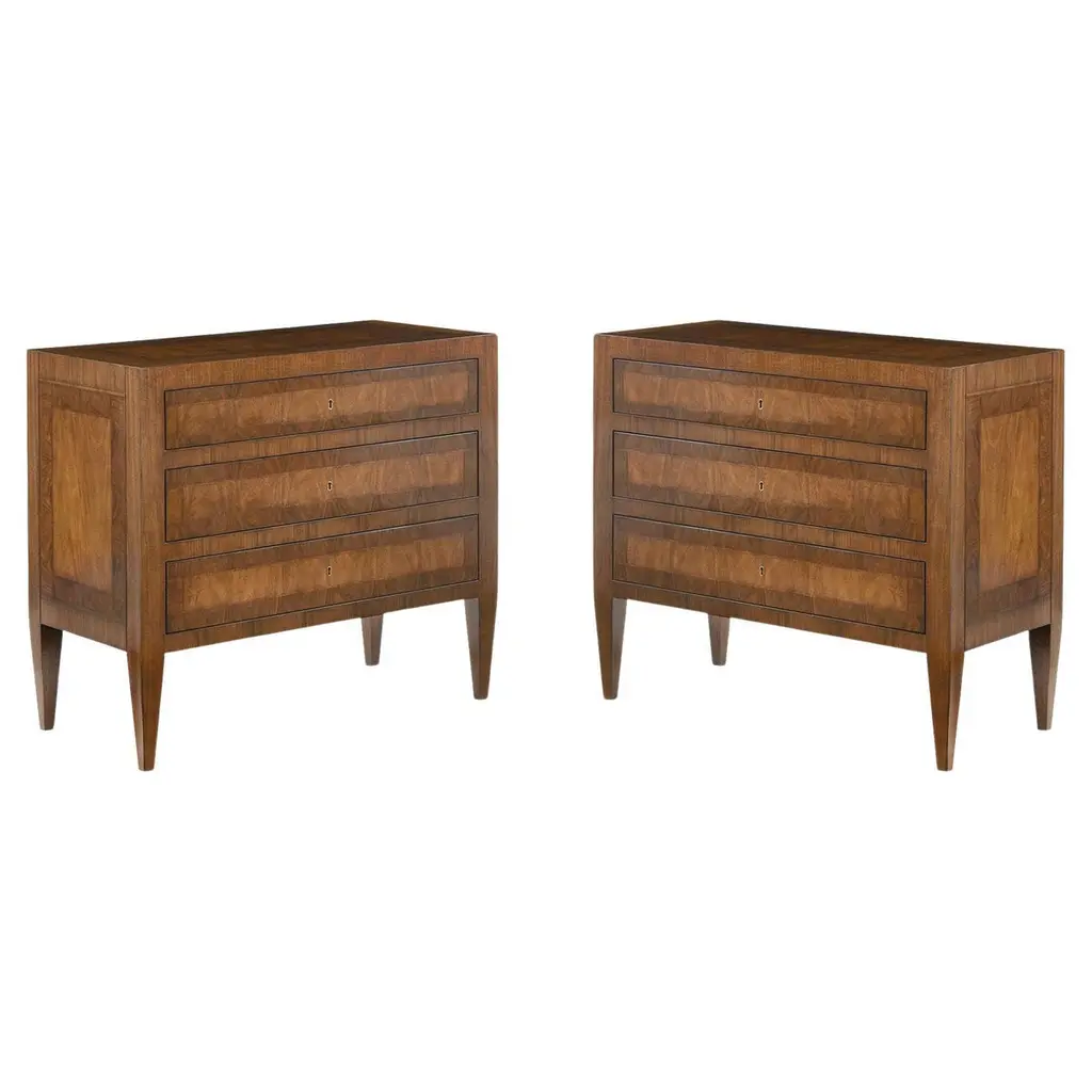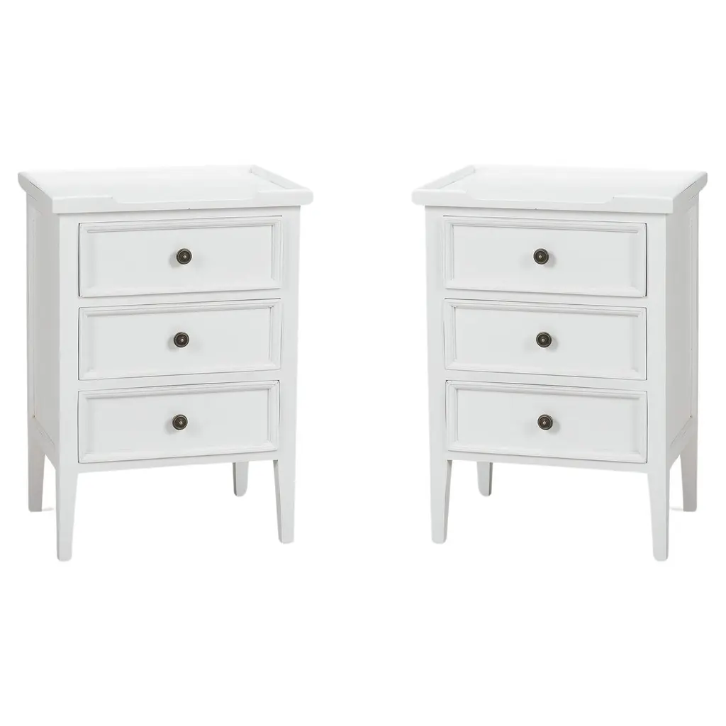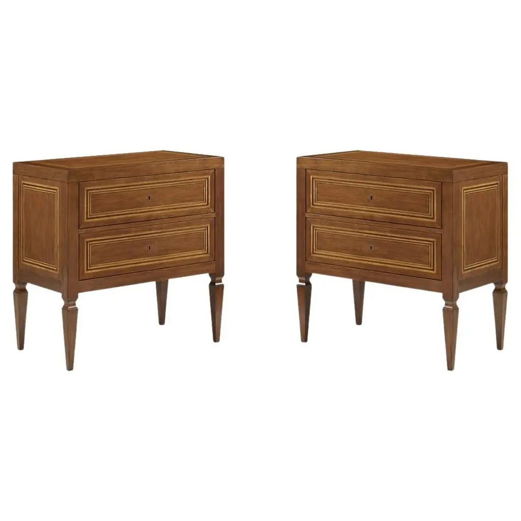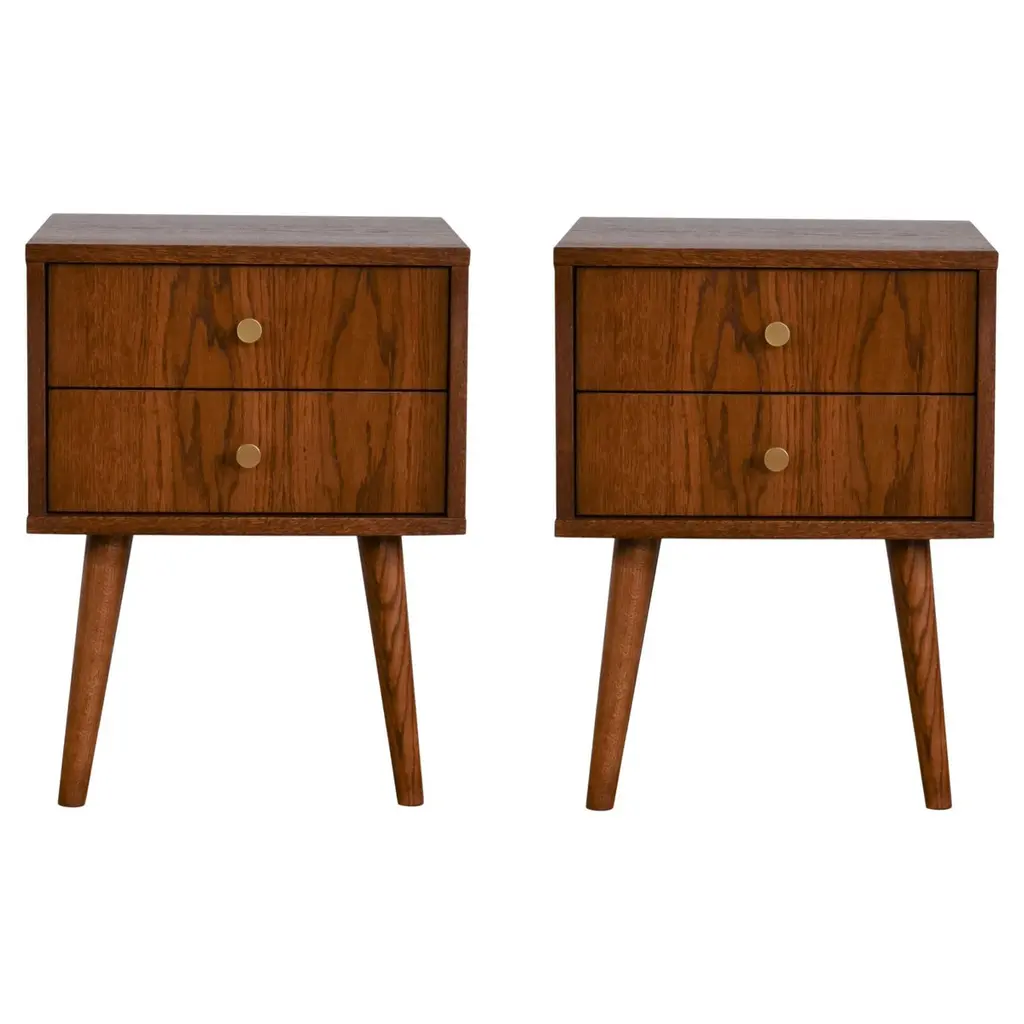 A rustic light oak two-drawer nightstand with a herringbone parquetry design. This beautiful nightstand has two frieze-inspired drawers with Verde Bronze handles. It is supported by two-tier stretcher shelves. Shown in Dawn FinishDimensions: 24" W x 19" D x 28.5" H.