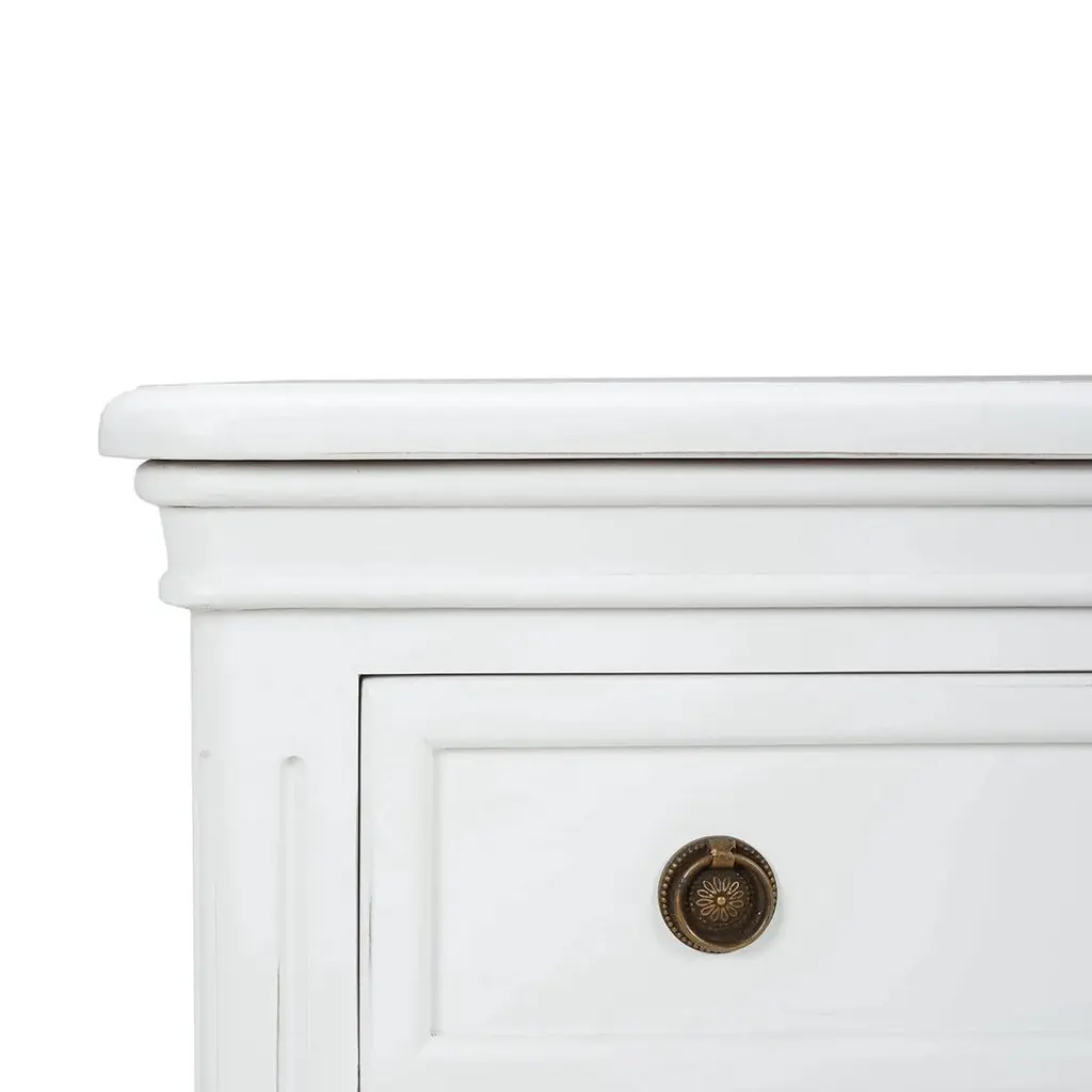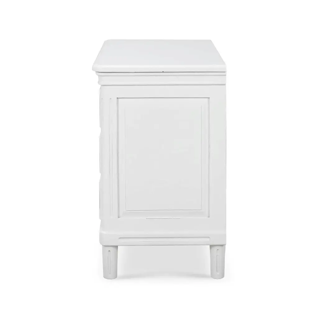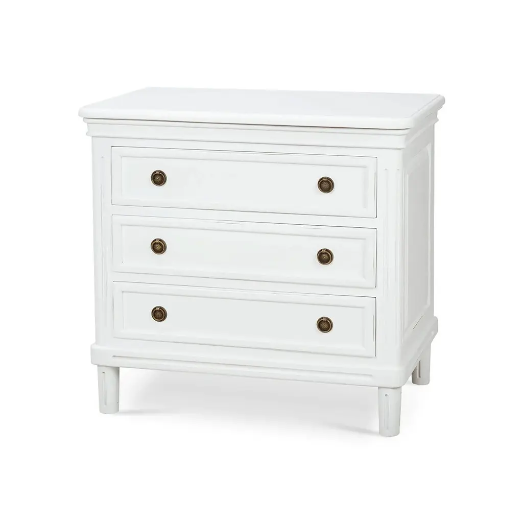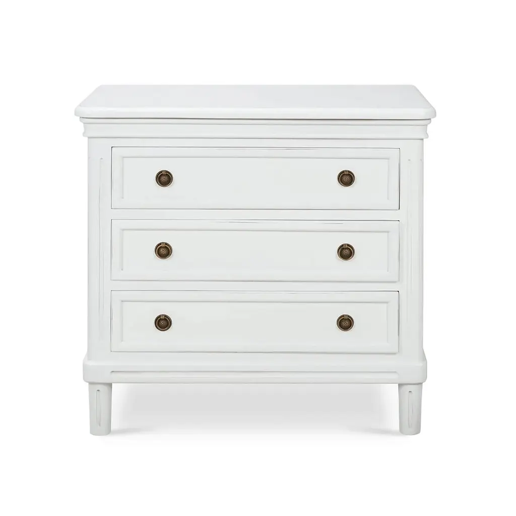 Crafted from solid mahogany, this nightstand offers long-lasting durability while showcasing a timeless rustic and neo-classic design. Its lightly distressed architectural white painted finish adds a touch of sophistication, creating a soft, elegant appeal.With three spacious drawers, this nightstand provides ample storage for your bedside essentials, making it both a practical and stylish piece. Whether used in the bedroom or as an accent piece, it enhances your space with its beauty and versatility.Dimensions: 34" W x 19" D x 32" HCustom finish options are also available. Contact us to learn more.