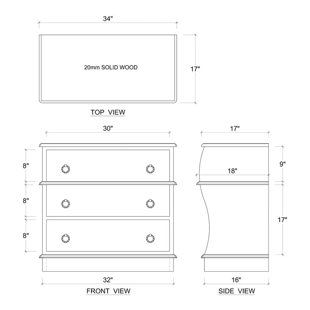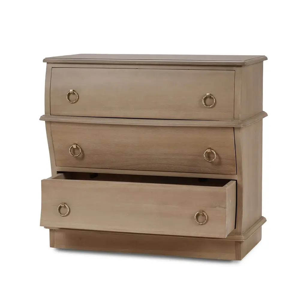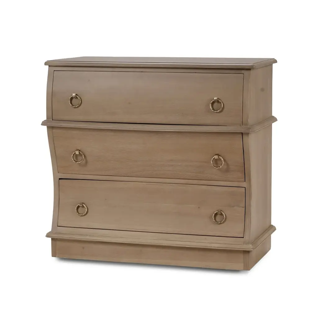 Crafted from solid mahogany and finished in a serene sandbar finish, these nightstands feature an elegant serpentine front that adds a touch of refined charm to any bedroom. The gentle curves and smooth finish effortlessly complement both traditional and contemporary décor. Each nightstand boasts three spacious drawers, adorned with ring pulls, providing ample storage for your essentials while enhancing the overall aesthetic of your space. Dimensions: 34" W x 18" D x 32" H
