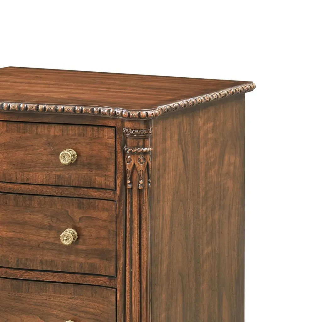 The elegant serpentine front creates a fluid silhouette, complemented by three spacious, crossbanded drawers that showcase masterful woodwork and balance.Crafted with figured wood in a warm walnut finish, this dresser features reeded column stiles accented with carved tassel detailing for a touch of historical ornament. Reeded and tapered legs lend structure and lift, completing the profile with grace. Brass hardware and a carved beaded molding at the top edge add further richness to this enduring piece.Dimensions: 24" W x 20" D x 28" H