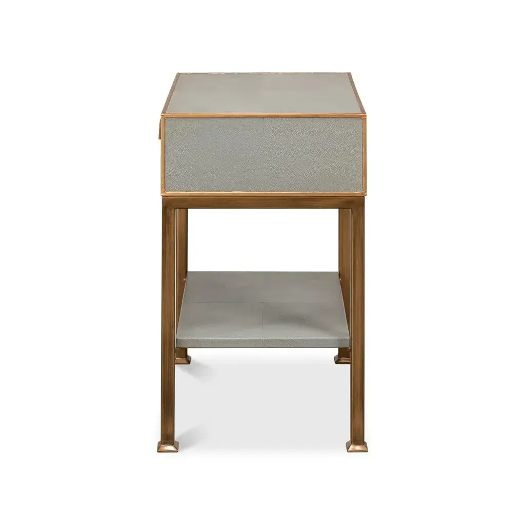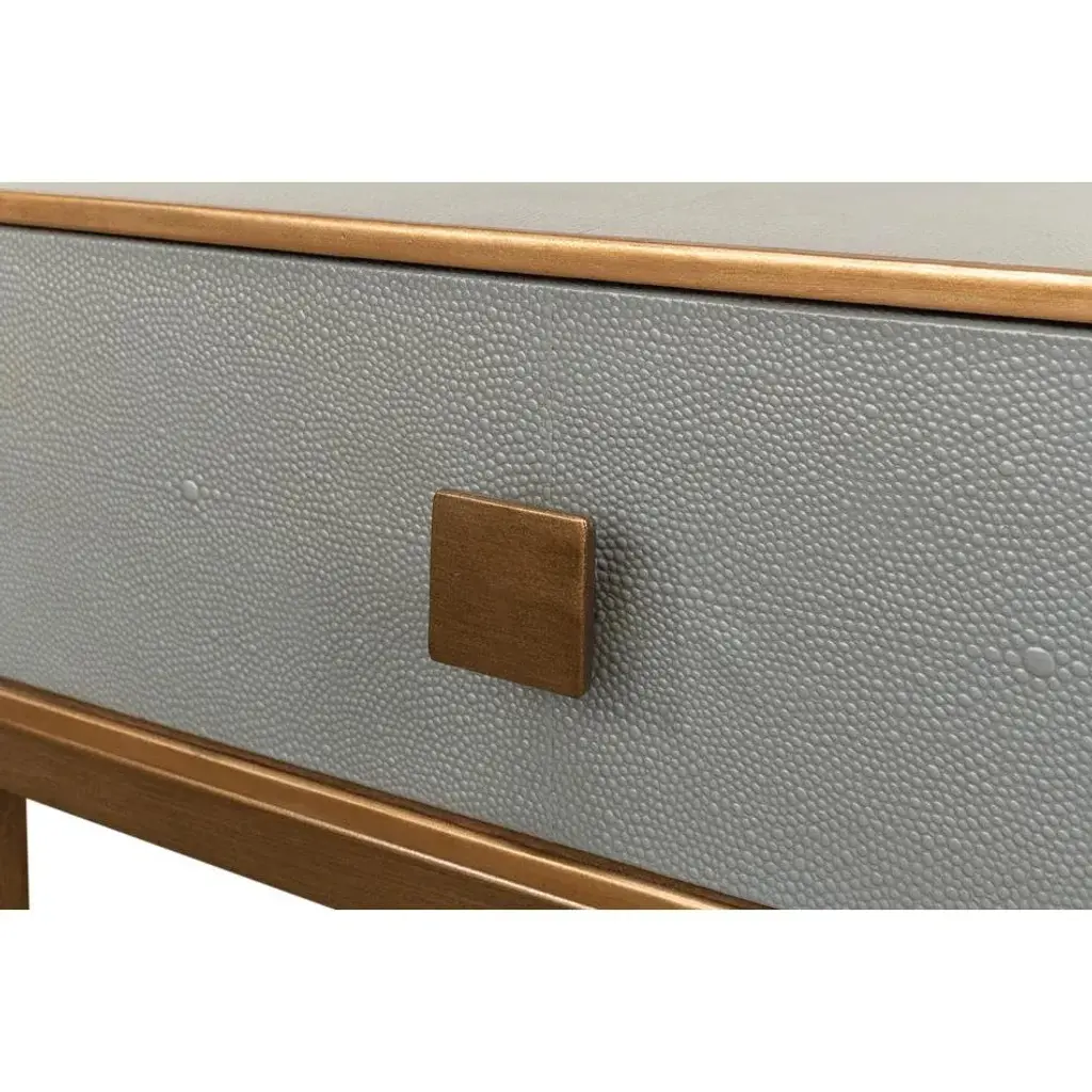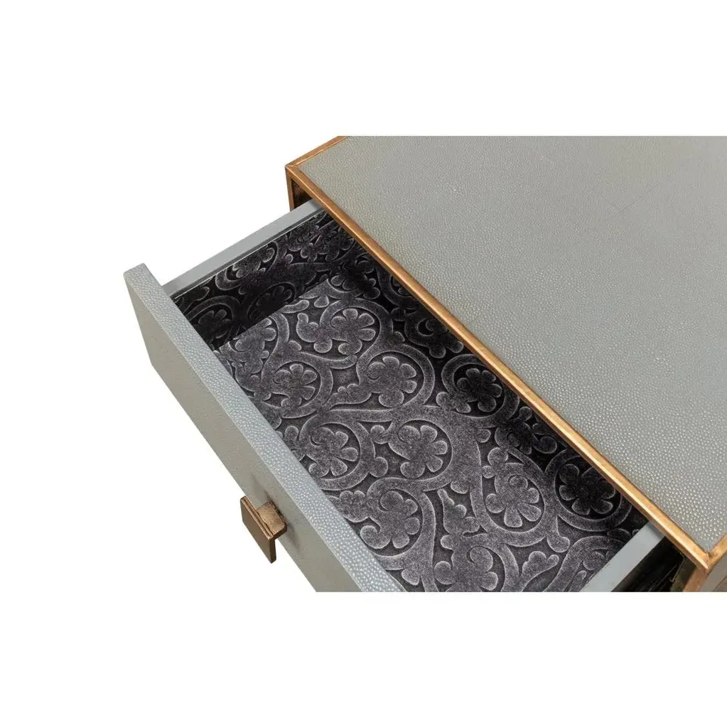 A streamlined design with its sleek embossed leather framed in a lustrous gilt finish. The single drawer, adorned with a simple square pull, offers a discreet storage solution, while the lower shelf is perfect for stacking books or displaying cherished keepsakes. It's an ideal choice for those who crave a clean, uncluttered aesthetic without sacrificing functionality. Whether gracing a chic urban apartment or a contemporary bedroom, this nightstand promises to add a touch of sophistication and modern flair to your resting space. Dimensions: 18" W x 15" D x 25" H