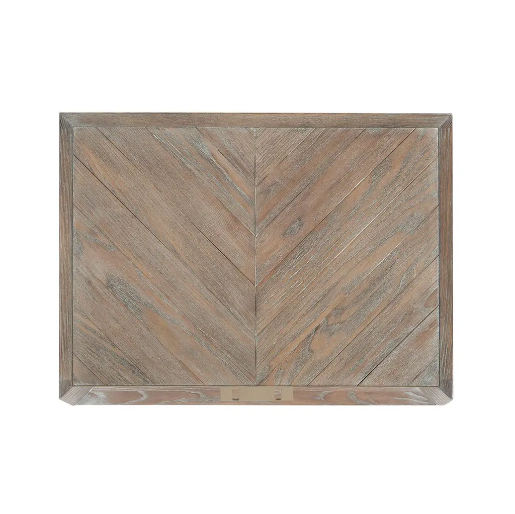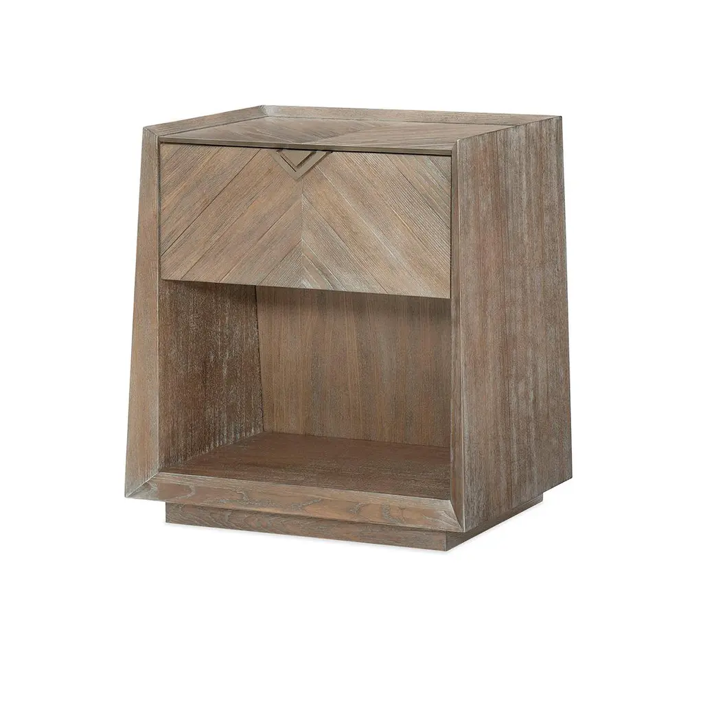 With a simple, slightly tapered silhouette brought to life with exquisitely matched directional woodgrain veneers in a one-of-a-kind chevron pattern.A casual finish of Ash Driftwood highlights the beauty of its stunning veneers. This nightstand’s one drawer is fully finished in an elegant shade of Putty while an open lower shelf is perfect for keeping a few of your favorite things close at hand.Dimensions: 30" W x 18" D x 28" HThe top is 24" WFeatures:Soft close drawerUSB port on back