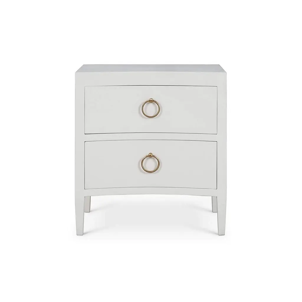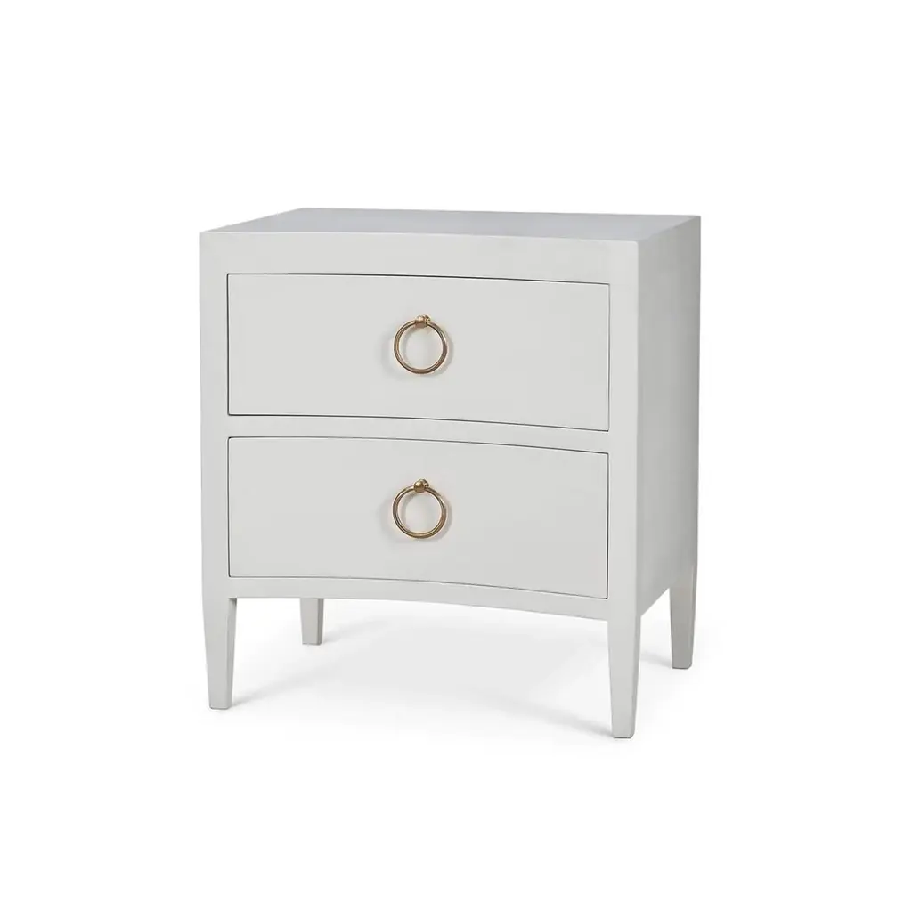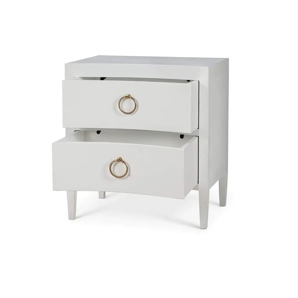 This elegant piece features a sleek, minimalist design wrapped in clean white linen, exuding a calm and serene aesthetic.The subtle texture of the linen finish enhances its modern appeal, while the two spacious drawers provide ample storage for your bedside essentials. Adorned with chic gold ring pulls, this chest effortlessly combines functionality with refined elegance, making it a standout piece in any room.Dimensions: 26" W x 19" D x 28" H