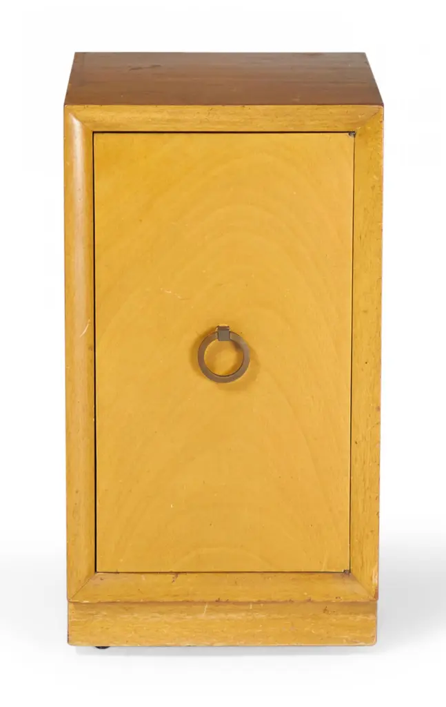 Pair of American mid-century blond maple nightstands / tall cabinets with a single compartment concealed by a hinged door with a brass ring door pull. (WIDDICOMB MODERN)(PRICED AS PAIR)(Similar cabinet: DUF0149A)