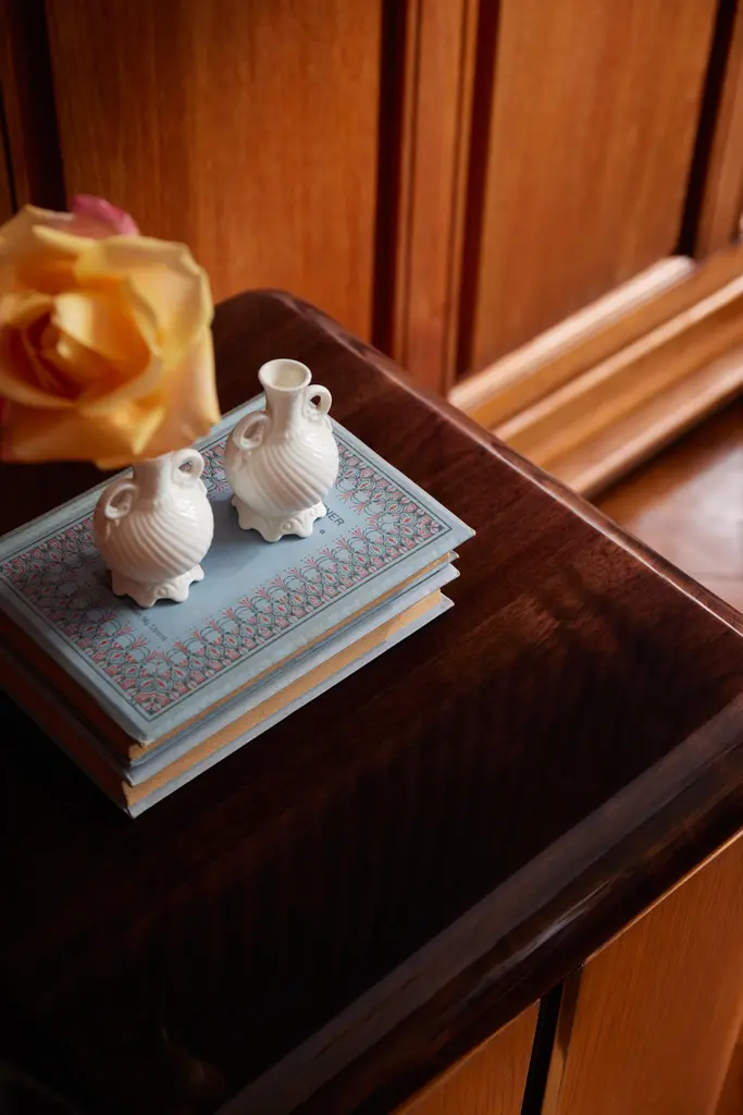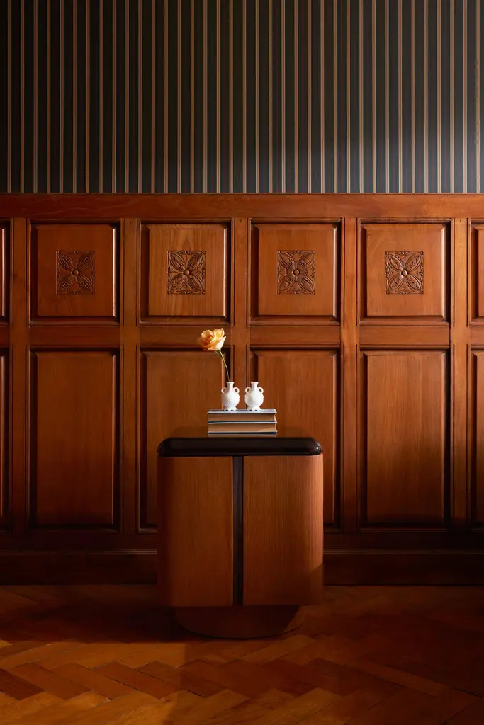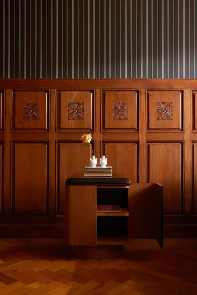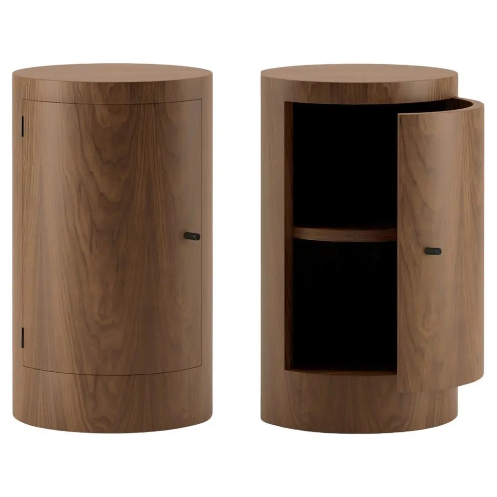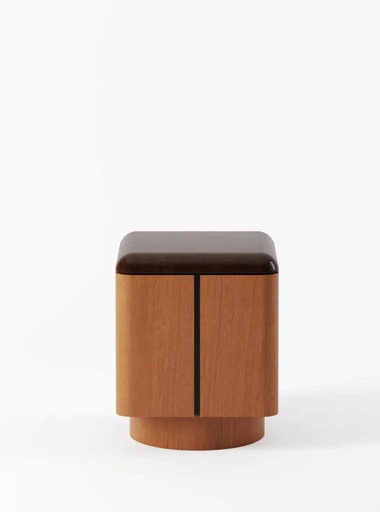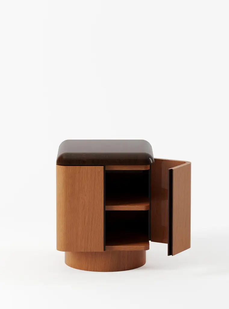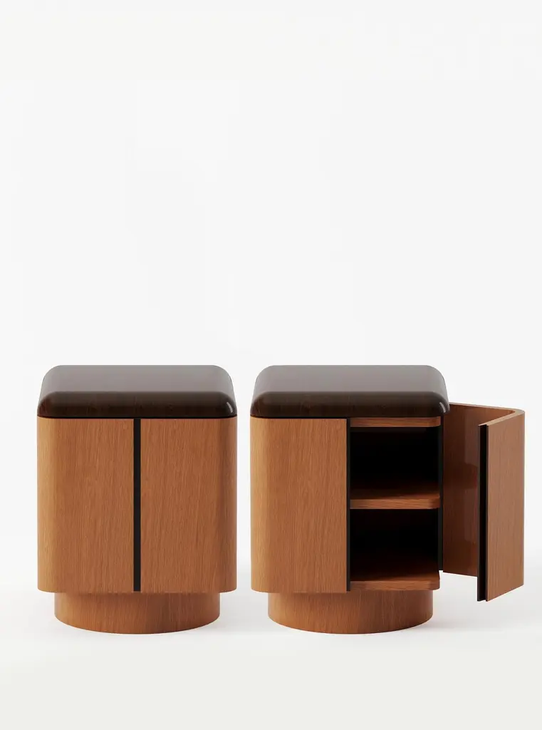 Inspired by his fascination with the aesthetic allure of interiors depicted in films and literature, Yaniv Chen endeavors to capture the essence of captivating spaces. Reflecting upon his formative influences, he recalls the delightful charm of the classic television series "Jeeves & Wooster," set in the extravagant backdrop of the 1920s. It was within the confines of Wooster's apartment that Chen encountered the enchanting allure of art deco design, characterized by the juxtaposition of yellow timbers against meticulously lacquered, high-polished walnuts and mahoganies. With the Various Positions Nightstand, Chen seeks to reinvent this decadence.Please noteSingle opening door (furthest from bed). The rest of the panels are fixed.The Various Positions nightstand combines a 45mm solid walnut top—finished with eight hand-applied lacquer layers—with a warm honey oak veneer body. Each piece is handmade and truly unique, with subtle join lines, tiny dimples, and natural color variations that highlight the character of solid wood. These authentic details are what make every nightstand special.