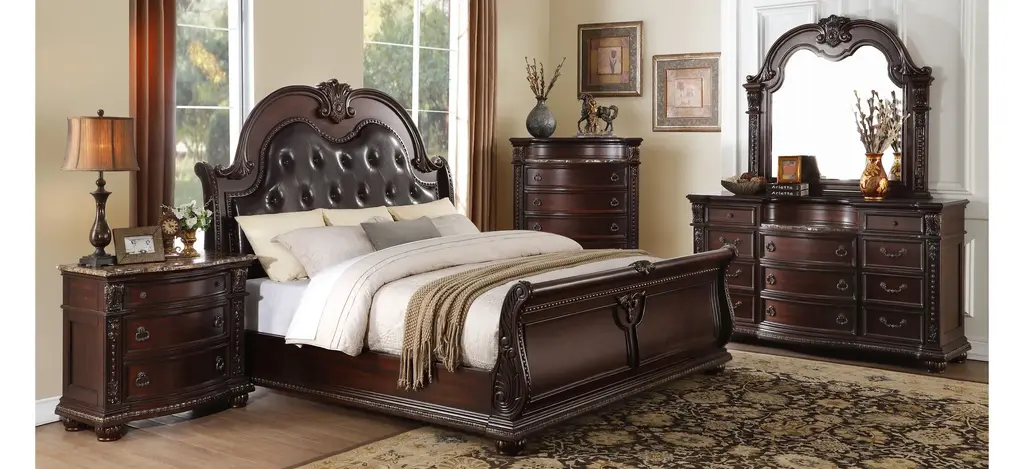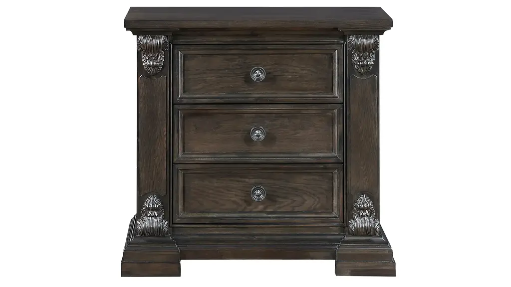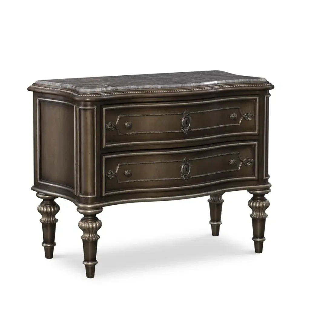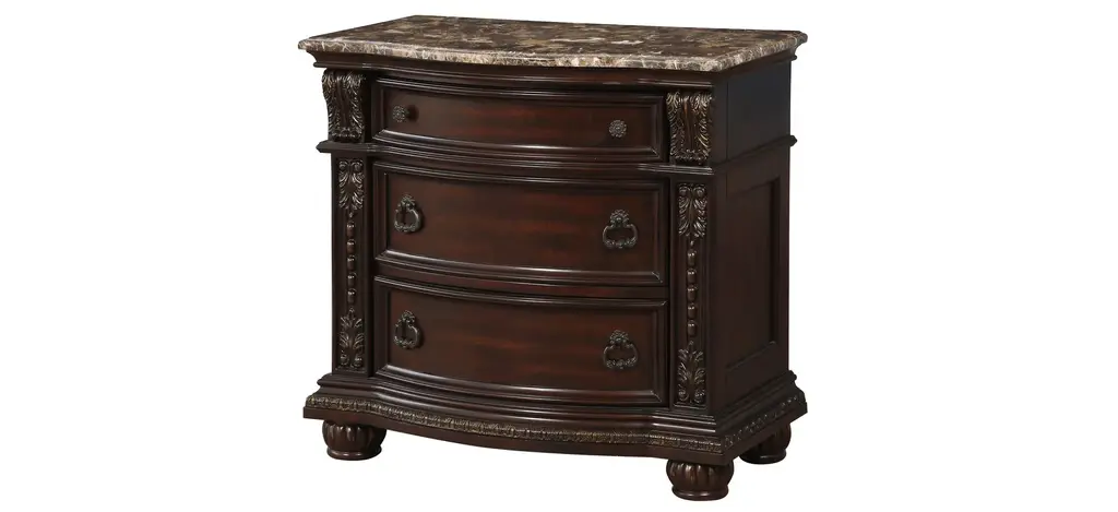 The Palace nightstand exemplifies the finest in old world European design inspiration. Egg and dart base moldings, bead molding, acanthus leaf carvings, and genuine marble inset top blends to achieve an elegant addition for your traditional home. Each of the collection's beautiful detail is accented by the dark cherry finish on birch veneers with gold highlights