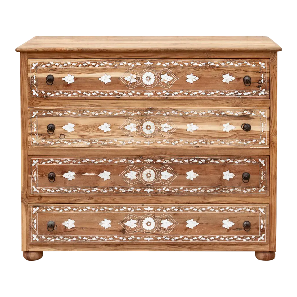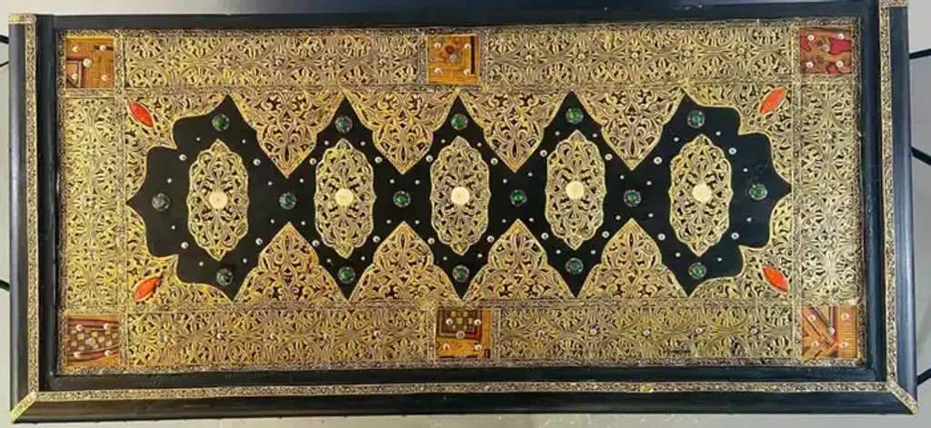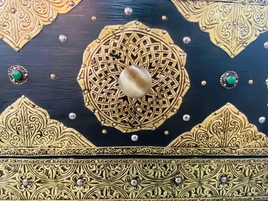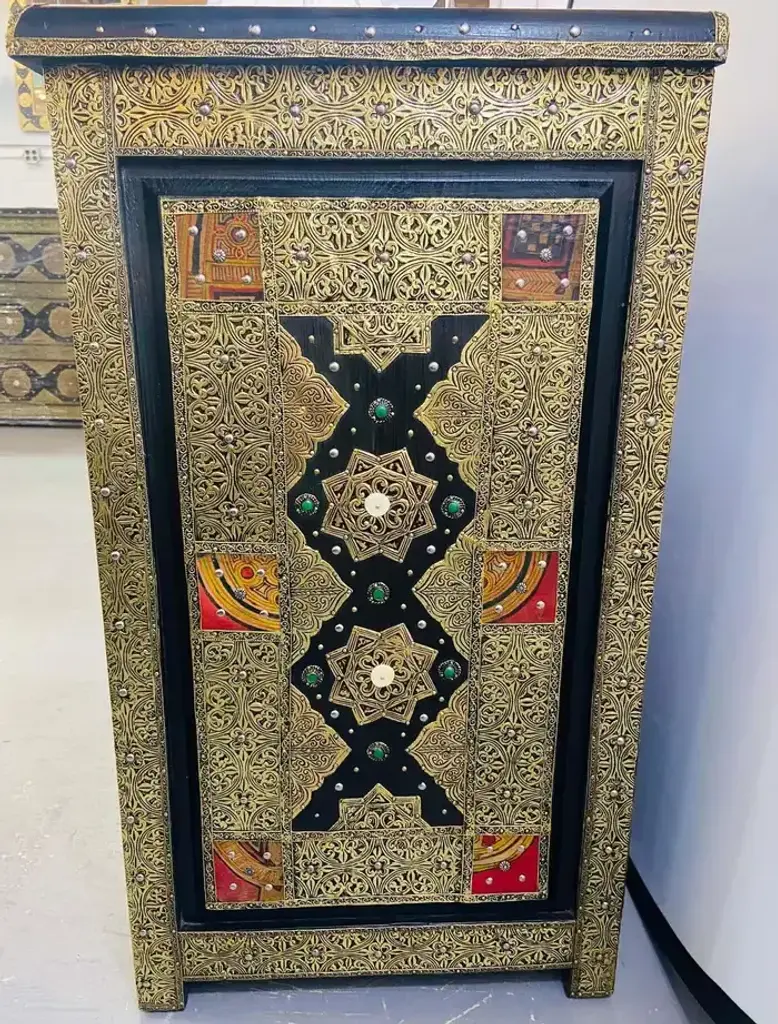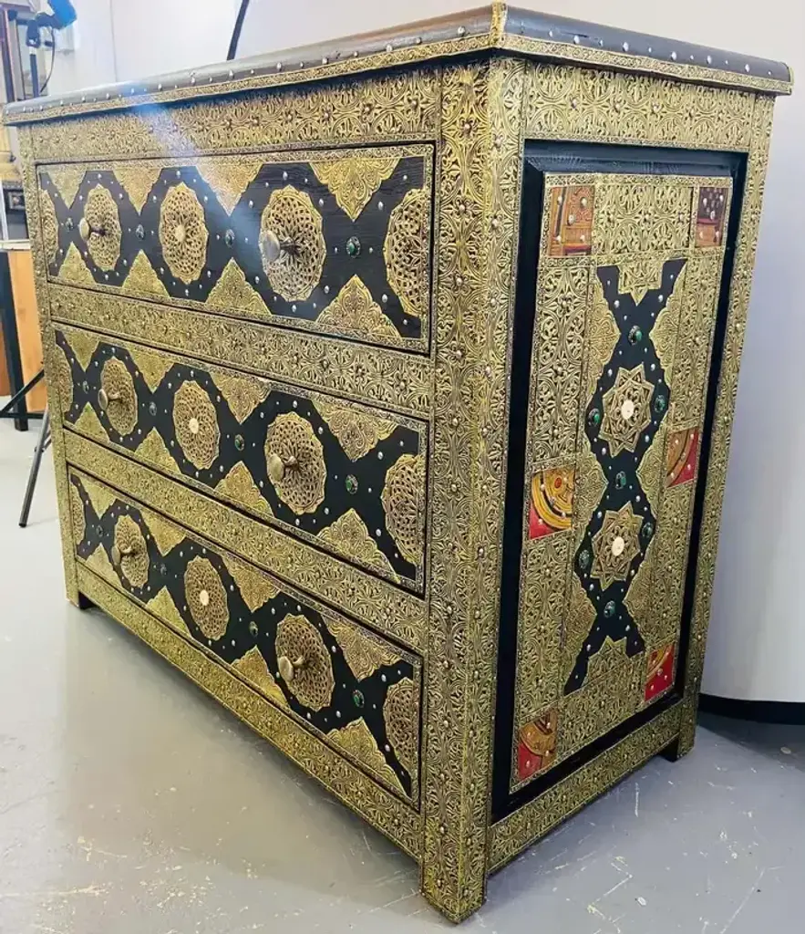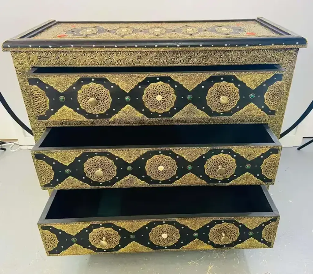A beautiful brass and ebony, natural stone and leather inlaid Hollywood Regency style commode, chest or nightstand. This exceptional chest depicts and compliments the Hollywood Regency era at its finest. The commode features amazing intricate latticework on silver-toned metal and brass and ornate with Green stones and leather pieces. The palatial Hollywood Regency inspired Moroccan style commode offers three drawers decorated with brass embossed round handles. Dimensions: 40.5" W x 33.5" H x 18.5" D
