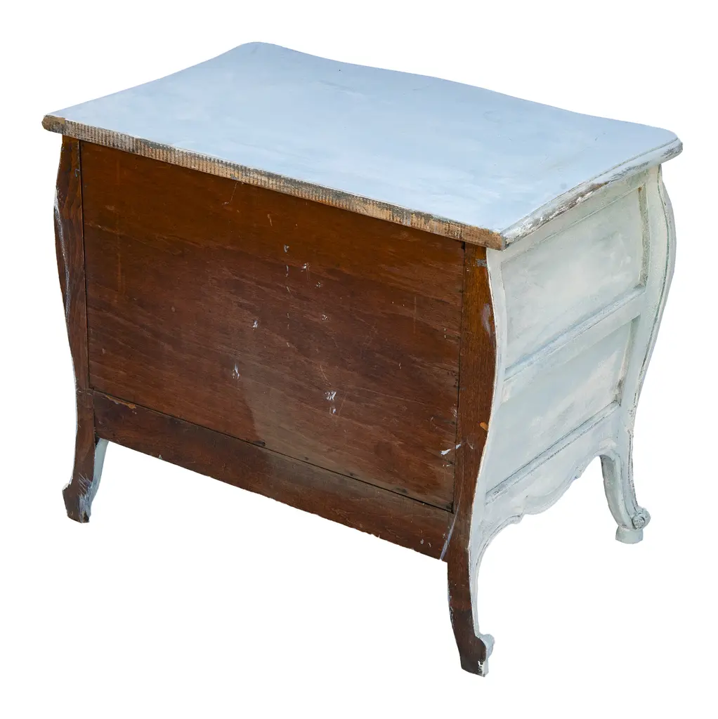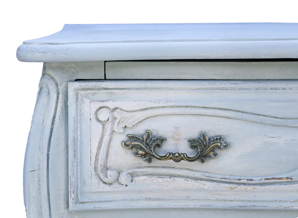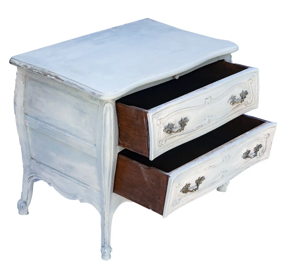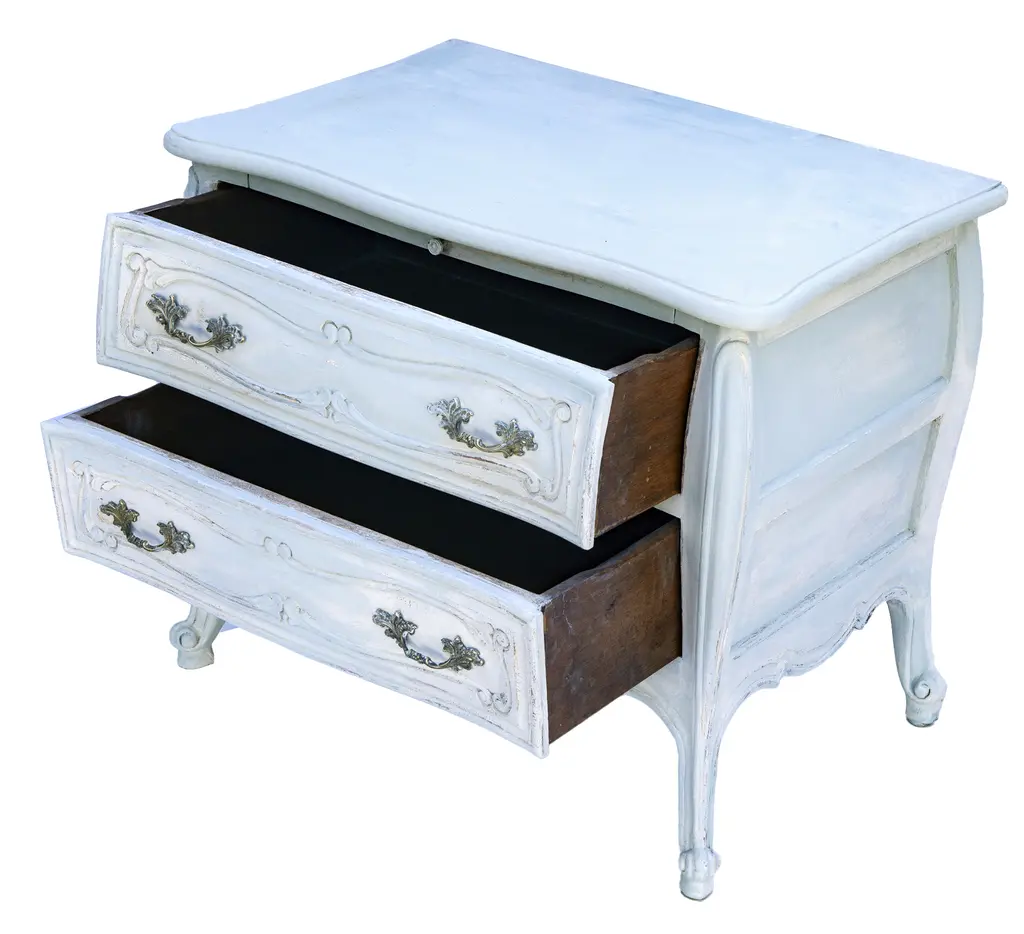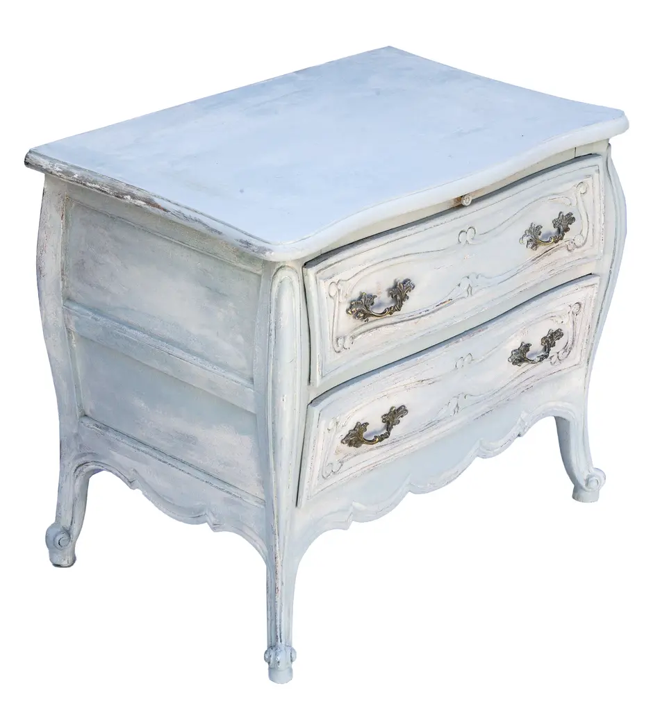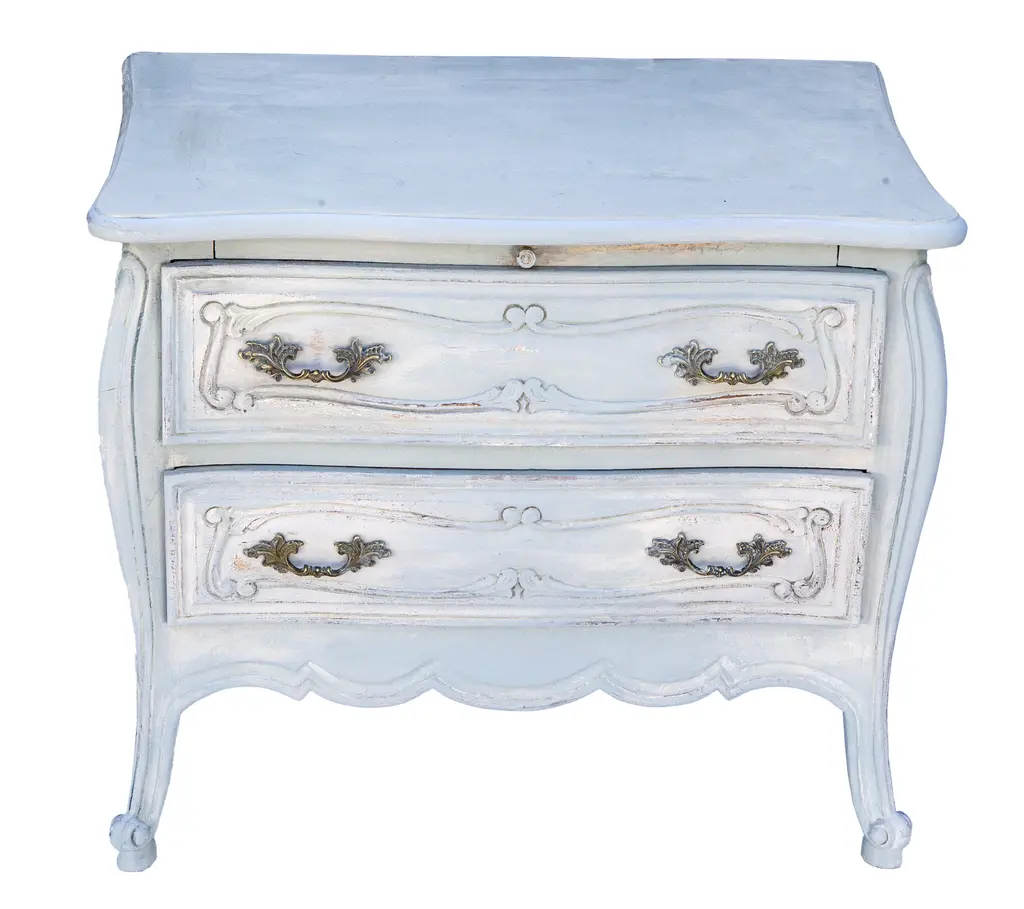 Pale blue French provincial commode/ nightstand with built-in tray & two spacious drawers. Well made piece with dovetail construction. The finish has been hand painted in multiple shades of light blues & whites. The tray has been left in a natural wood finish. Textured finish on the body with a smooth finish on the top. Provincial hardware in brass.