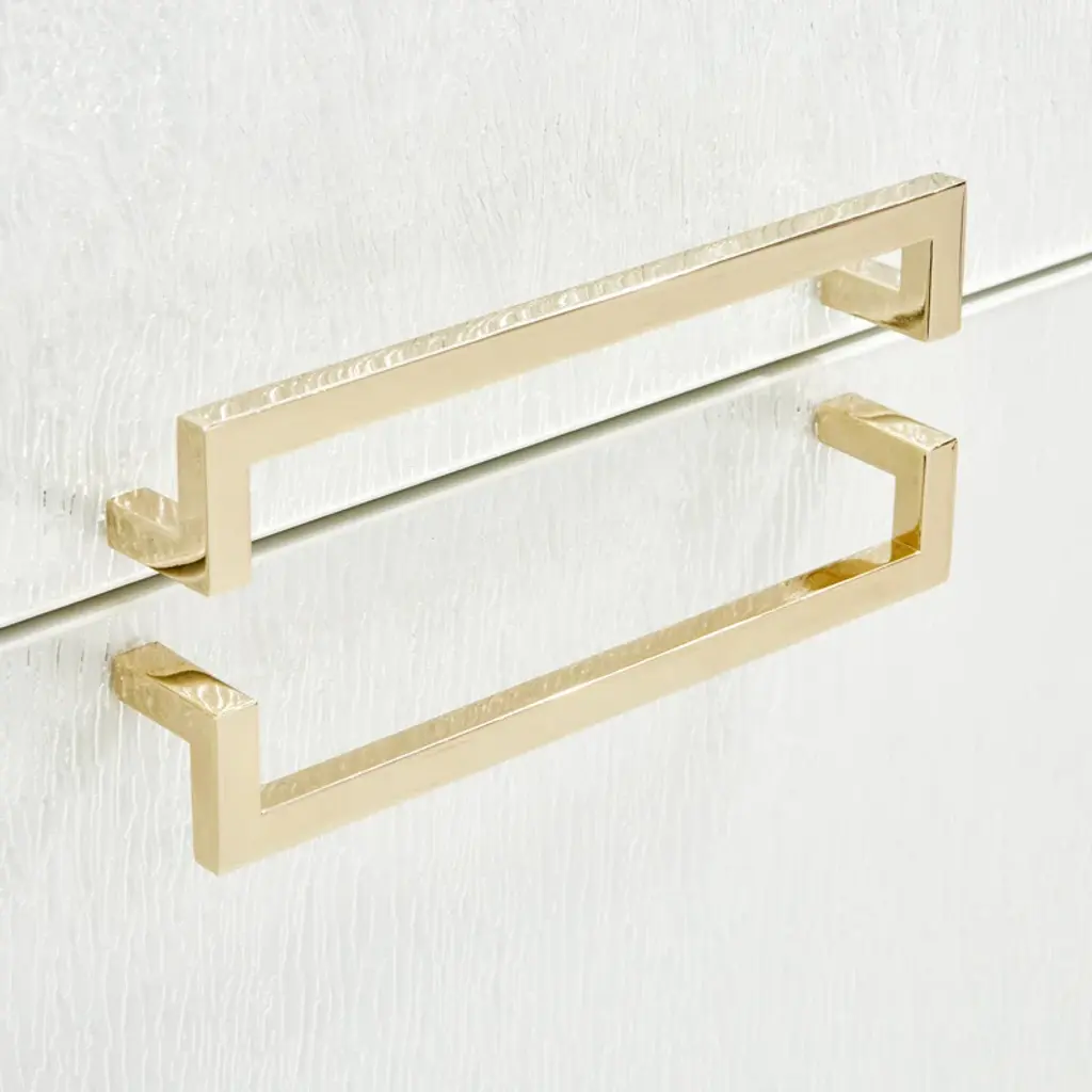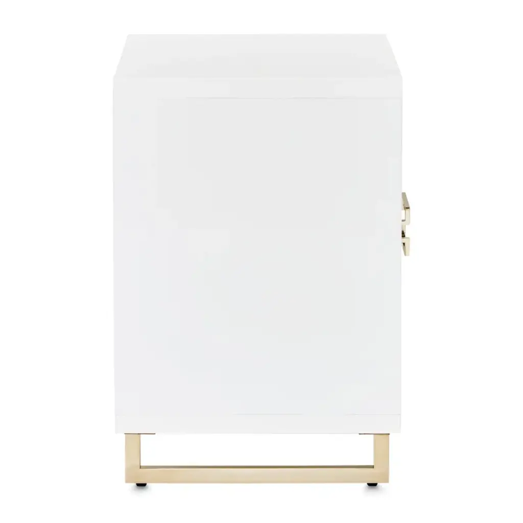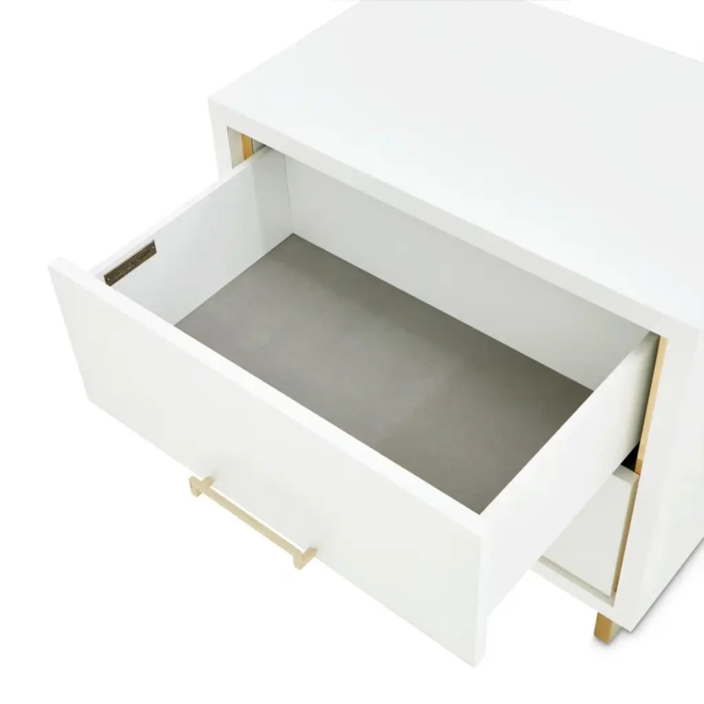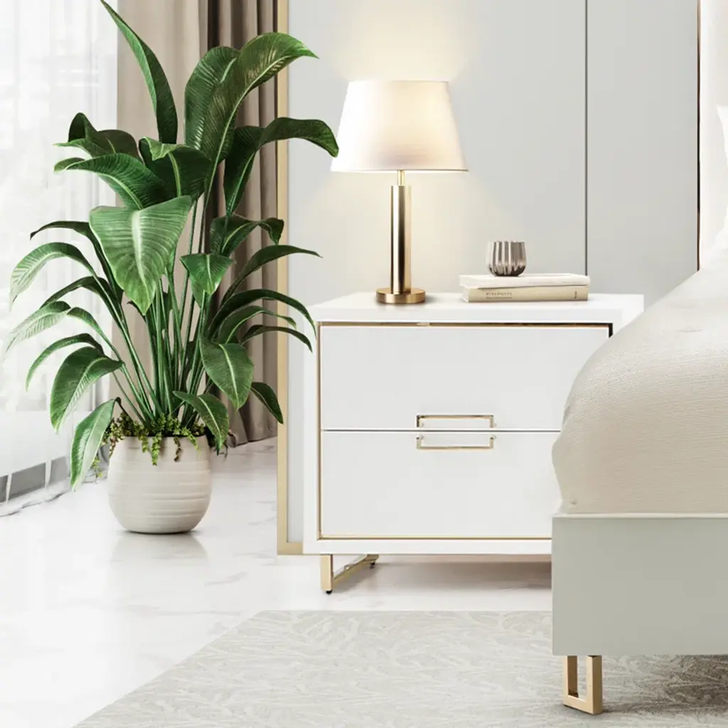 Our Palm Gate nightstand blends functionality and elegance. With gold accents, thoughtfully placed handles, and two velvet-lined drawers housed within a pristine acrylic body, it's a stylish addition to any bedside.