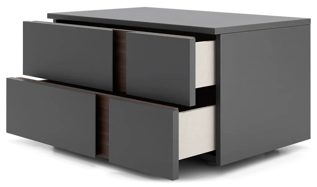 The Italian-made Park two-drawer nightstand is visually captivating, playing with depth and shadow through its elegant cabinet design. The nightstand sits alongside a bed in a set of defining geometric shapes. A wide table-top creates the ideal surface for reading material, lamps, and personal accessories. The drawer faces produce a sharp geometric design heightened by a recessed walnut finish. Its drawers slide out and retract automatically in a seamless gliding motion that underlines its charm. Interior of drawers elegantly lined in linenboard for a refined touch. Left or right handle orientation options. Complementary dresser available.