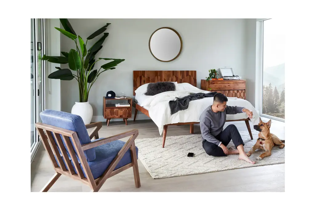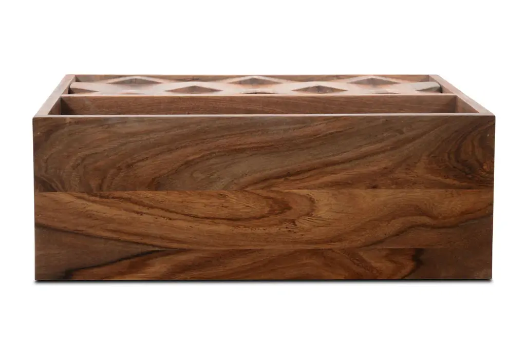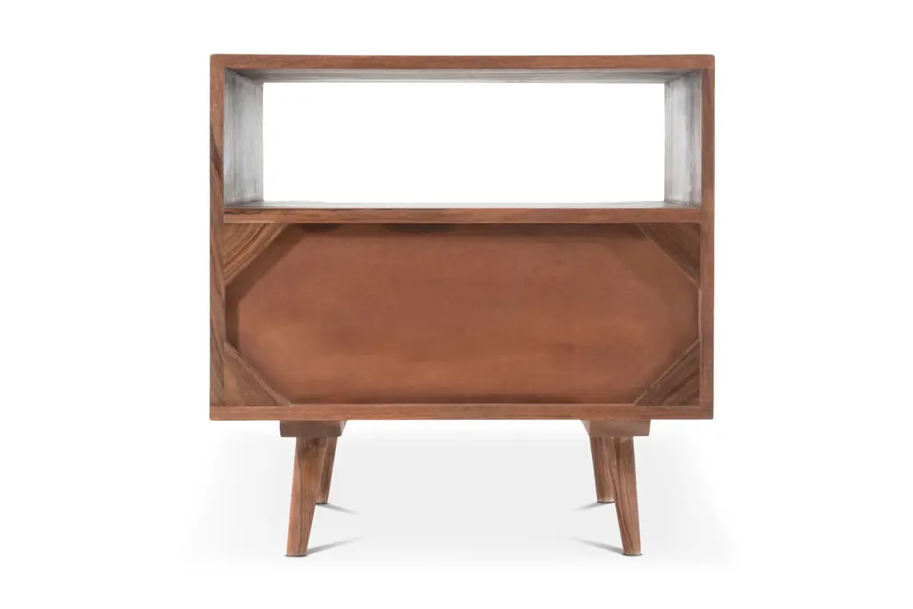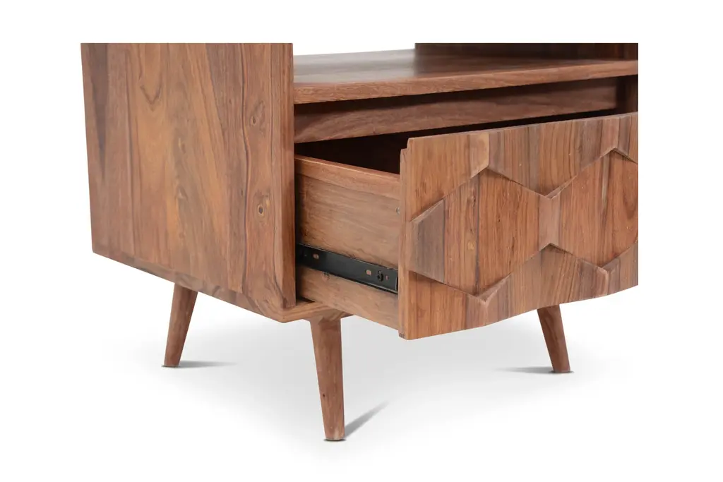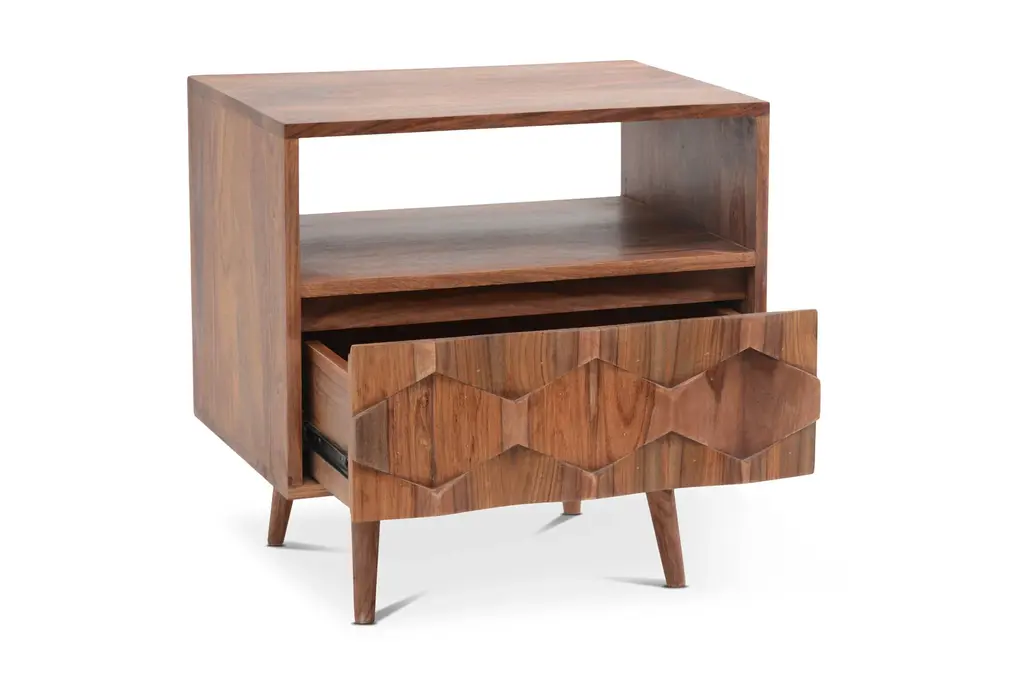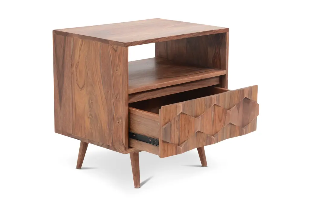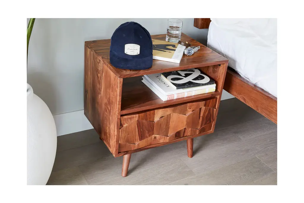 Made from solid Sheesham wood with a warm finish, the Pasadena Nightstand brings a Mid-Century modern vibe to contemporary bedrooms with its slim, angular legs and an intricately carved drawer front. A single storage drawer is spacious enough for all of your nighttime essentials and slides easily on metal ball bearing drawer glides. The open compartment above is great for a reading materials.