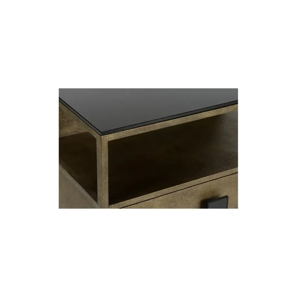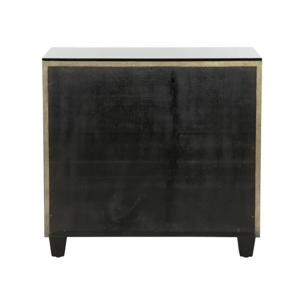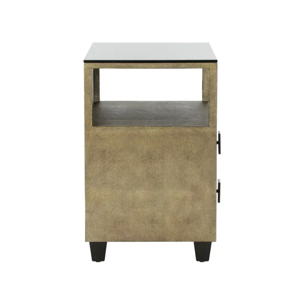 The Pendry Nightstand brings modern intrigue to your bedside. Finely crafted with a smokey glass top to protect gray faux shagreen and finished off with square black glass knobs. Provides plenty of storage with a shelf and two soft close drawers. Designed by Kristi Nelson.