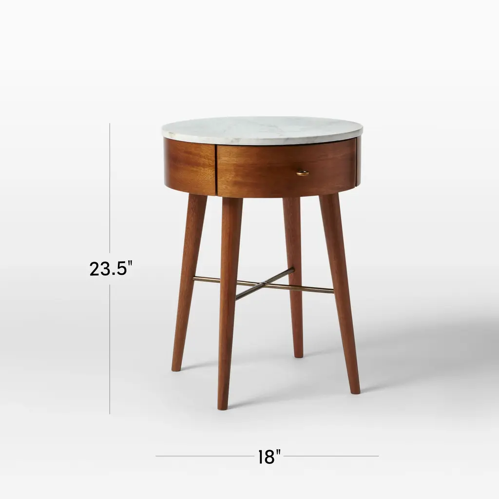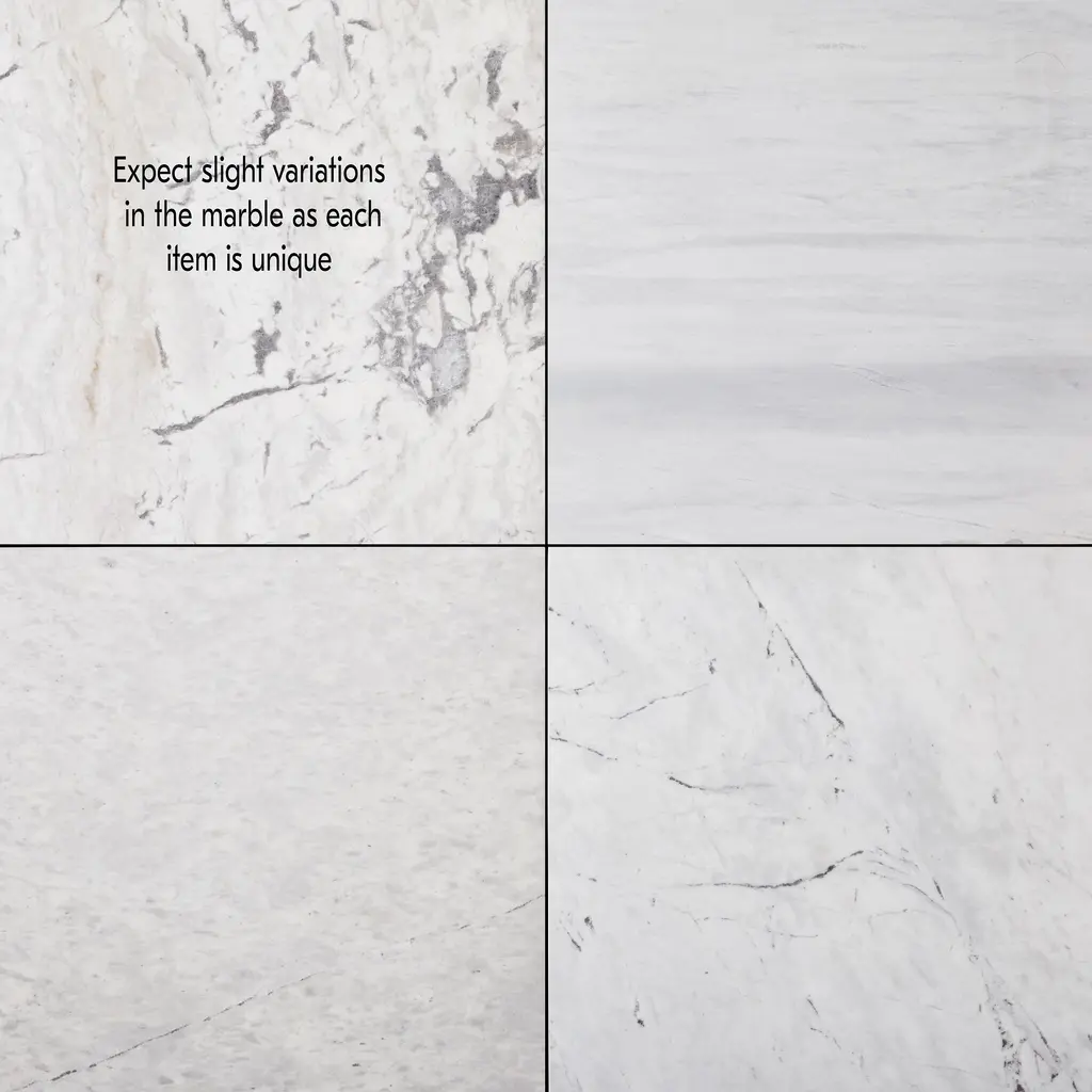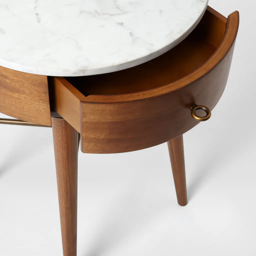 Its uniquely rounded shape & slim legs. Topped in beautiful white marble. The wood used is sustainably sourced. Crafted in a Fair Trade™ factory.